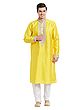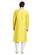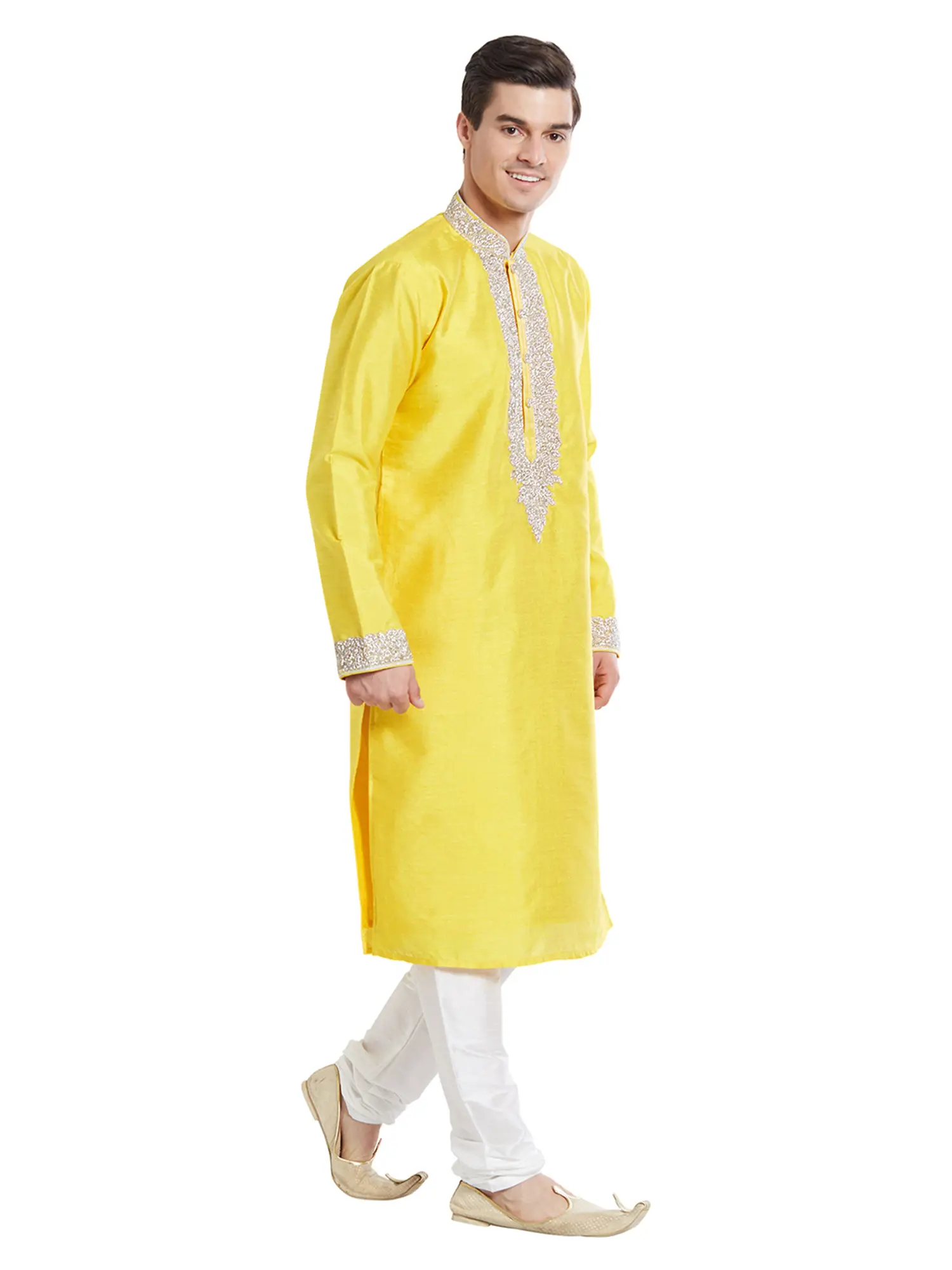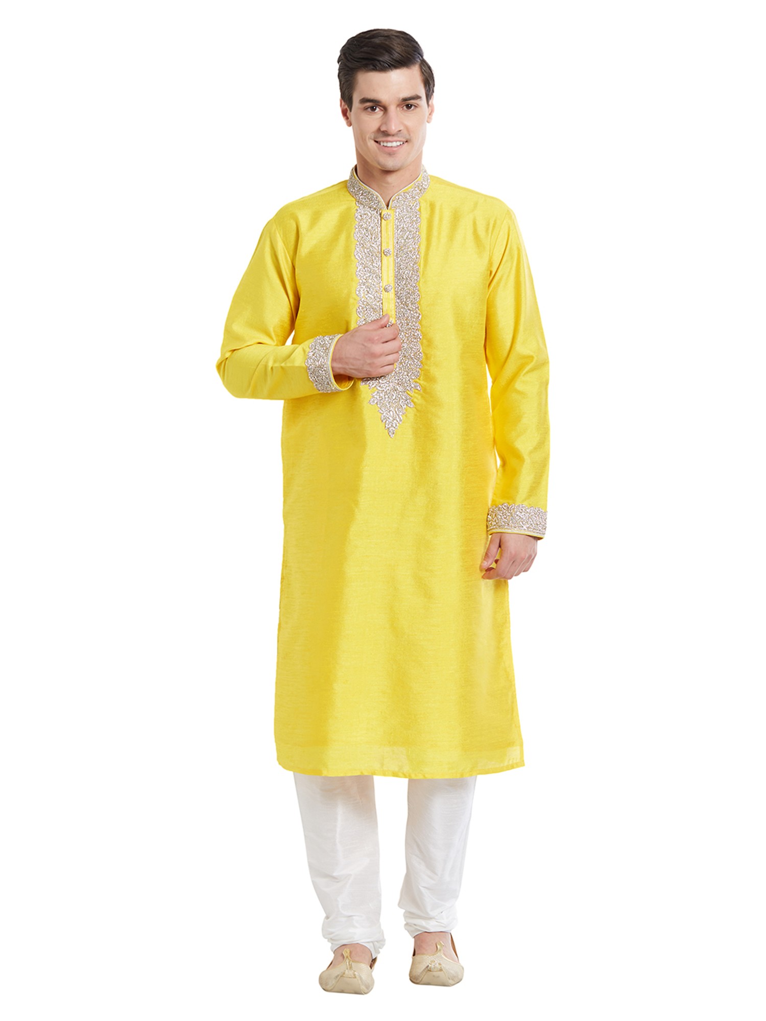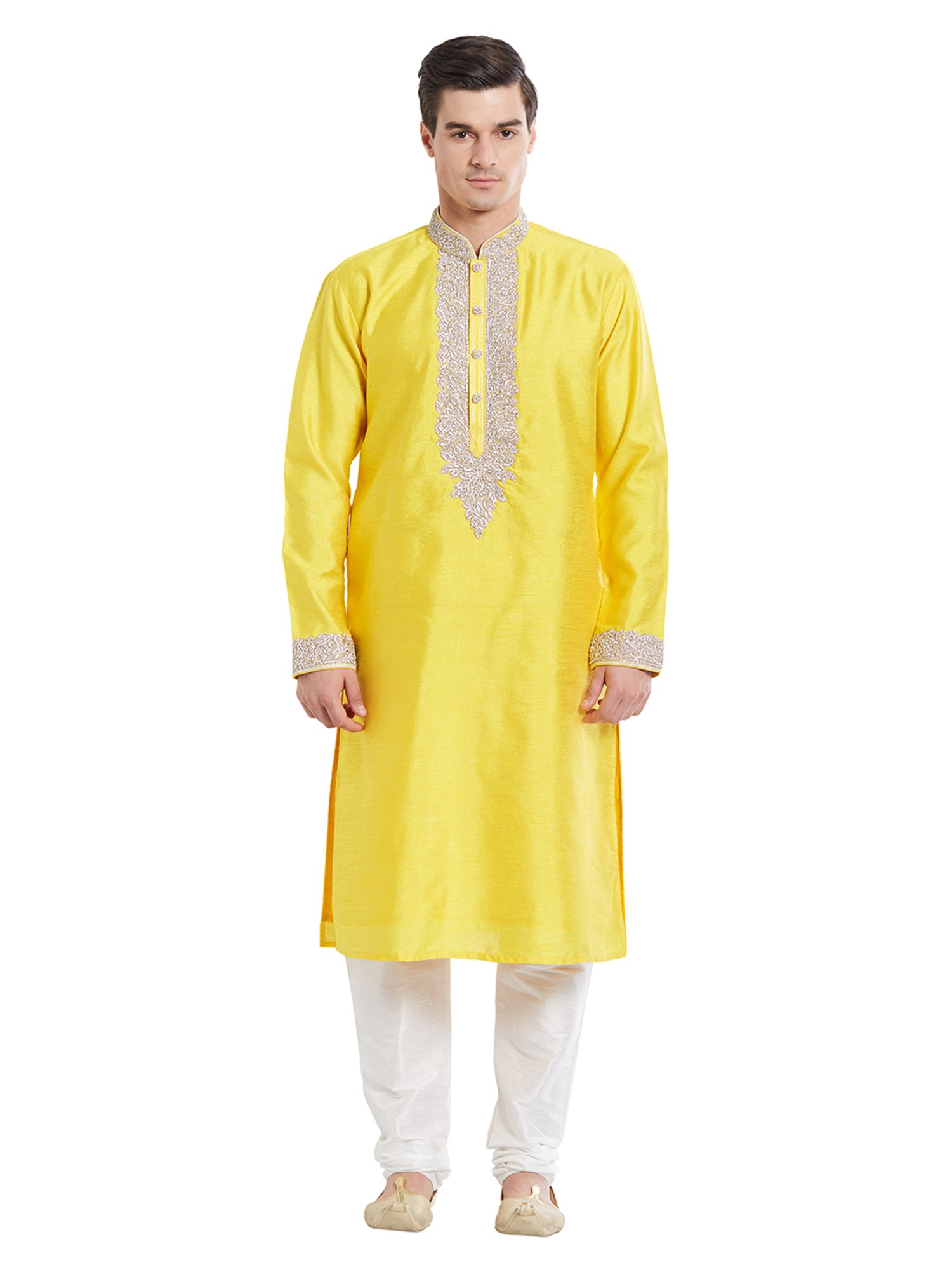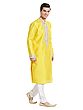 Features a vibrant yellow art silk kurta adorned with detailed silver thread embroidery on the neckline and cuffs.