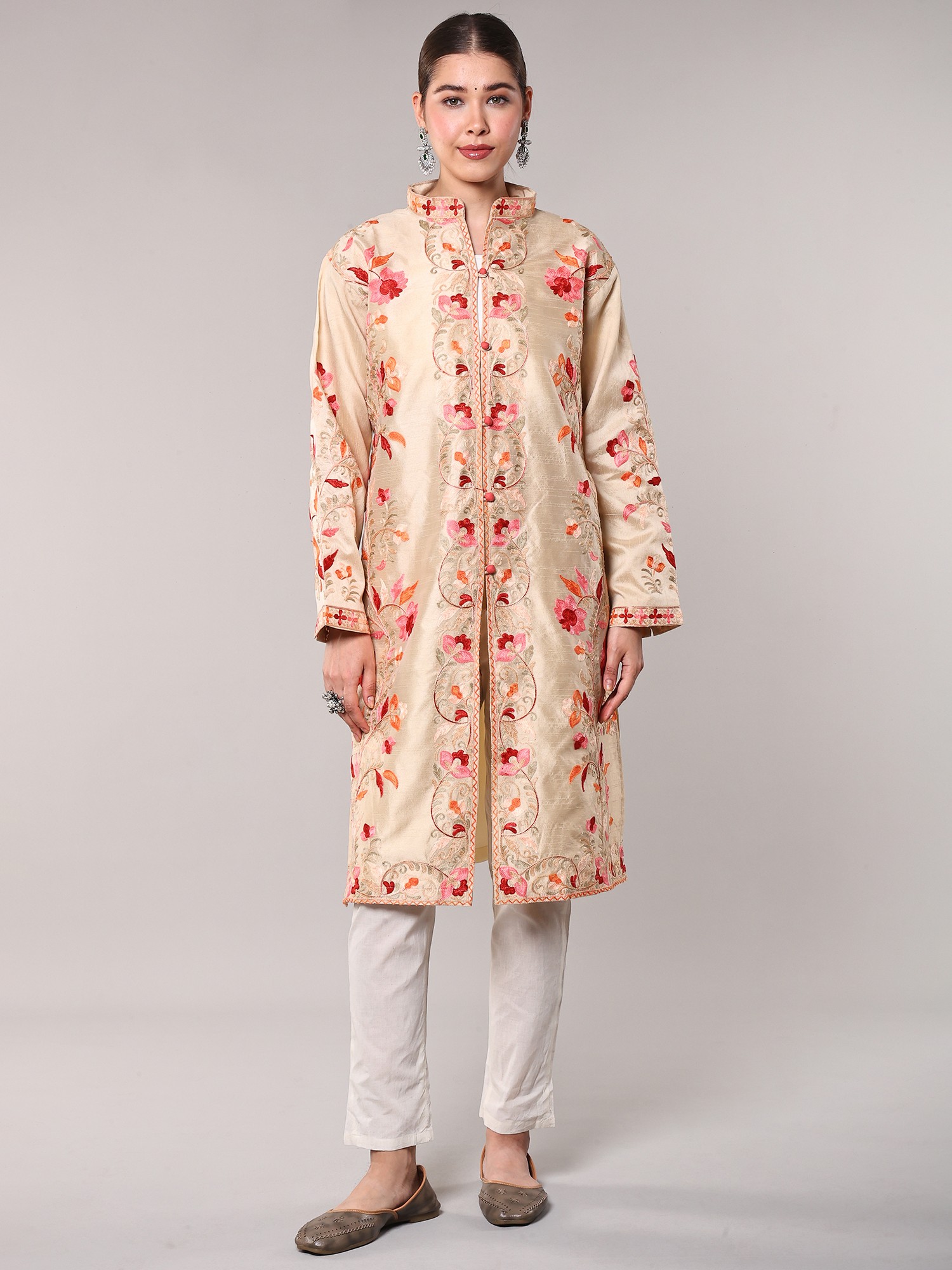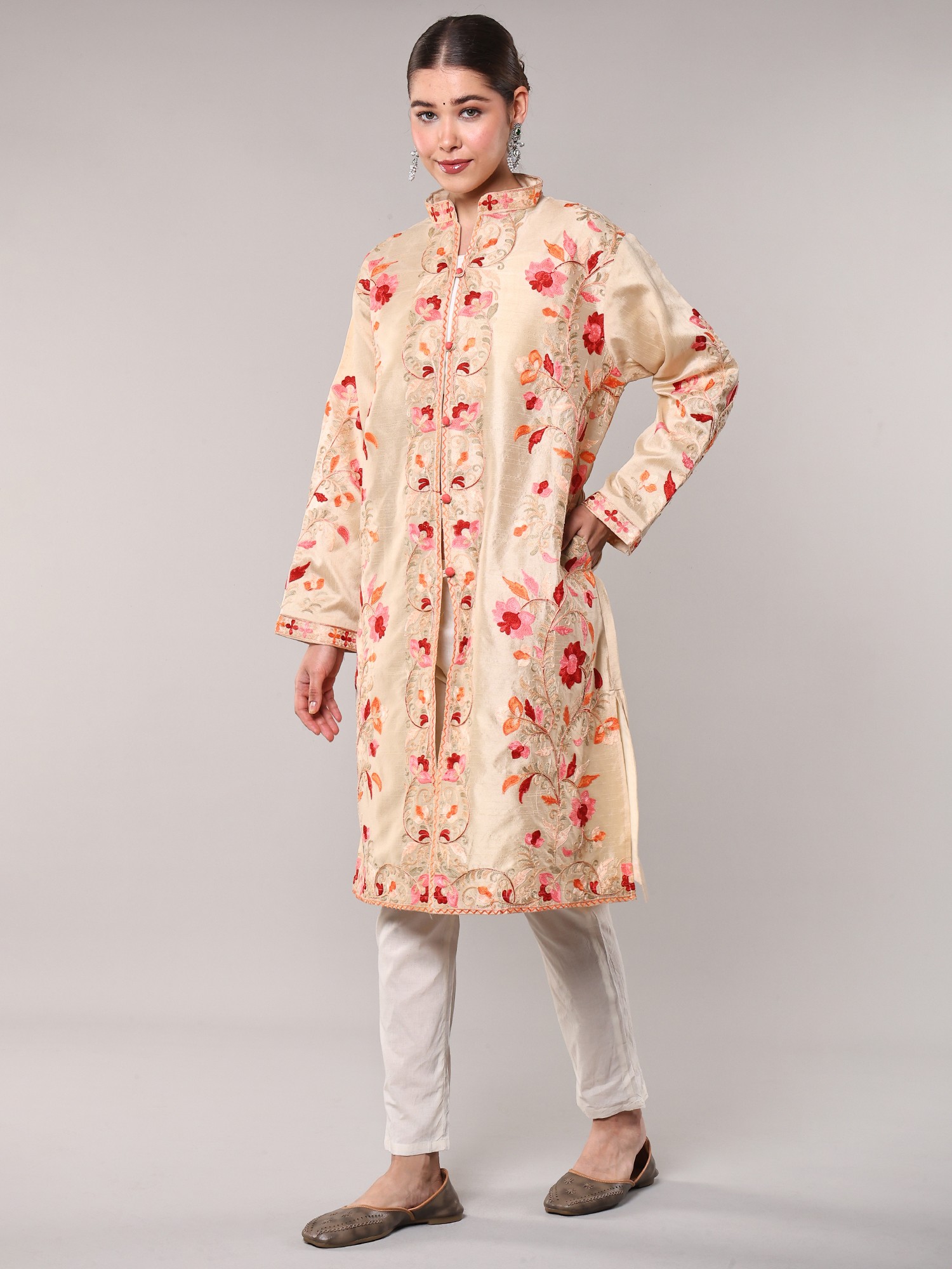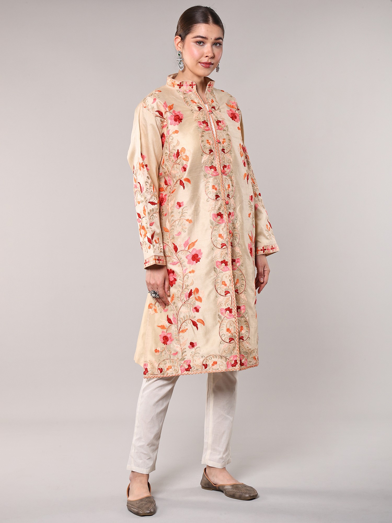Irish-Cream Wool Long Jacket with All-Over Aari Embroidered Floral Vines and and Side Pockets