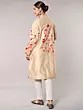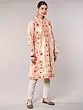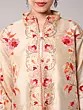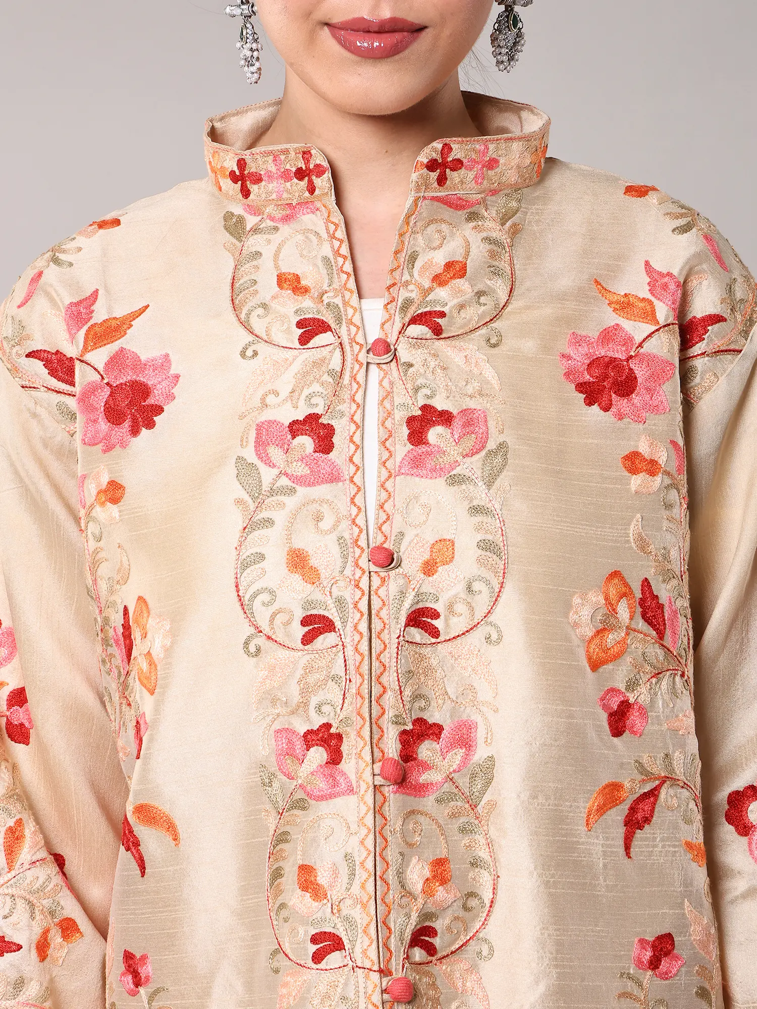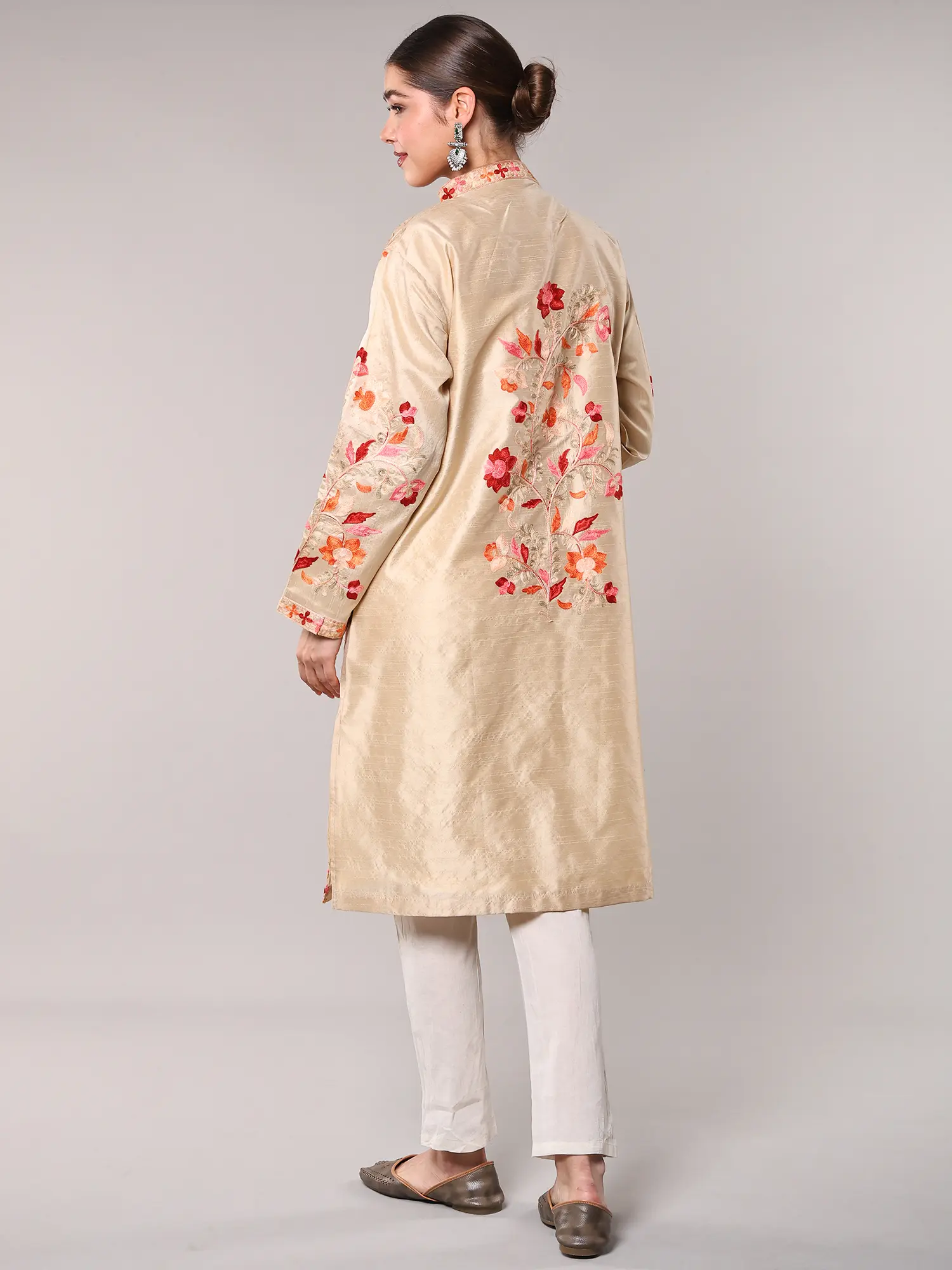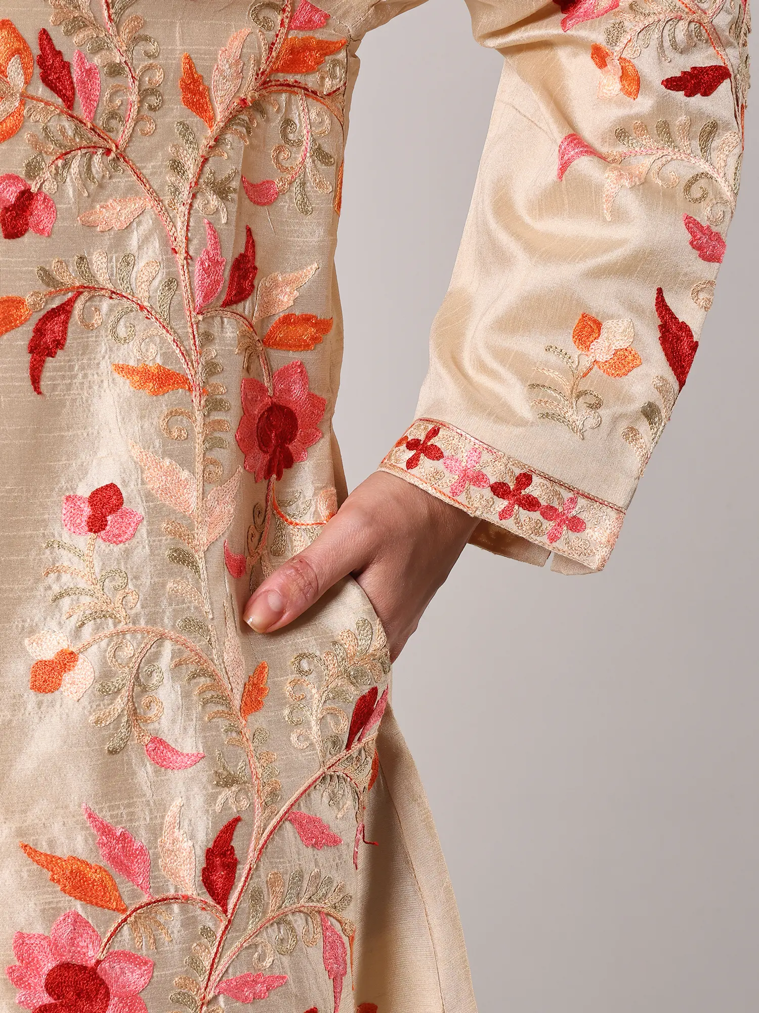 Irish-Cream Wool Long Jacket with All-Over Aari Embroidered Floral Vines and and Side Pockets