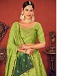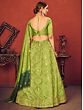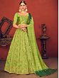 Experience the auspicious beauty of green or Harita with this designer art silk lehenga choli. Covered in green- a fortunate color in traditional Indian fashion, the lehenga exudes a classic charm, elevated by the subtle threadwork on the choli and fish scale pattern on the length of the lehenga, embellished with sparkling sequins.