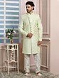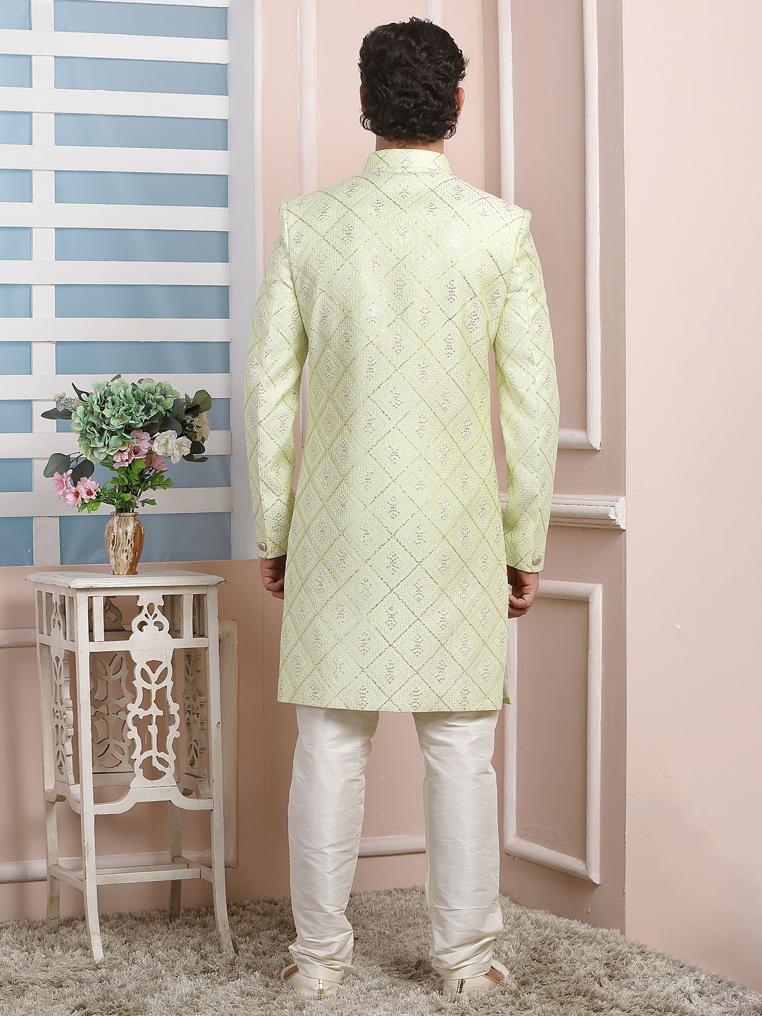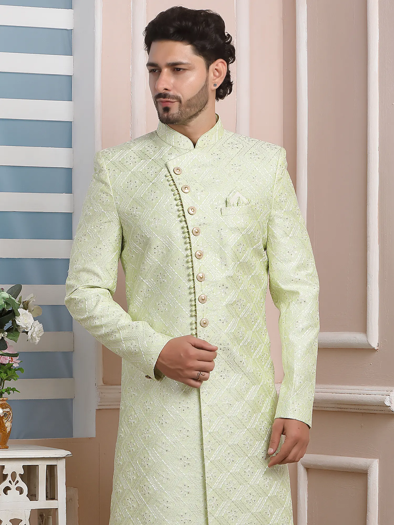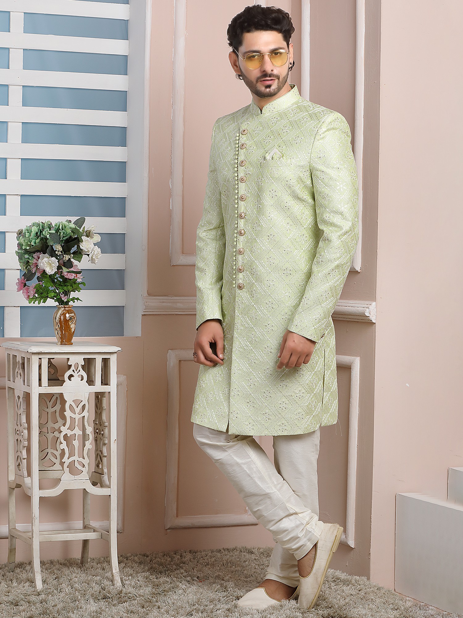 Imported Jacquard Silk Indo Western Sherwani With Dupion Art Silk Aligarhi Pant For Wedding Groom Men