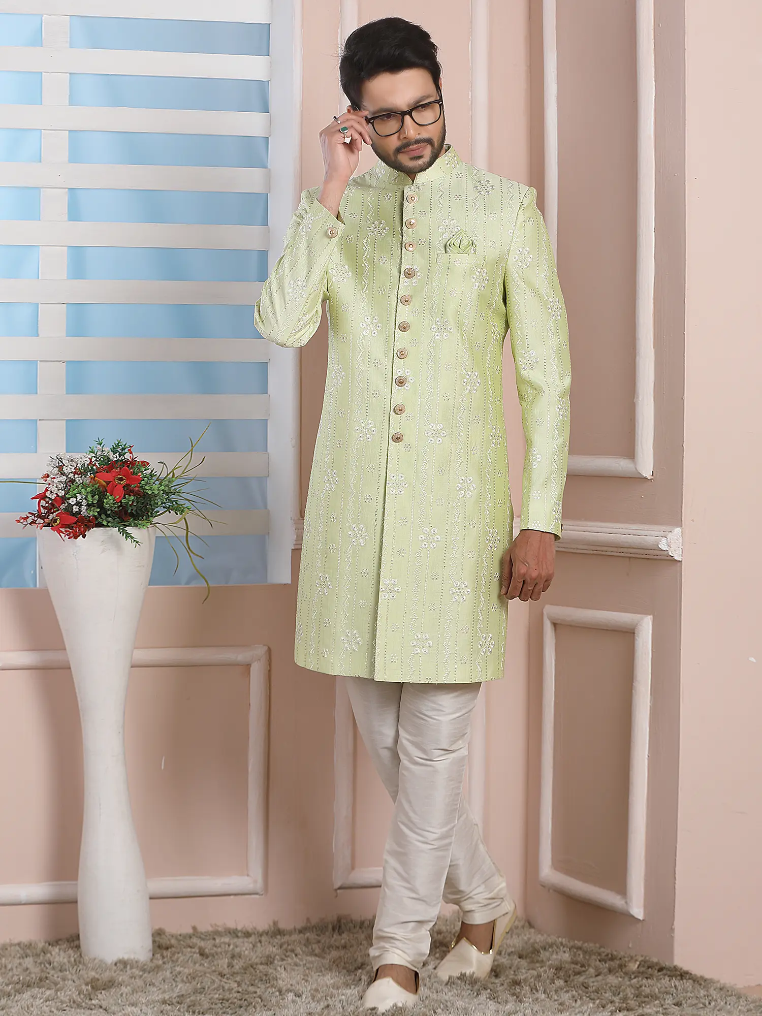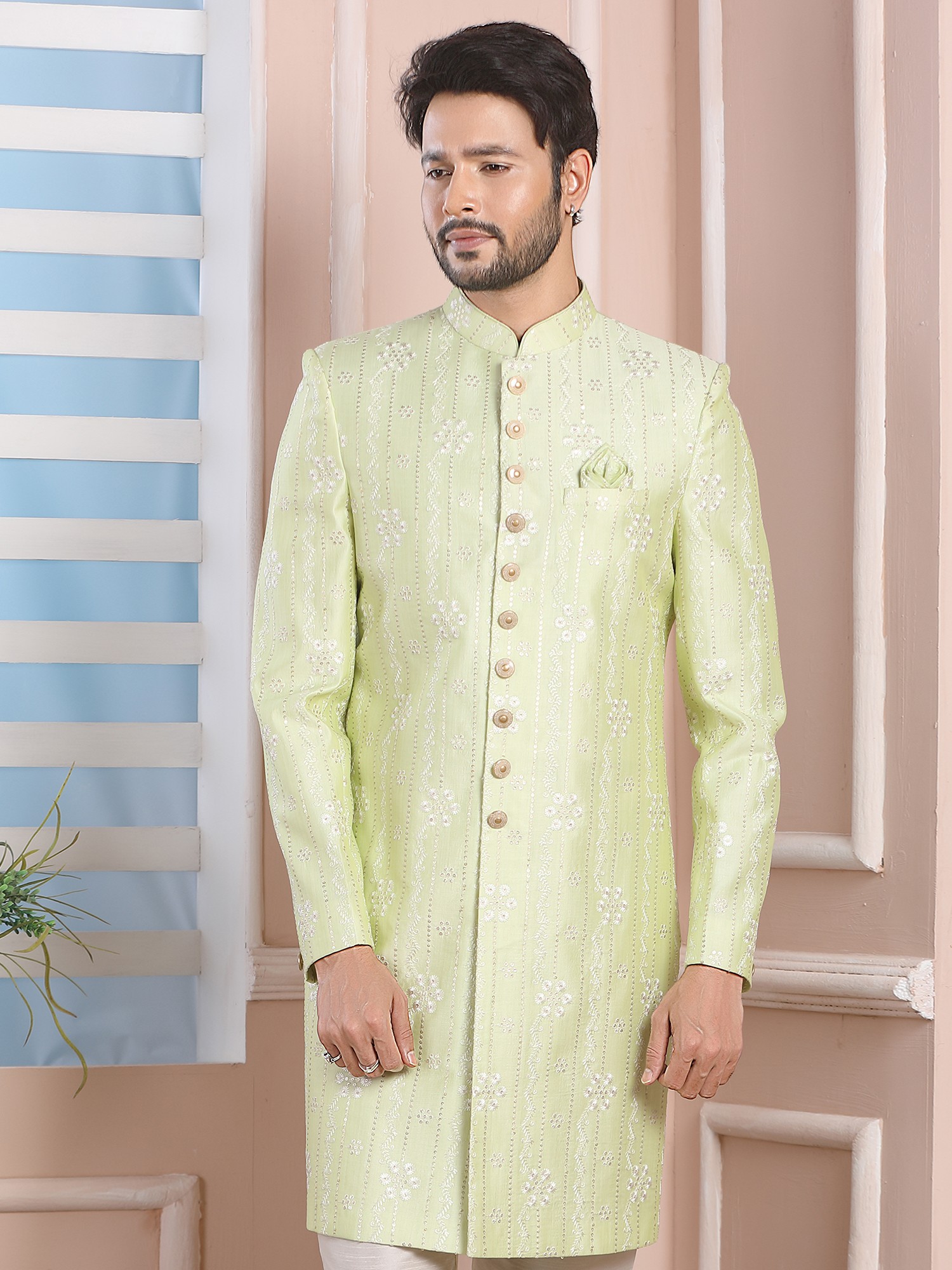 Imported Jacquard Silk Indo Western Sherwani With Dupion Art Silk Aligarhi Pant For Wedding Groom Men