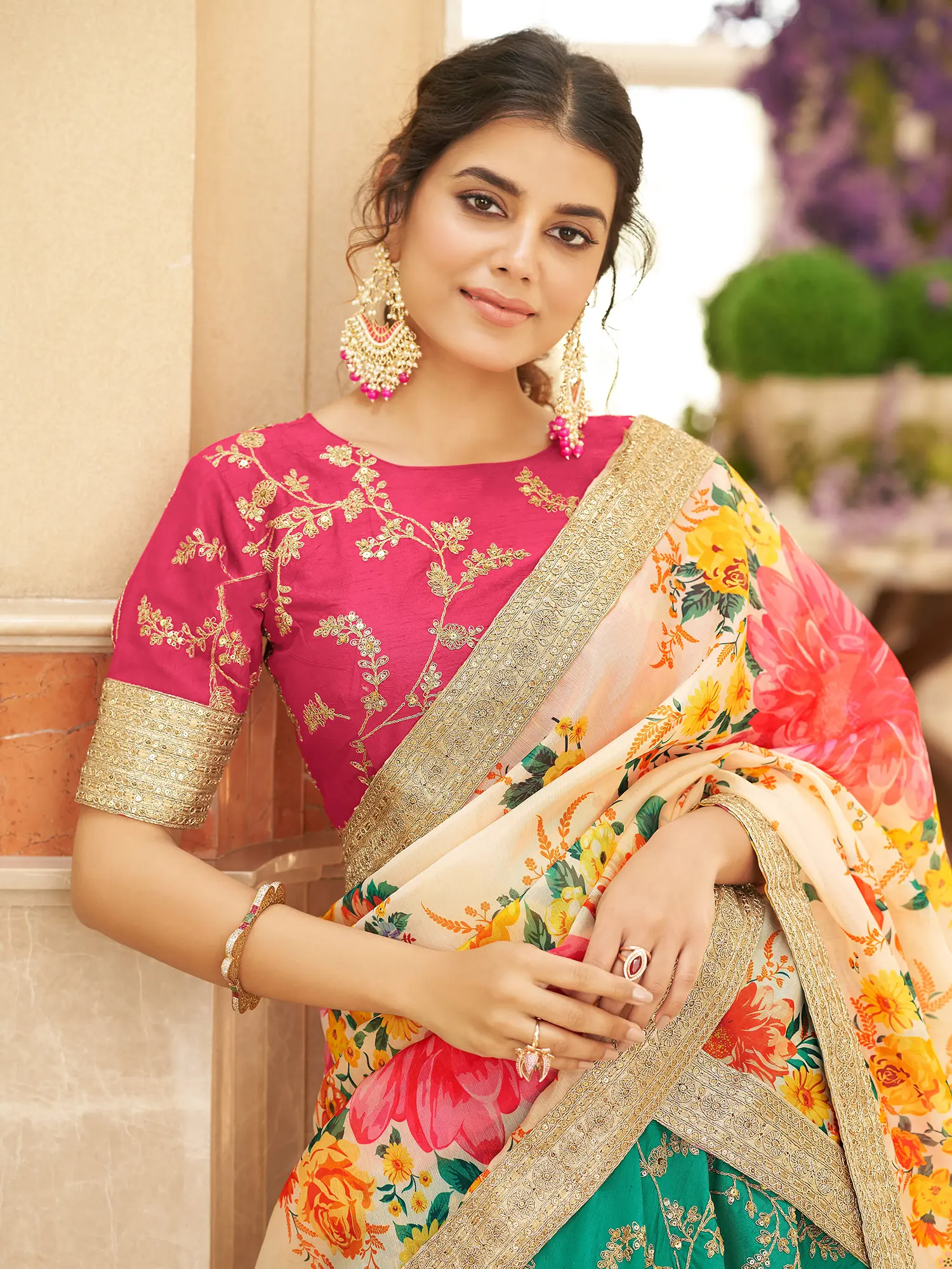Embrace the allure of traditional Indian craftsmanship with this exquisite Lehenga Choli set, a masterpiece designed to make you shine at any festive occasion. Crafted from luxurious Art Silk, this ensemble offers a rich drape and a subtle sheen, ensuring you feel as regal as you look. The vibrant emerald green of the lehenga skirt provides a stunning canvas for intricate golden Zari and thread embroidery, depicting delicate floral motifs that cascade elegantly across the fabric. Each stitch is a testament to meticulous artistry, creating a piece that is both timeless and captivating. The accompanying choli is presented in a striking fuchsia pink, a bold yet complementary color that enhances the overall vibrancy of the outfit. The choli features similar Zari and thread-sequins embroidery, mirroring the detailing on the lehenga and creating a harmonious and cohesive design. The short sleeves are adorned with a delicate border, adding a touch of refined sophistication. This thoughtful detailing ensures that every aspect of the ensemble is curated for maximum impact. Completing this breathtaking set is a flowing Organza dupatta, a diaphanous layer adorned with a vibrant floral print. The soft, sheer fabric of the dupatta creates a beautiful contrast with the heavier silk of the lehenga and choli, adding an ethereal grace to your silhouette. The colorful blossoms scattered across the cream base of the dupatta are a celebration of nature's beauty, injecting a burst of joy and color. A delicate golden border frames the dupatta, tying the entire look together with a flourish of opulence and tradition. This Lehenga Choli set is more than just an outfit; it's an experience. It’s the perfect choice for weddings, festivals, and any celebration where you want to make a memorable impression. The combination of rich fabric, intricate embroidery, and a captivating floral print creates a look that is both classic and contemporary, ensuring you are the center of attention.