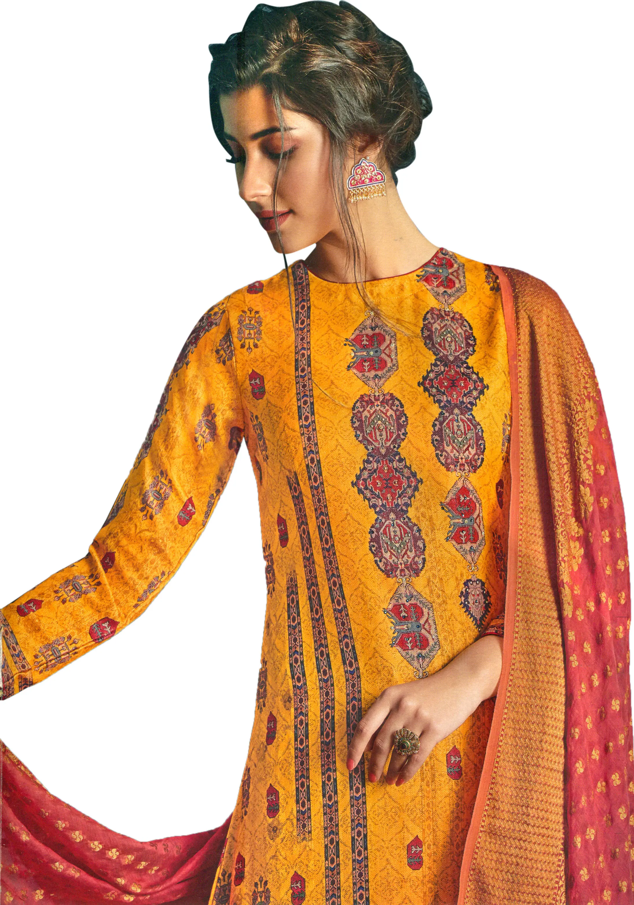 Discover a masterpiece of traditional Indian craftsmanship infused with contemporary style. This exquisite ensemble is designed to make a statement, blending the comfort of flowing palazzo pants with the regal charm of a long, printed kameez. Crafted from a premium PolyWool fabric, this suit offers a delightful texture that drapes beautifully, ensuring both comfort and a sophisticated silhouette. The base color, a rich and warm gold, serves as a perfect canvas for the intricate and vibrant multicolor motifs that adorn the entire garment.