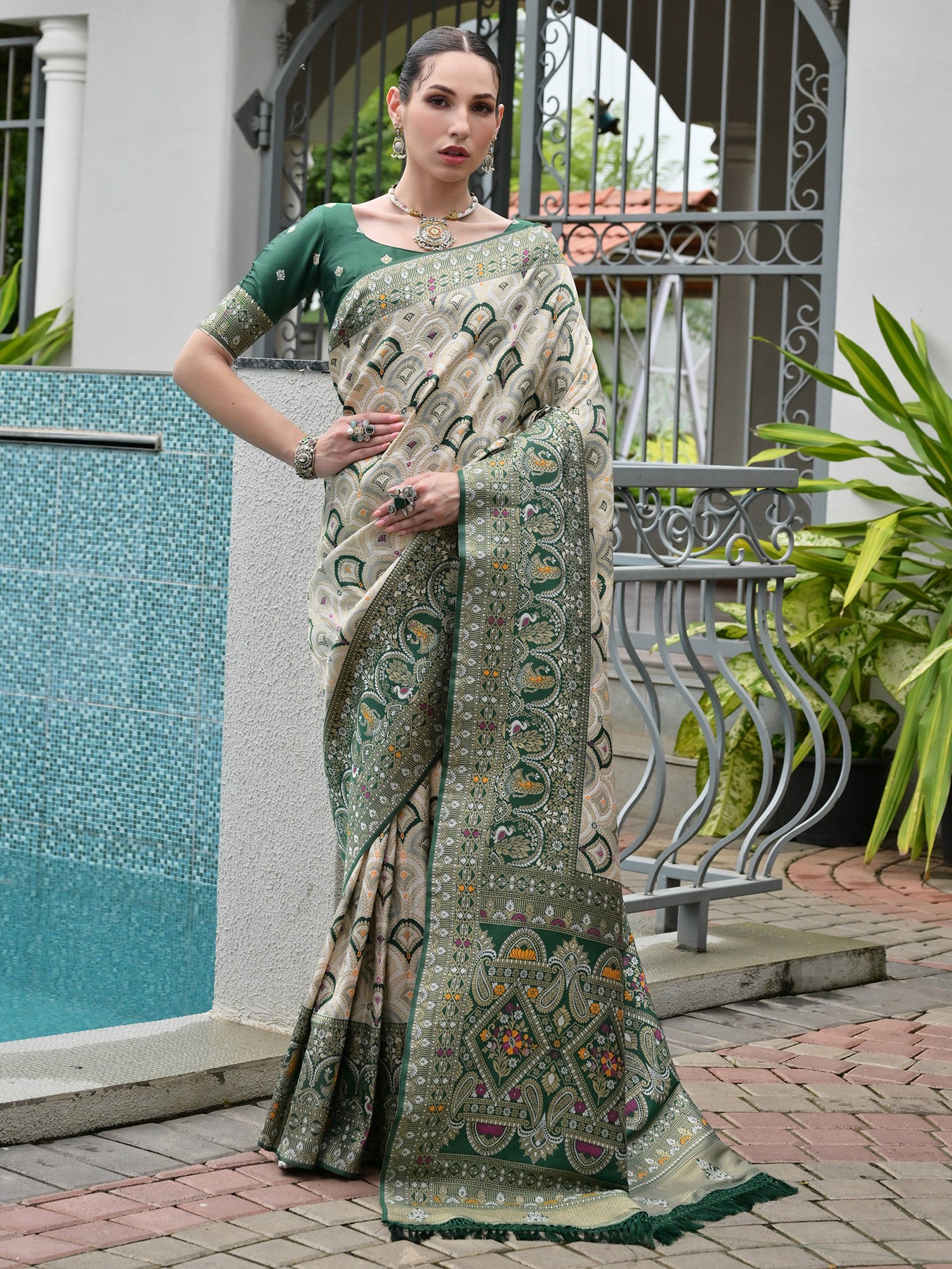 Embrace timeless elegance with this exquisite Banarasi silk saree, a true testament to the artistry of Indian textile traditions. Woven from the finest silk, this saree drapes beautifully, offering a luxurious feel and a subtle sheen that captures the light with every movement. The base of the saree features a delicate, neutral tone, creating a sophisticated canvas for the intricate woven motifs that adorn it. This thoughtful color choice ensures versatility, allowing the rich detailing to truly shine and making it a perfect choice for a wide array of occasions.