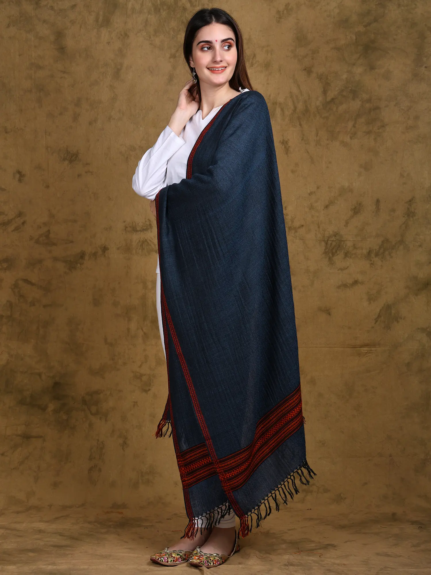 This versatile stole complements a variety of styles and occasions. Dress it up with a formal outfit for a touch of understated elegance, or dress it down with jeans and a simple top for a relaxed yet stylish look. Its rich color and intricate border make it suitable for both daytime and evening wear. It’s the perfect accessory to add a pop of color and texture to your wardrobe, effortlessly elevating any ensemble. Bring a piece of the Kullu Valley’s cultural heritage into your life with this beautiful and functional stole.