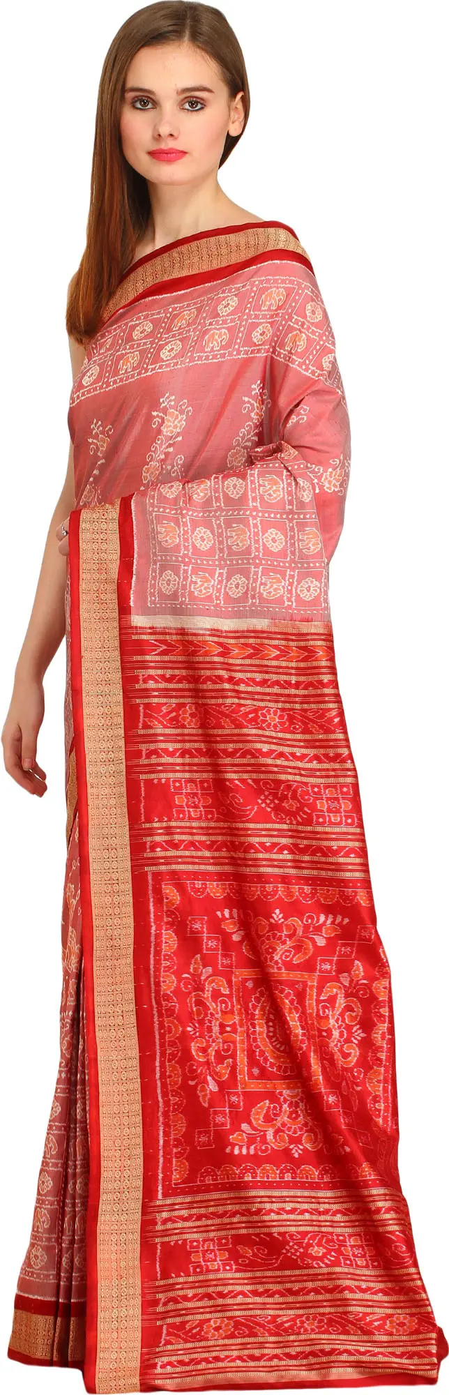 Faded-Rose Pure Cotton Ikat Handloom Sambhalpuri Saree with Animal Motifs and Woven Fish Contrast Pallu & Border