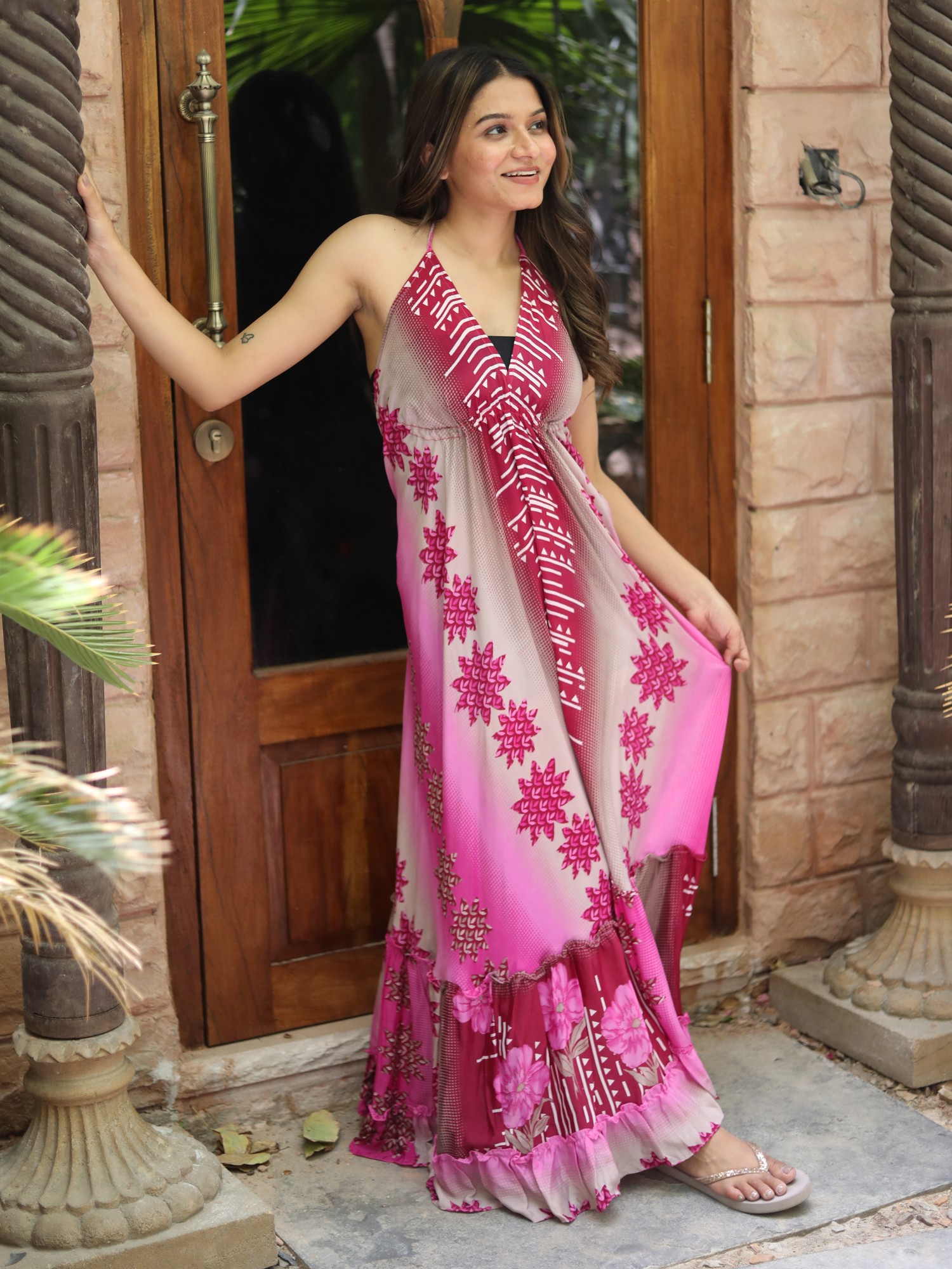 You can invest heavily in an outfit to get that glam look but the most necessary thing which would still be lacking is Comfort. Putting your money wisely to buy an outfit is so necessary even for the environment since you are contributing towards a much more sustainable environment by re-using the outfit. A pinch of glam with elegance and comfort are the attributes you need to look for while getting yourself an attire that you can wear for years to come. A graciously loose fitted attire for a bright afternoon or a casual dinner date is all set to enhance your wardrobe with its elegance and unfathomable beauty. We have got a wide range of colors and prints for you, so there is never a reason to not buy this enchanting piece of clothing. Do not forget to notice that extra flare at the endpiece complementing the halter neck so beautifully as if this outfit is a perfect fit for the contemporary fashion world we are living in.