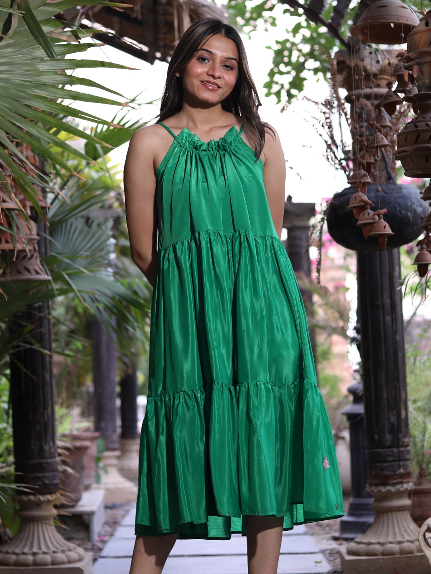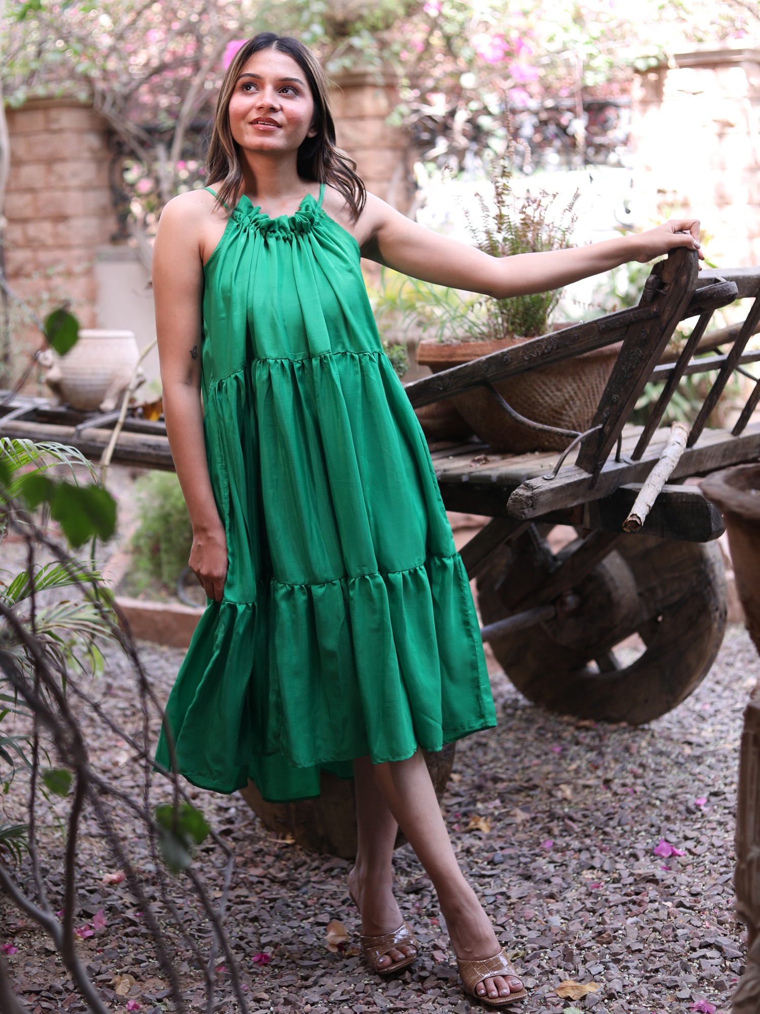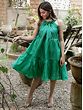 Clear skies, long walks, get-togethers, picnics, and a list of un-ending activities are what summers are made of. It is a whole together different vibe with the onset of summer, the water sports are decked up, and nature is in its most divine form, there is no other way summers are. Amongst all of this, we are certain that you wouldn’t have thought about managing your wardrobe and enhancing that summery and bright-colored outfit collection. Exotic India has made more than 20 summery pastel and bright colored ruffle dress knee lengthen available for you. Make sure to not miss how scintillatingly the ruffles have been made to the neckline complementing the whole outfit so uniquely well. Whether you want an outfit sorted for a casual dinner or for a wavy beach day, just head onto our most astonishing collection of ruffle dresses for women. Our collection has been made in the most thoughtful manner to put together things for you for your impending vacations.