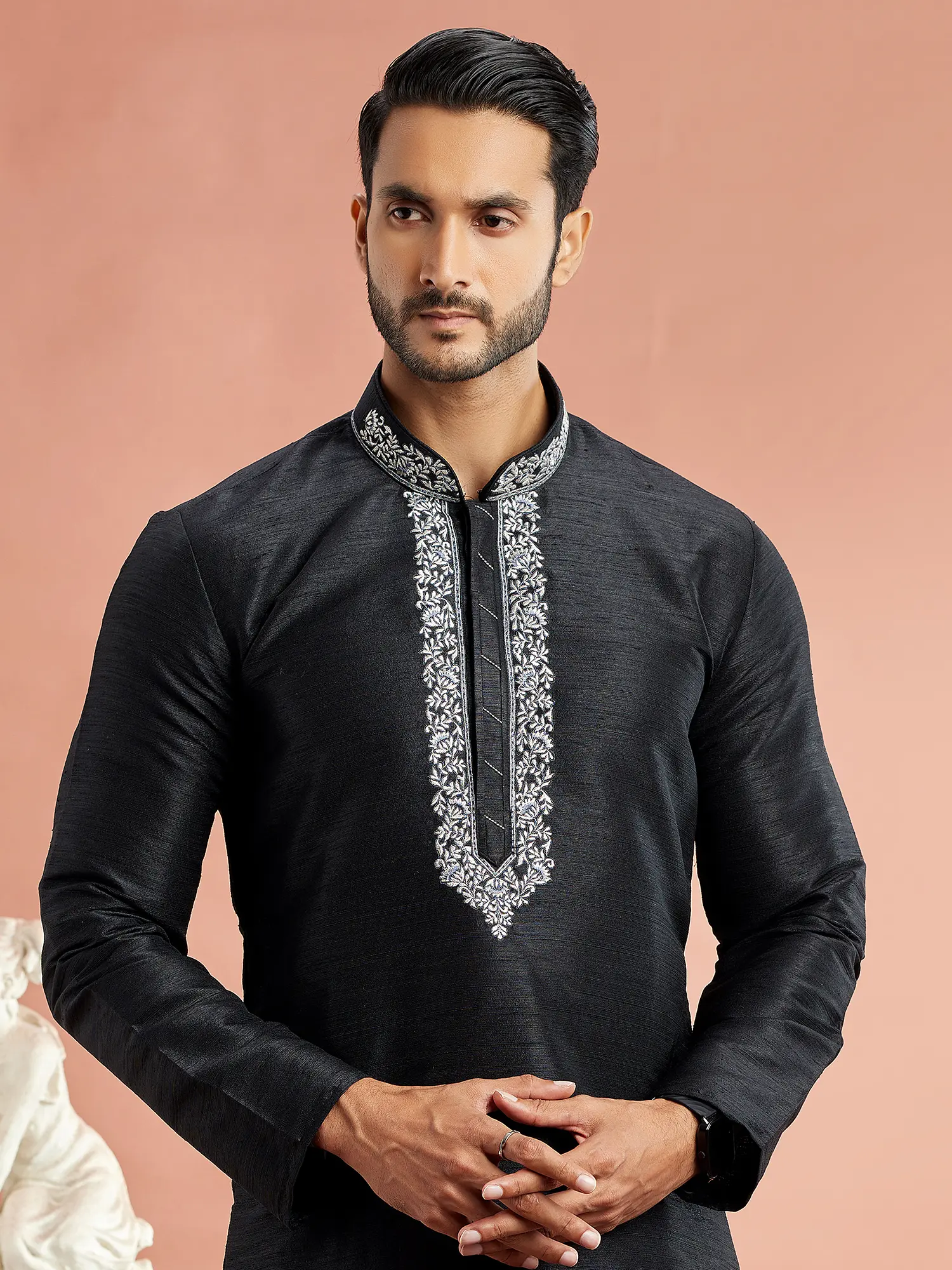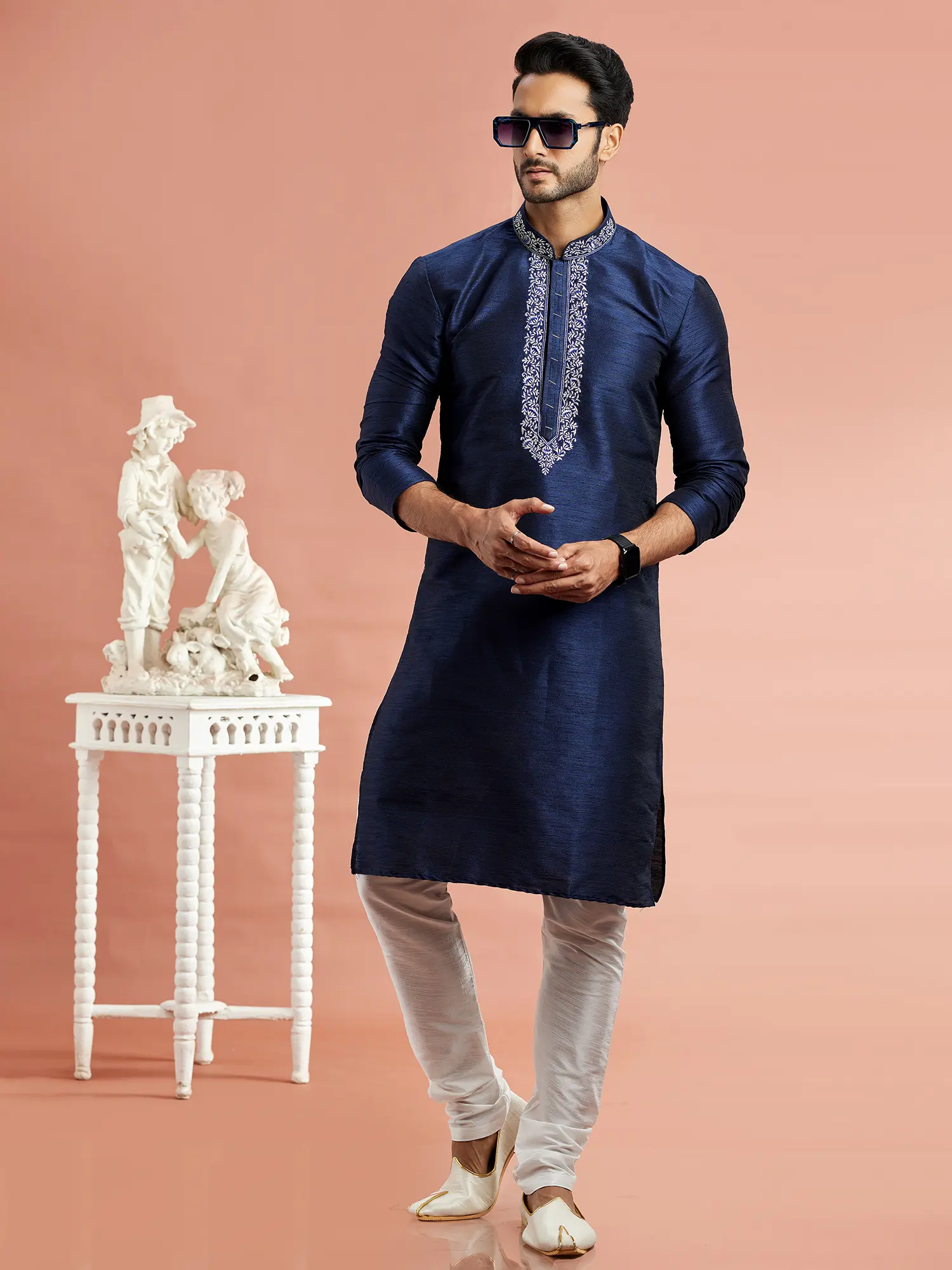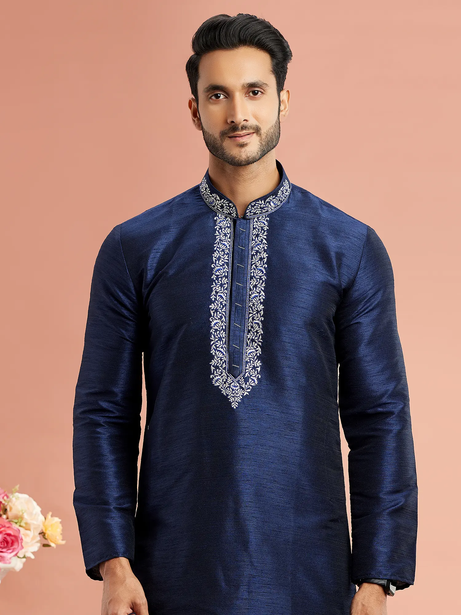 Banarasi Art Silk Embroidery Work Straight Kurta Mandarin Collar Kurta Pajama Set