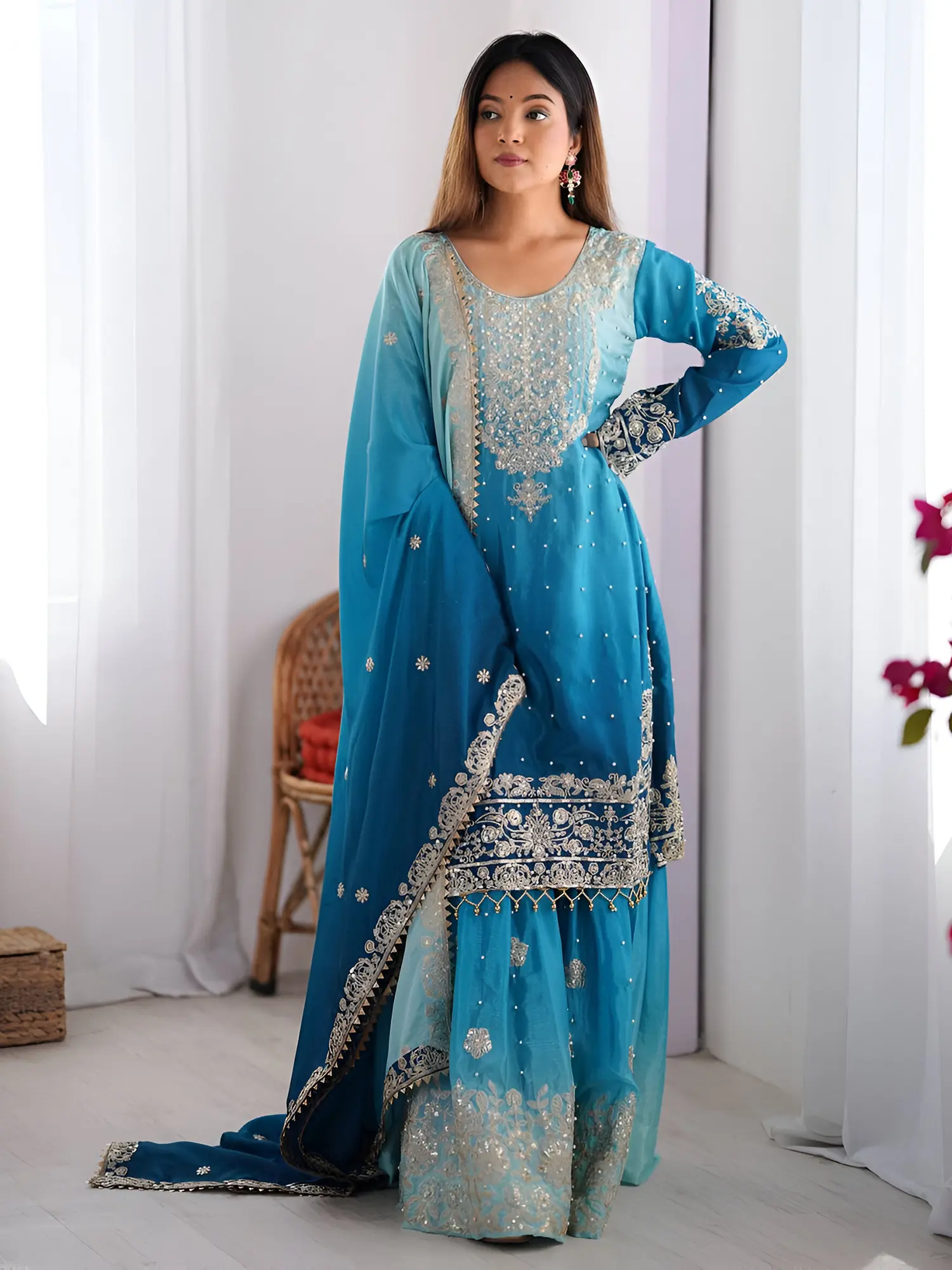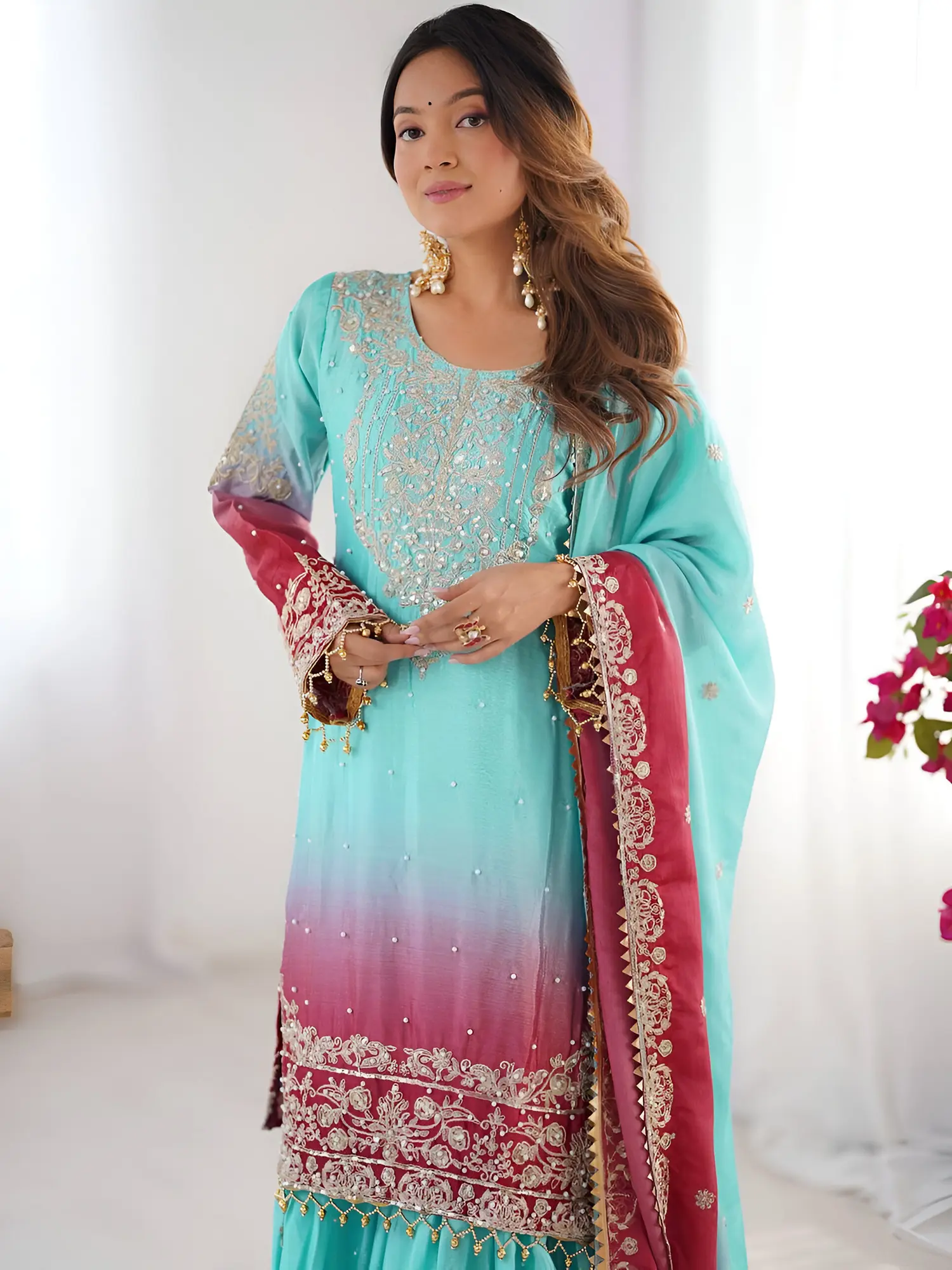 Attractive Chinon Sequins And Embroidery Work Kurti Sharara Set With Dupatta