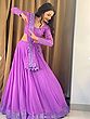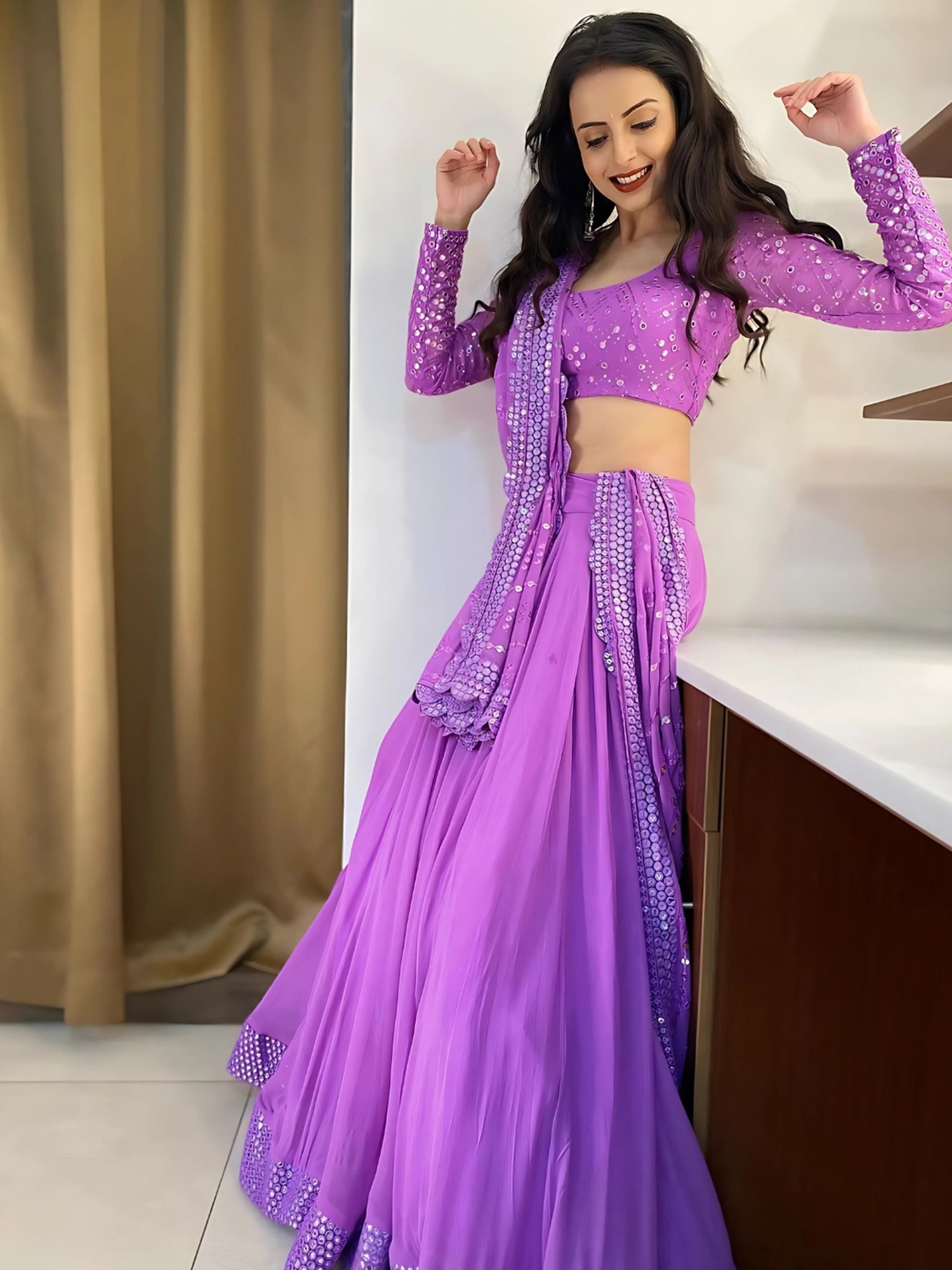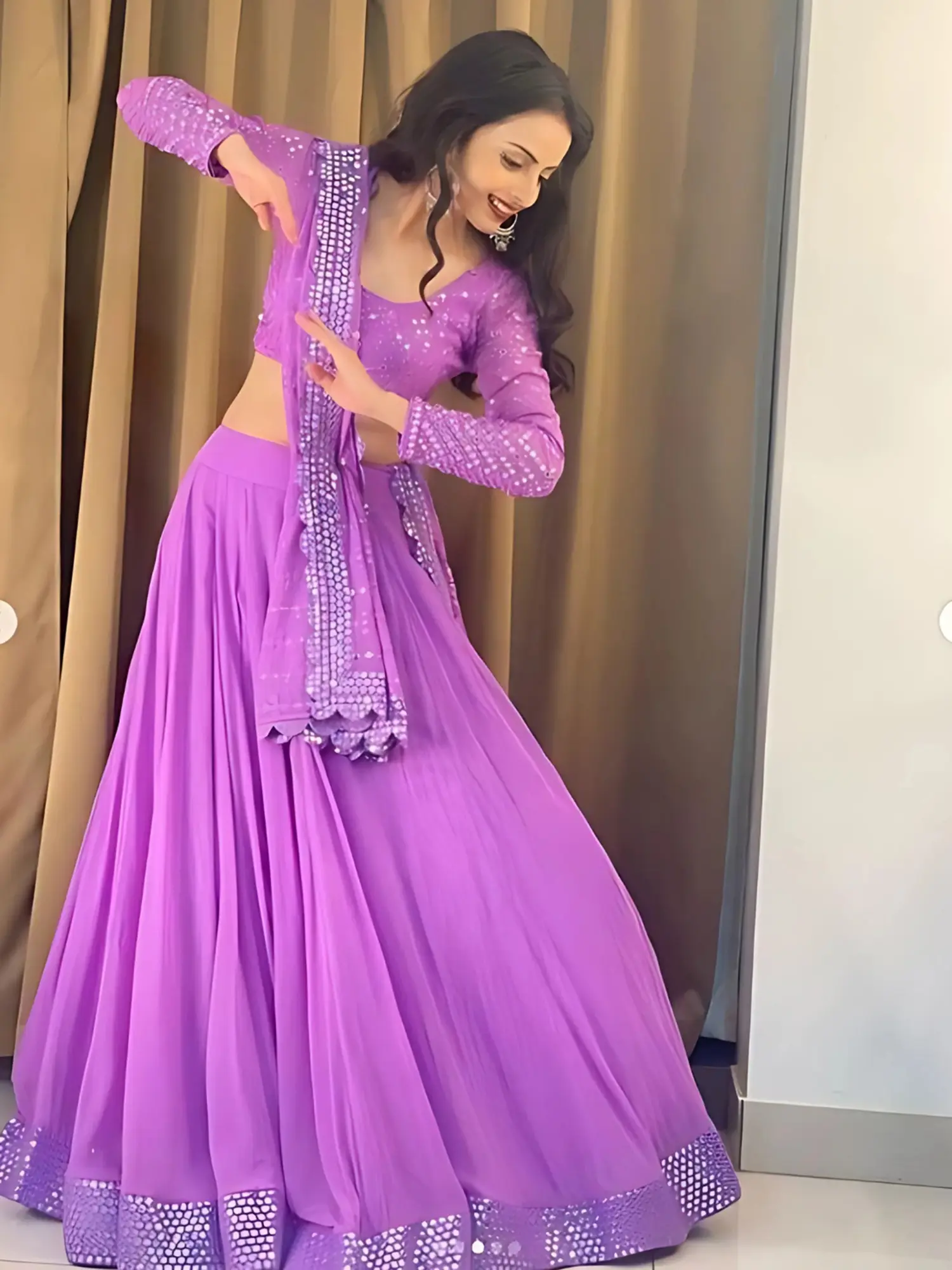 Step into a world of glamour and sophistication with this breathtaking faux georgette lehenga choli set. Designed to make you the star of any occasion, this ensemble exudes a captivating charm that is both timeless and trendy. The rich, flowing fabric drapes beautifully, creating a silhouette that is both flattering and graceful, perfect for making a memorable entrance at any party or festive gathering. The ensemble features a exquisitely crafted choli, designed with full sleeves that are adorned with shimmering sequins. The delicate sequin work creates a captivating pattern, catching the light with every movement and adding a touch of celestial sparkle. The U-neckline of the choli offers a touch of modern allure, while the cropped style adds a contemporary edge, making it a perfect choice for those who appreciate fashion-forward designs. The lehenga itself is a masterpiece of fluid design. Crafted from the same luxurious faux georgette, it cascades down in graceful pleats, offering ample volume and movement. The hemline of the lehenga is a true showstopper, embellished with a wide band of sparkling sequins that mirrors the intricate detailing on the choli and dupatta. This thoughtful detailing ensures a cohesive and dazzling look, from top to bottom. The vibrant hue of the fabric adds to its inherent charm, making it a standout piece in any wardrobe.