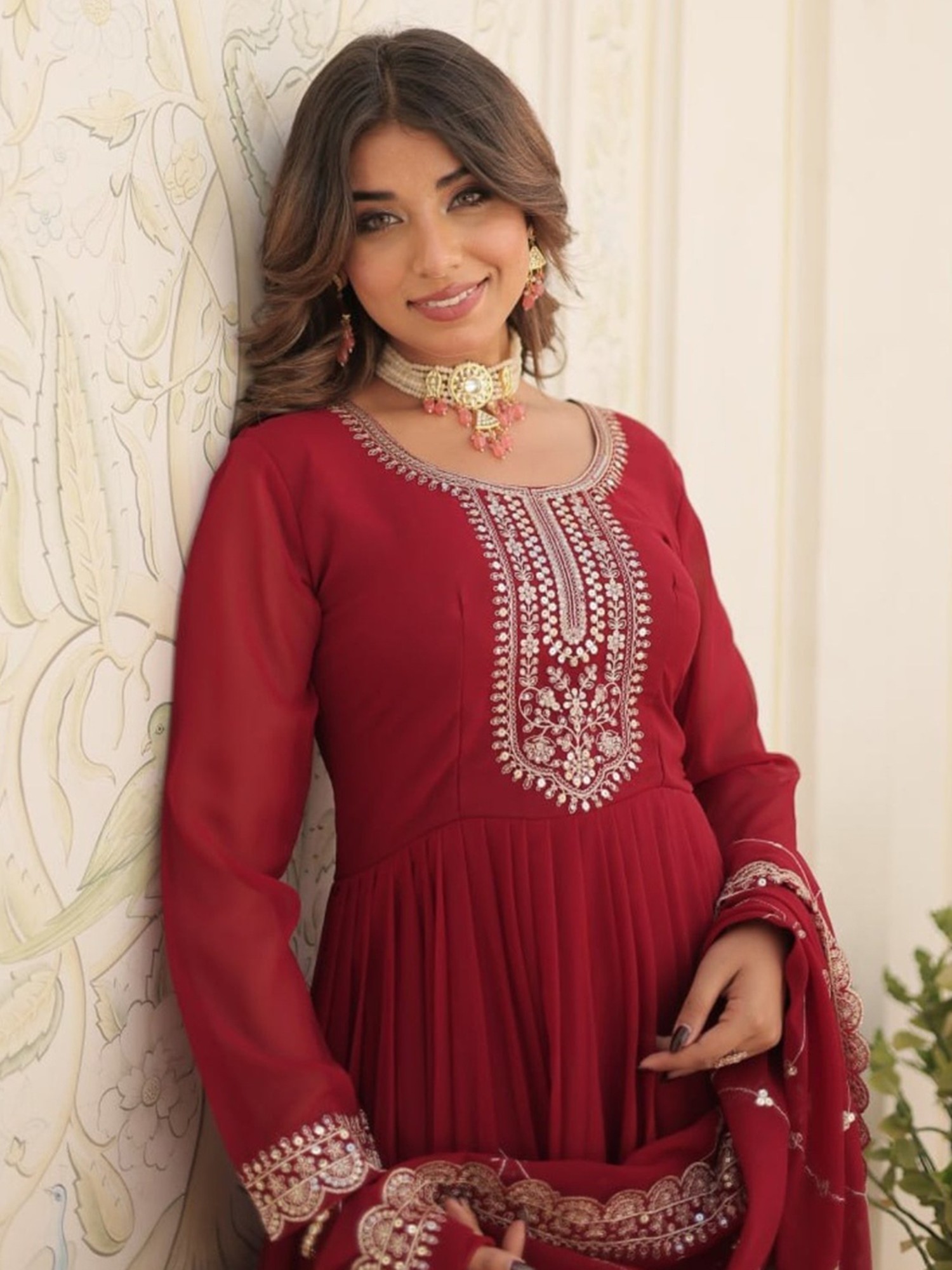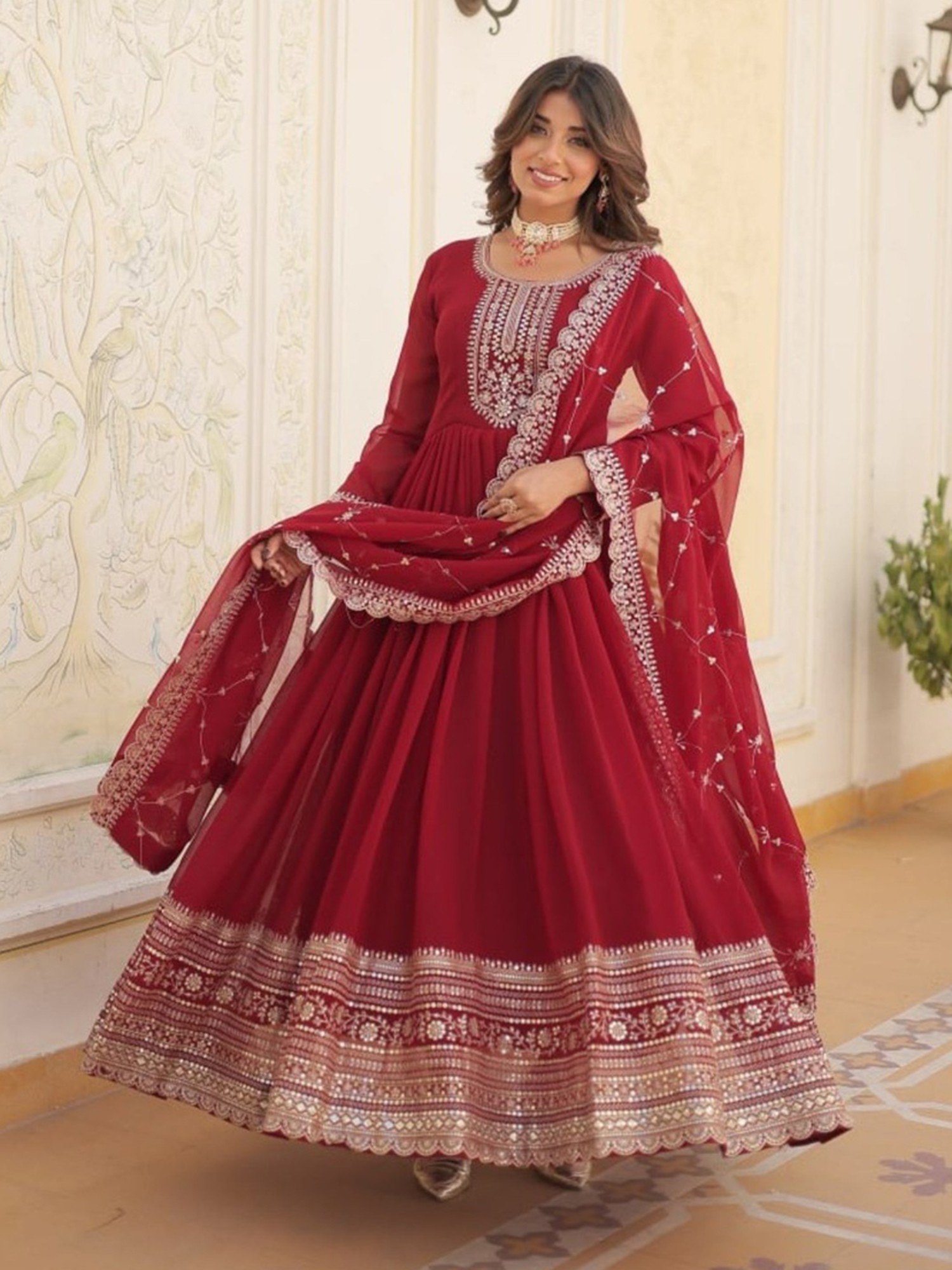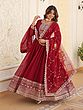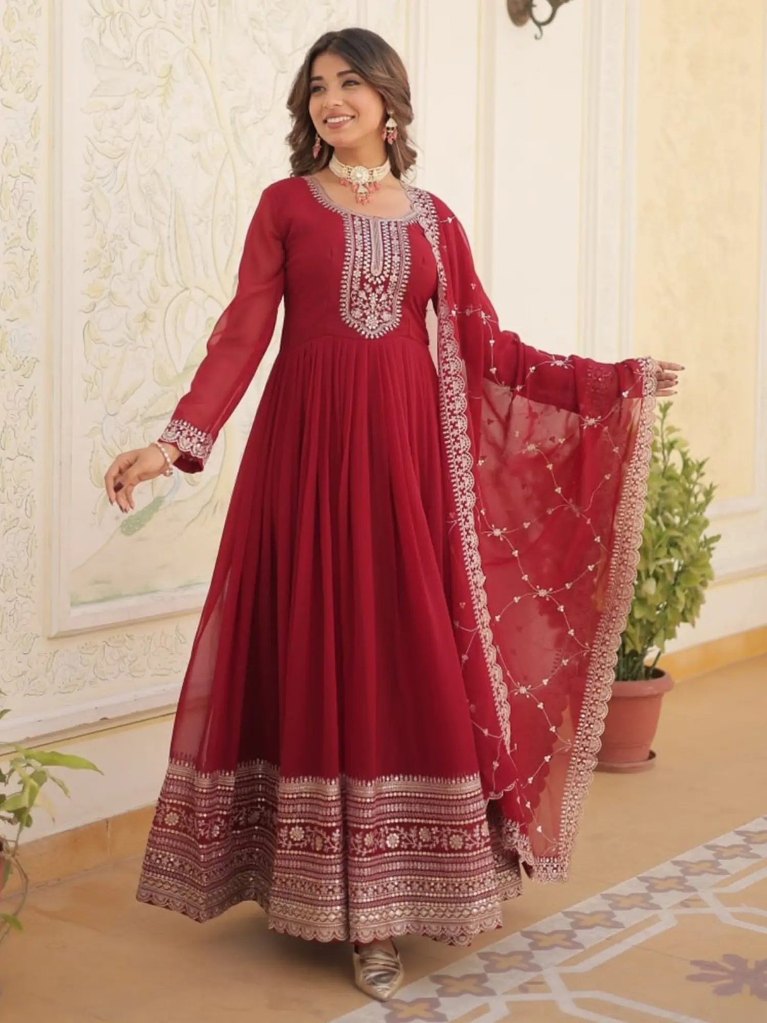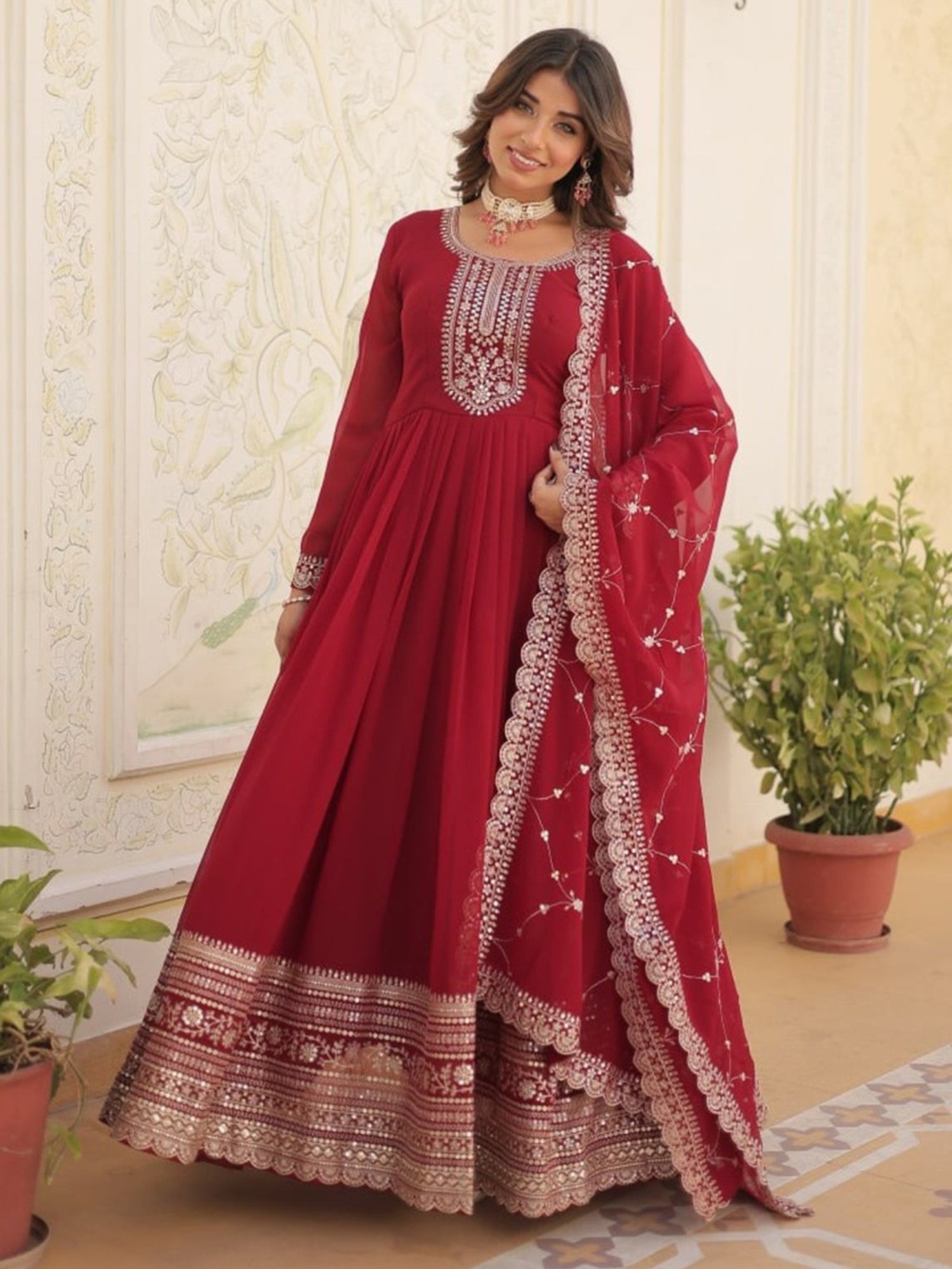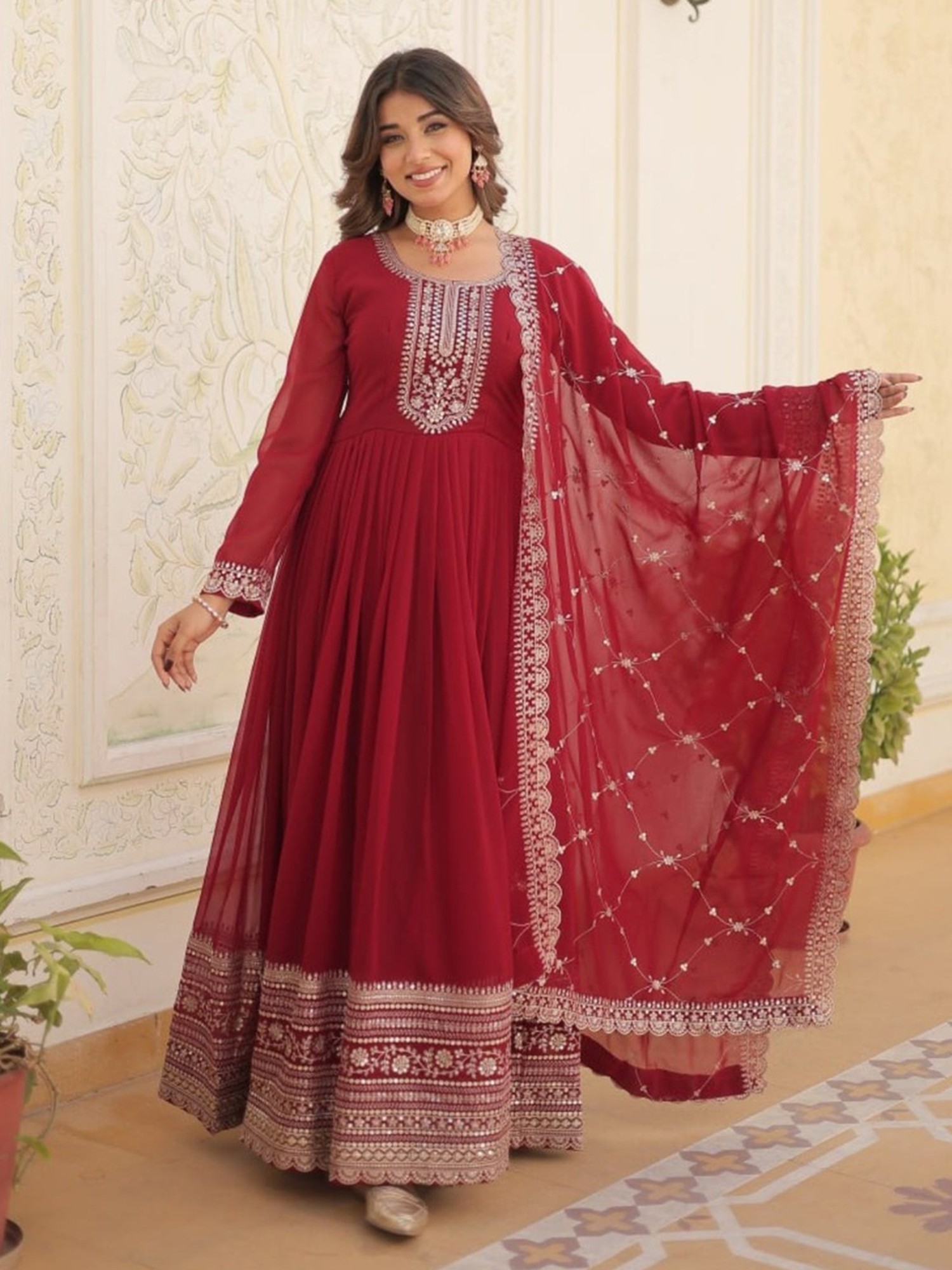 The gown comes complete with a matching dupatta, adding an extra layer of elegance and versatility to the ensemble. The dupatta mirrors the gown's color and is embellished with complementary sequin work along the border, creating a cohesive and harmonious look. Drape it over your shoulders for a traditional feel, or style it in a more modern way to showcase your personal flair. This outfit is ideally suited for parties, weddings, festive celebrations, and any occasion where you want to radiate confidence and style. Pair it with your favorite heels, statement jewelry, and a clutch to complete the look. Prepare to turn heads and leave a lasting impression with this exquisite gown and dupatta set.