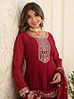 Step into the spotlight with this captivating ensemble, perfect for making a memorable entrance at any special occasion. The rich, deep hue of the gown exudes sophistication and grace, ensuring you'll be the center of attention. Crafted from flowing georgette, the fabric drapes beautifully, creating a flattering silhouette that moves with you. The flared design adds a touch of drama and allows for comfortable movement, making it ideal for evenings filled with dancing and celebration. The intricate sequin work elevates the design to new heights. Sparkling embellishments delicately adorn the neckline, bodice, and hem, catching the light with every turn. The detailed patterns provide a stunning contrast against the solid fabric, adding depth and dimension to the overall look. This meticulous attention to detail speaks to the quality and craftsmanship of the garment, making it a true statement piece.