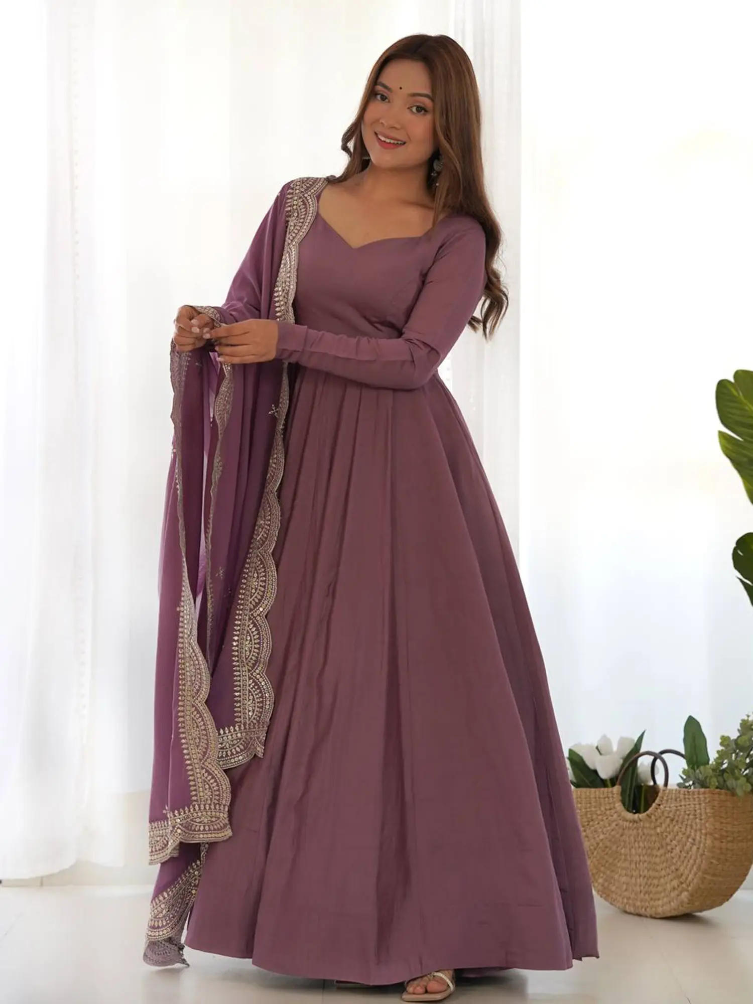 This Anarkali suit embodies the timeless appeal of its signature silhouette. The fully flared design offers a dramatic and graceful sweep, reminiscent of classic Indian attire. The long, flowing hemline moves with a captivating fluidity, adding an aura of regal charm to your presence. The full sleeves provide a touch of modesty and elegance, balancing the voluminous flair of the lower garment. This design is not just a garment; it's a statement of refined taste and traditional appreciation.