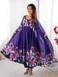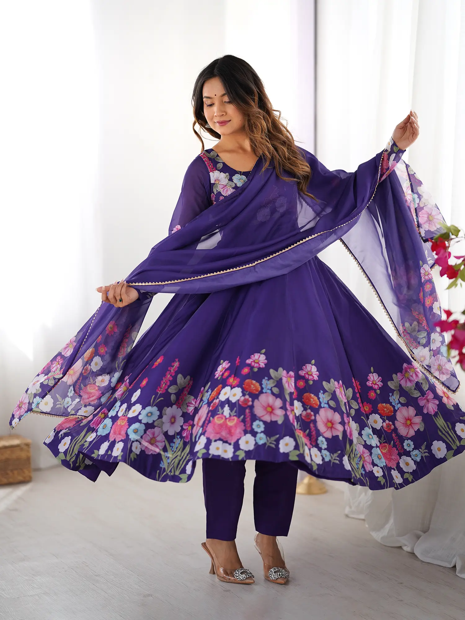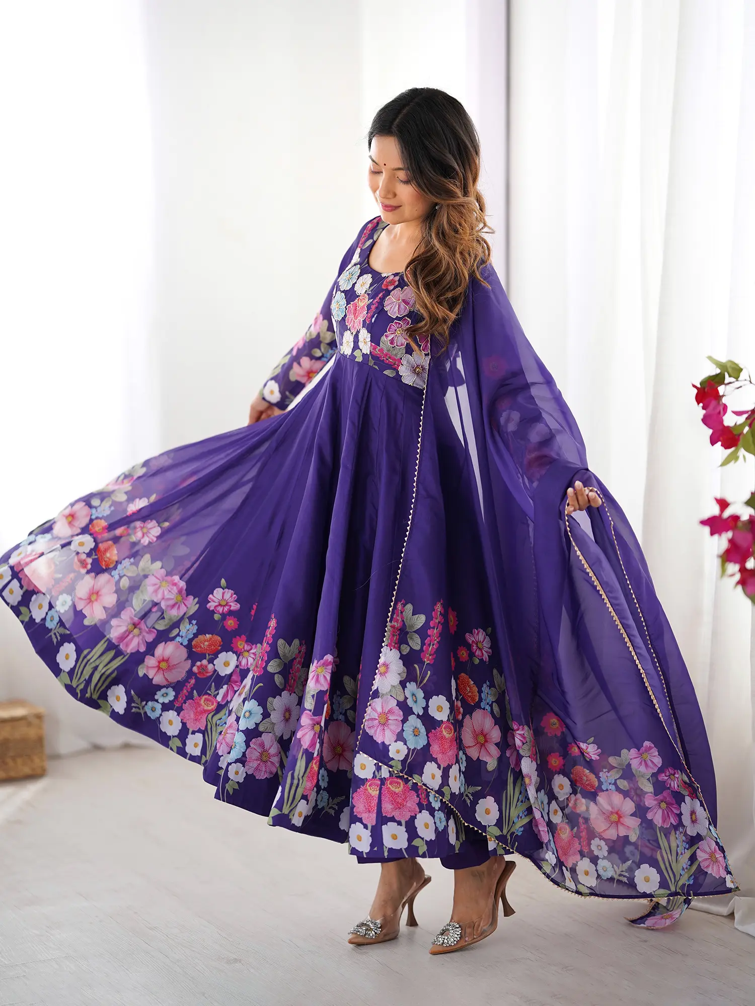 Step into a world of ethereal charm with this exquisite Anarkali suit, designed to make you the center of attention at any celebratory occasion. Crafted from luxurious organza silk, this ensemble boasts a breathtaking floral print that dances across the fabric, creating a vibrant and captivating visual. The rich, deep purple hue serves as the perfect canvas for a riot of colorful blossoms, from delicate pinks and whites to cheerful blues and purples, interspersed with lush green foliage. This intricate design evokes the feeling of a blooming garden, bringing a touch of nature's beauty to your attire.