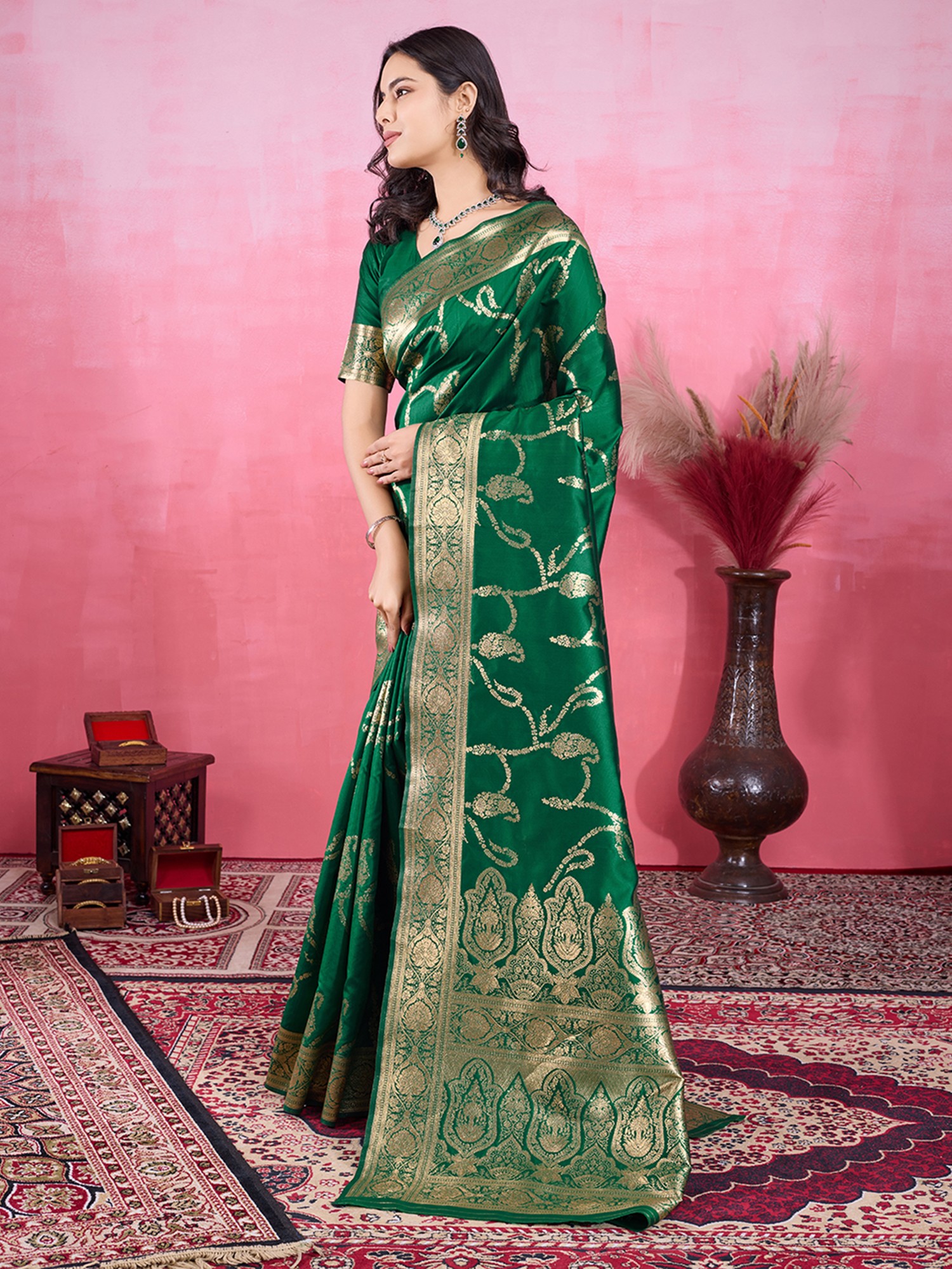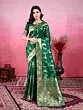 Drape yourself in the timeless allure of this stunning soft Lichi silk saree, a masterpiece designed to make you shine at any festive occasion. Crafted from the finest Lichi silk, this saree promises an unparalleled level of comfort and a luxurious feel against your skin. The rich, deep green hue serves as a perfect canvas for the intricate weaving work that adorns its surface.