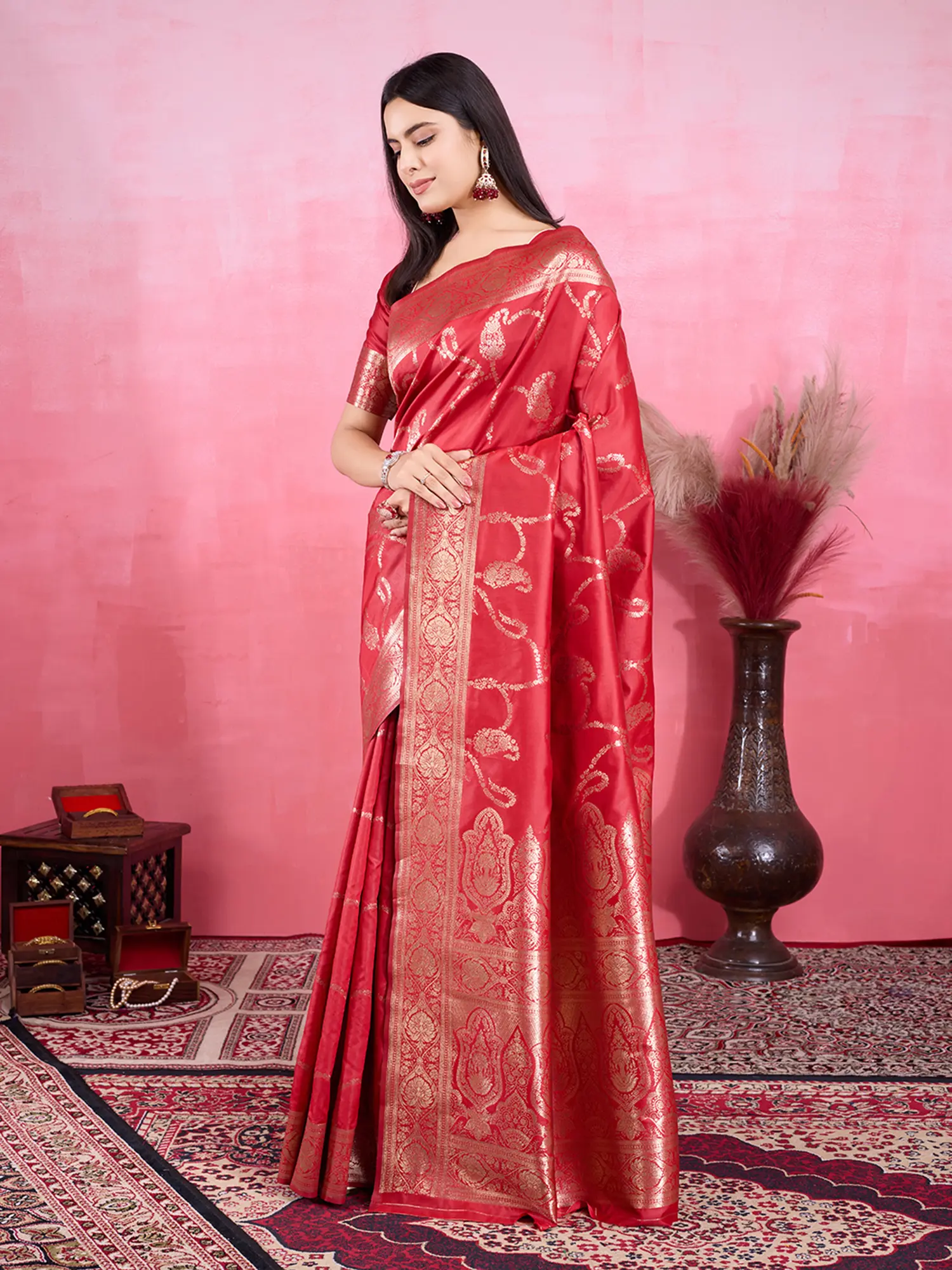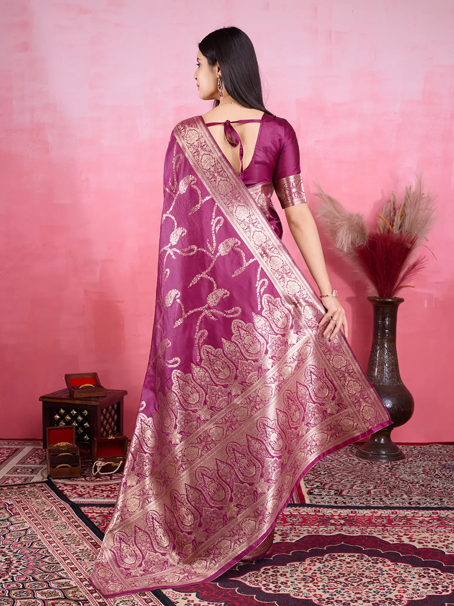 Pair this exquisite saree with traditional gold jewelry and a matching clutch to complete your regal look. The soft Lichi silk drapes beautifully, accentuating your silhouette and adding a touch of grace to your persona. Whether you are attending a family wedding or a festive evening celebration, this saree is sure to make you the center of attention. Experience the blend of traditional artistry and contemporary style that this magnificent creation offers.