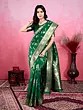The beauty of this saree lies in its elaborate weaving. Delicate, golden motifs are meticulously woven throughout the fabric, creating a mesmerizing pattern that catches the light with every movement. These traditional yet contemporary designs speak volumes of artisanal craftsmanship. The pallu, a contrasting element that adds a dramatic flair, is equally embellished, drawing the eye with its rich detail and vibrant sheen. The combination of the deep green body and the ornate golden pallu creates a striking visual appeal, making this saree a true statement piece.