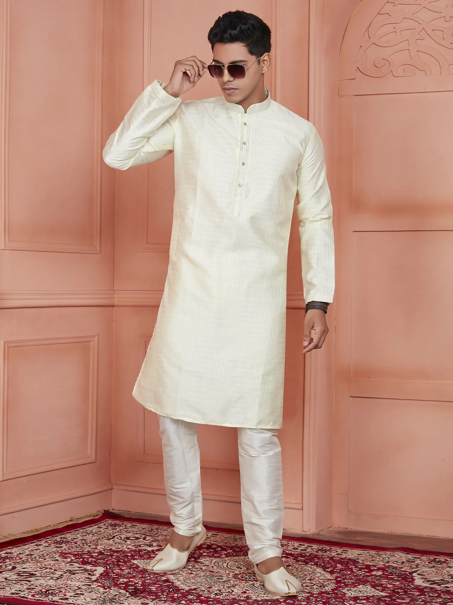 The kurta features a sleek and modern straight cut, offering a comfortable and flattering fit for a range of body types. The mandarin collar adds a touch of regal charm, while the delicate button placket enhances the clean and streamlined silhouette. The intricate jacquard weave creates a subtle yet visually appealing texture, adding depth and dimension to the fabric. The full sleeves offer a traditional touch, making it appropriate for formal occasions. The accompanying pajama is tailored for a slim fit, completing the sophisticated and polished look.