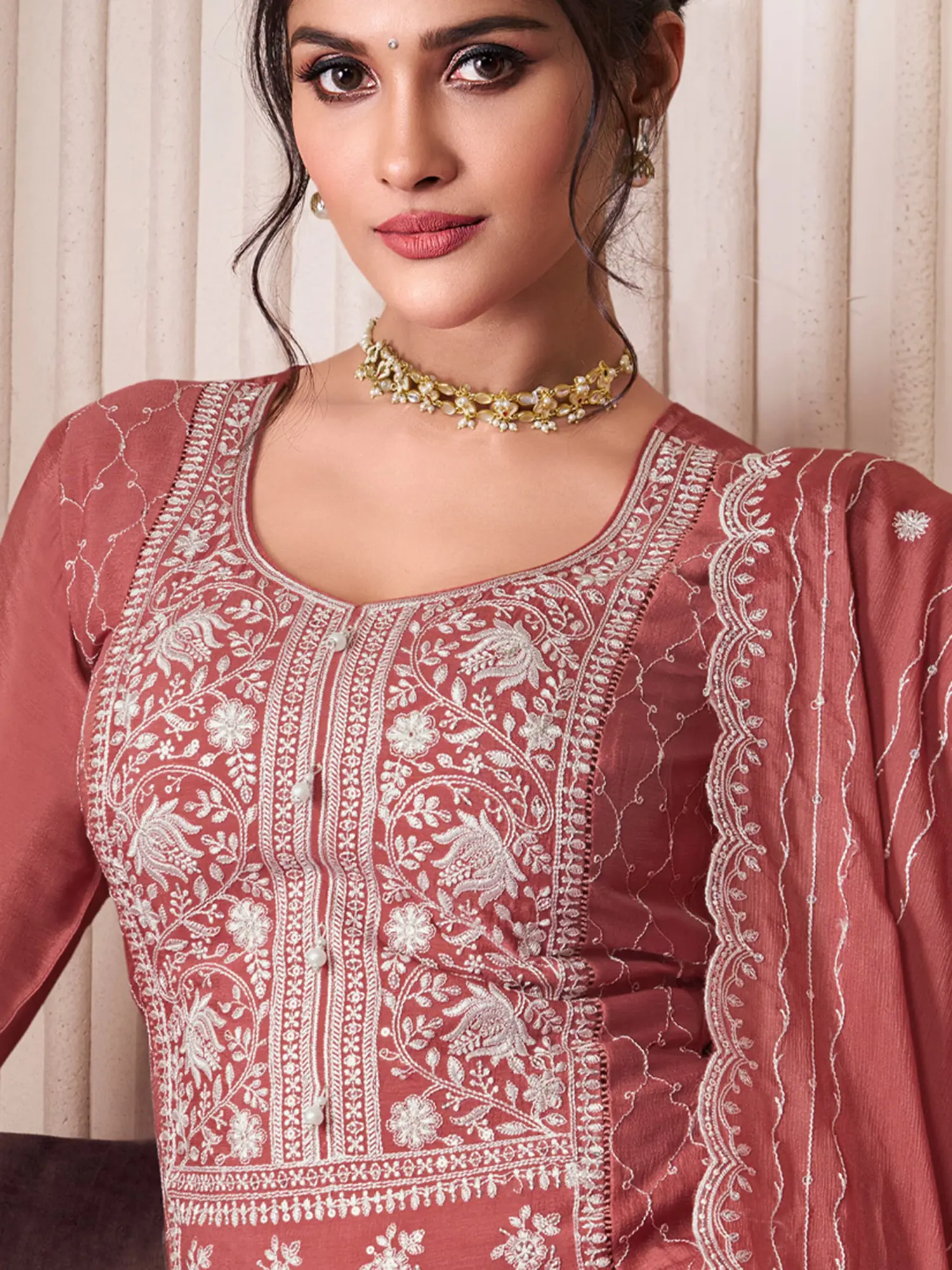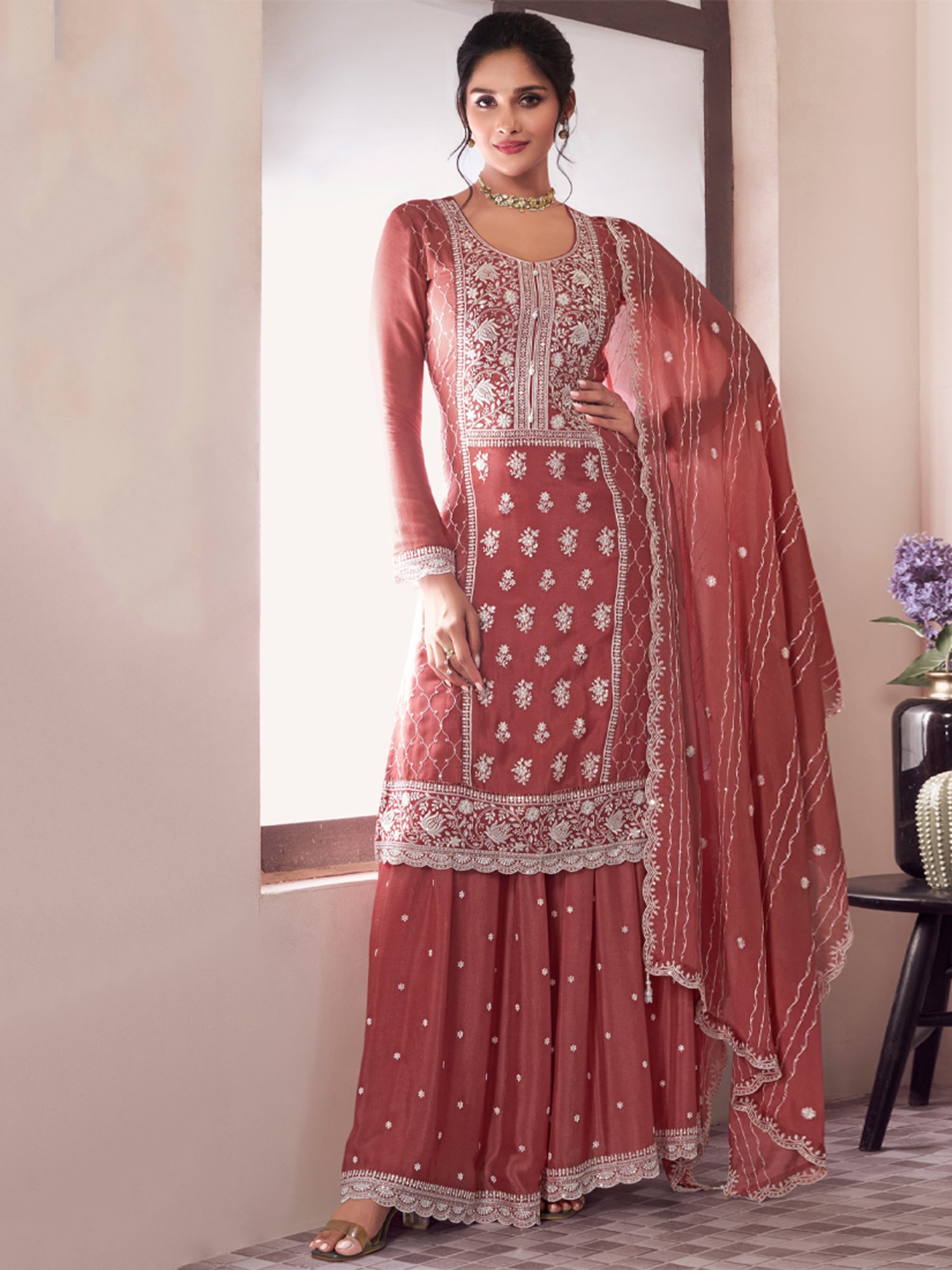 Chinon Floral Motif Embroidered Palazzo Suit With Dupatta For Wedding