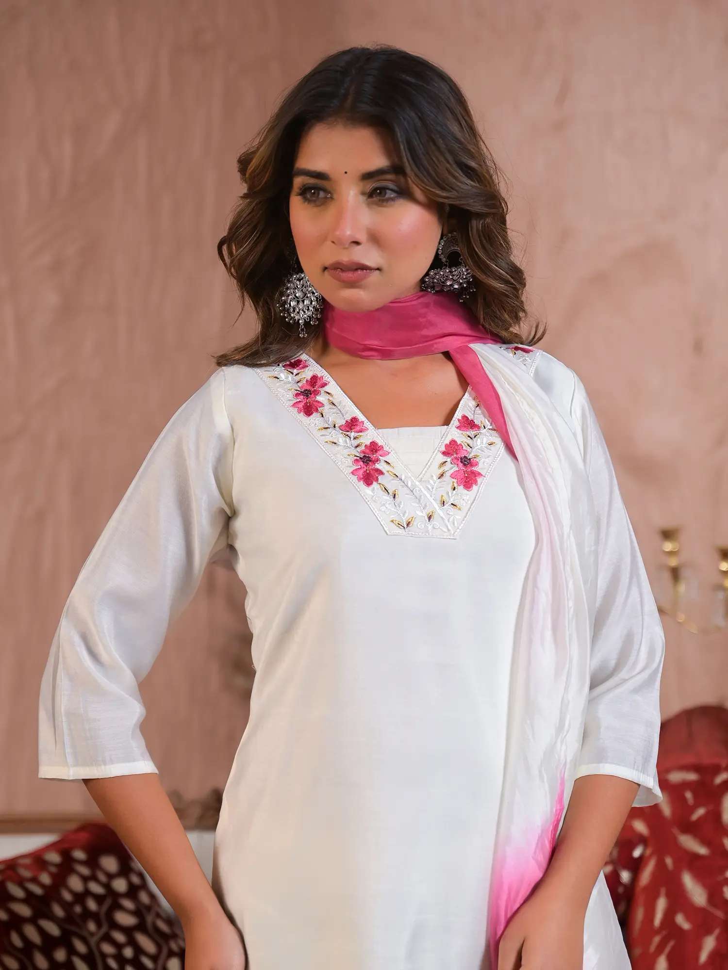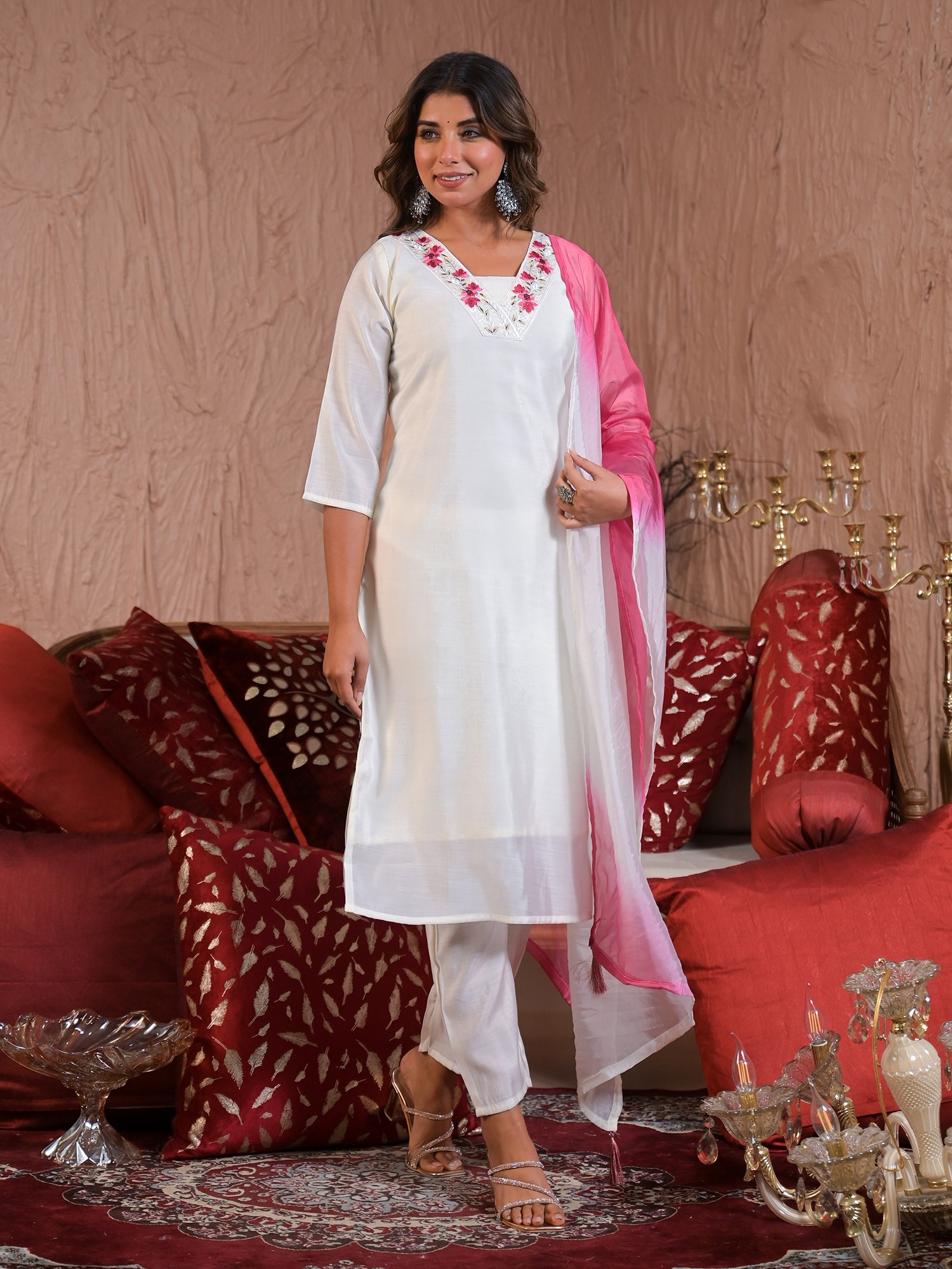 Embroidery Floral Work On Neck Attractive Viscose Chanderi Kurta With Bottom And Zig-Zag Pattern Dupatta