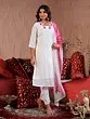 This ensemble is a testament to refined style, blending the grace of traditional Indian design with a contemporary silhouette. The pristine canvas of the kurta and trousers is crafted from Viscose Chanderi, a fabric prized for its subtle sheen and luxurious feel. The lightness of the fabric ensures comfort, making it an ideal choice for festive occasions or special gatherings.