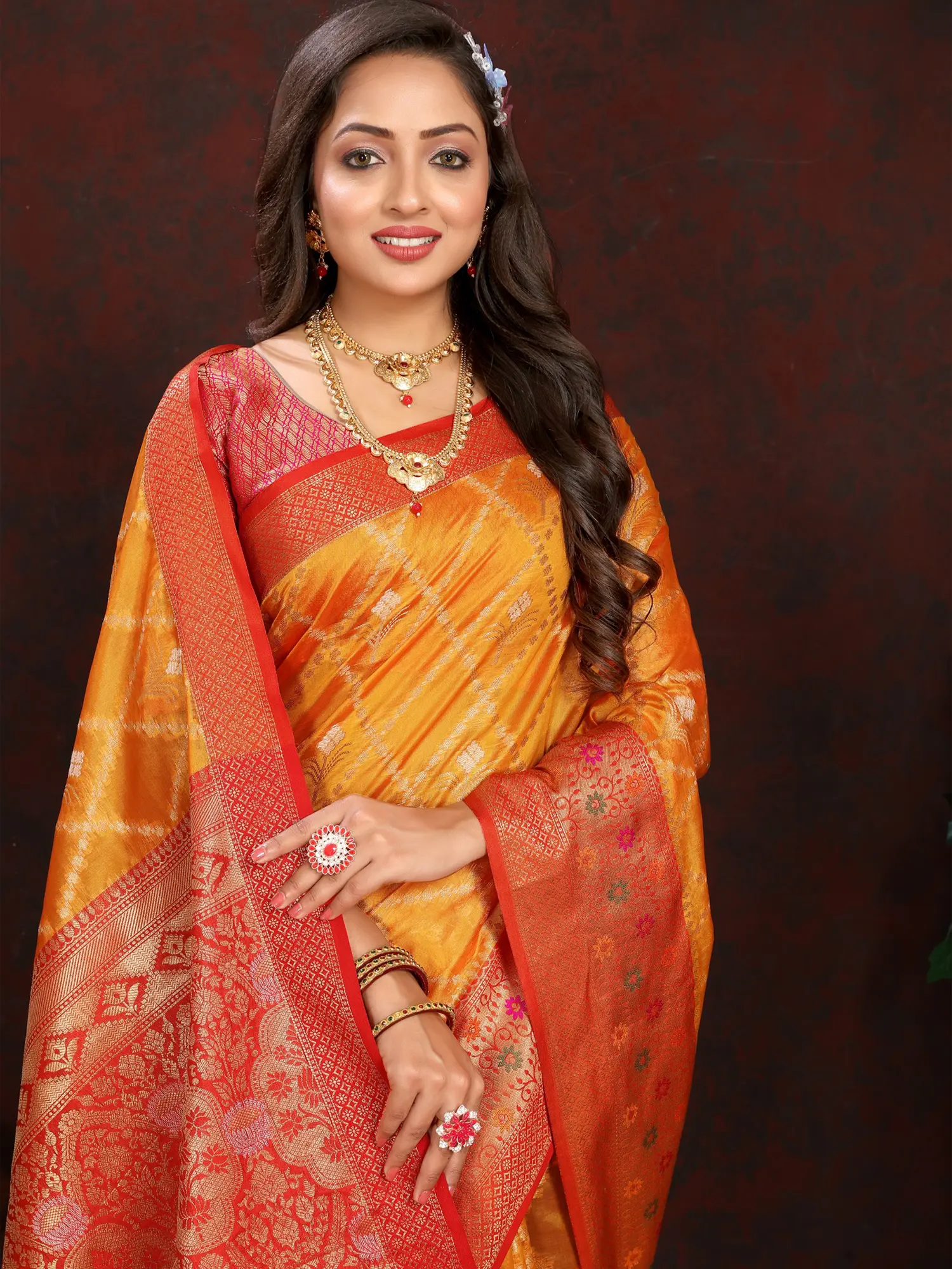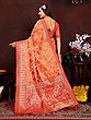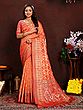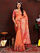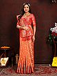 Drape yourself in the unparalleled luxury of this exquisite Banarasi silk saree, a testament to India's rich weaving heritage. Crafted from the finest silk, this saree boasts a radiant hue that evokes the warmth of a sunrise. The lustrous sheen of the silk catches the light, creating a captivating play of shimmer and depth that is simply breathtaking. This is more than just a garment; it's a wearable masterpiece designed to make you feel like royalty at any celebration.