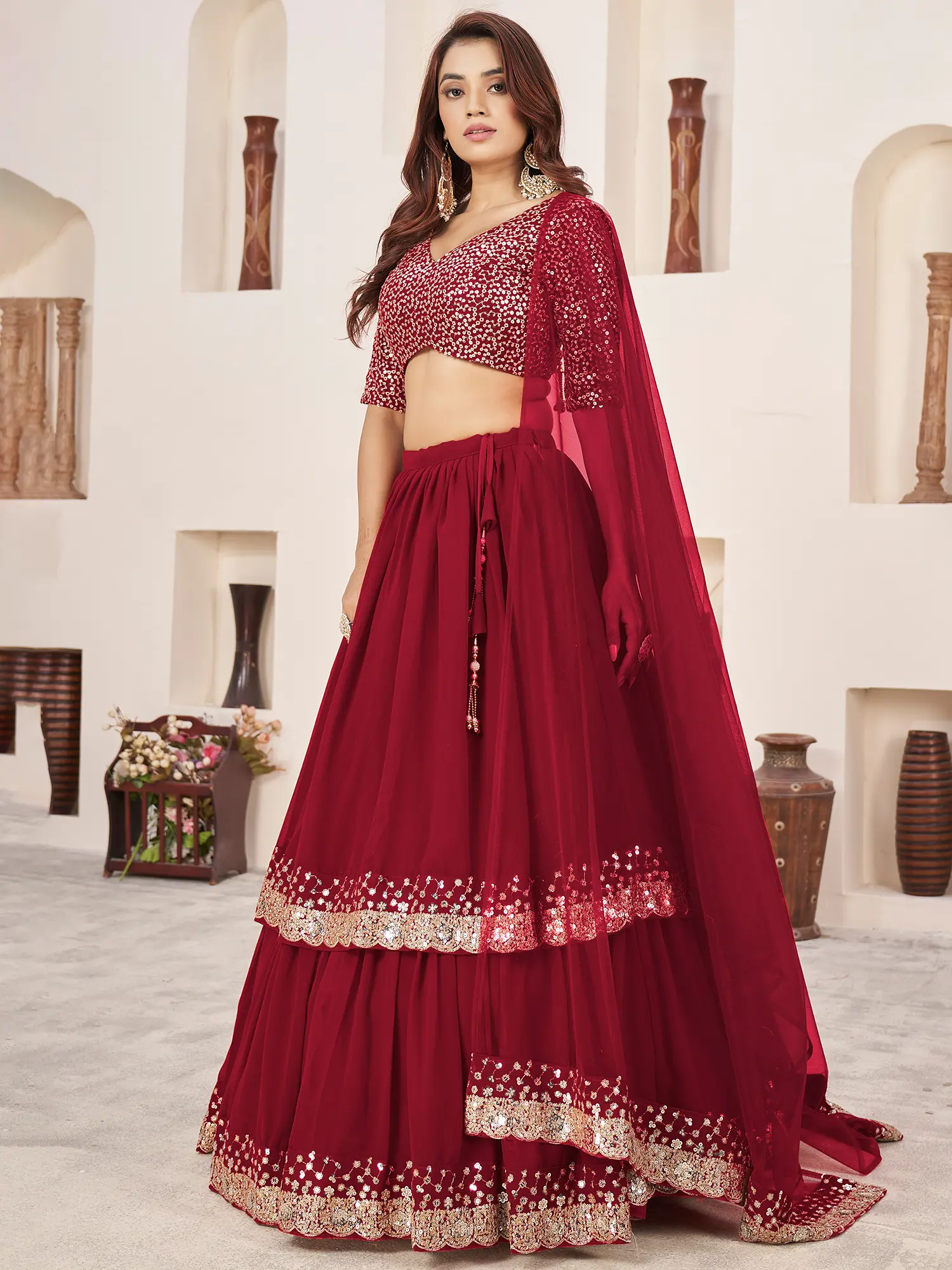 Make an unforgettable statement at your next wedding occasion with this exquisite Lehenga Choli set. Crafted from luxurious georgette fabric, this ensemble drapes beautifully, offering a flowy silhouette that is both comfortable and captivating. The rich, deep hue of the lehenga is enhanced by intricate zari embroidery and shimmering sequins, creating a dazzling effect that catches the light with every movement.