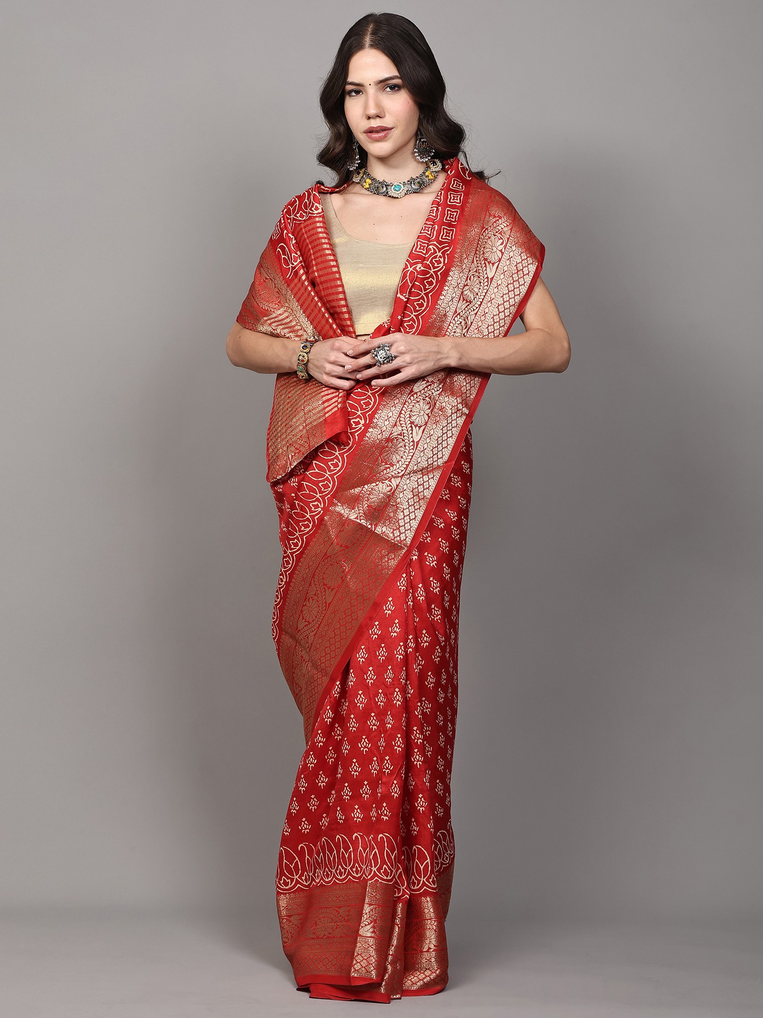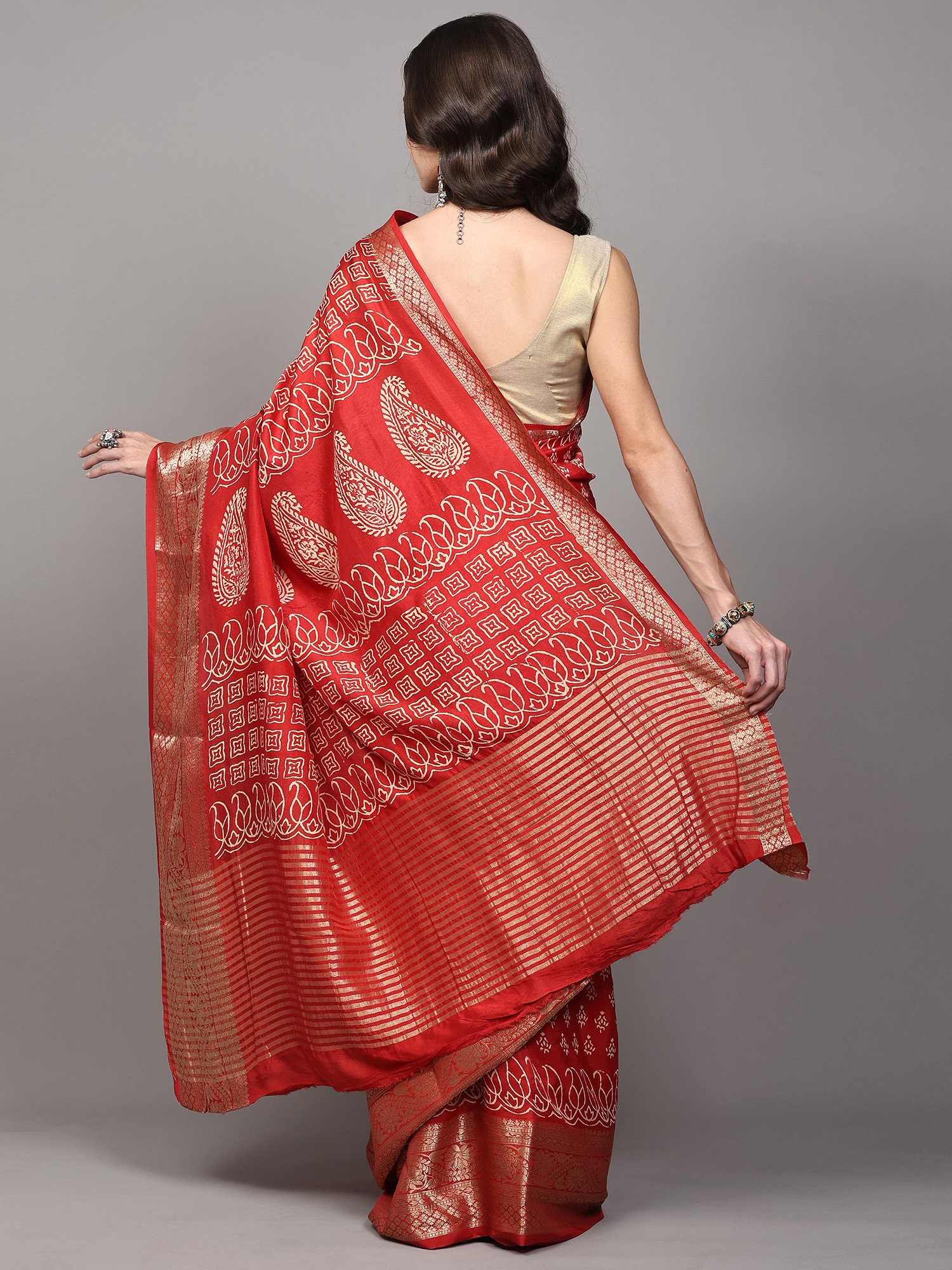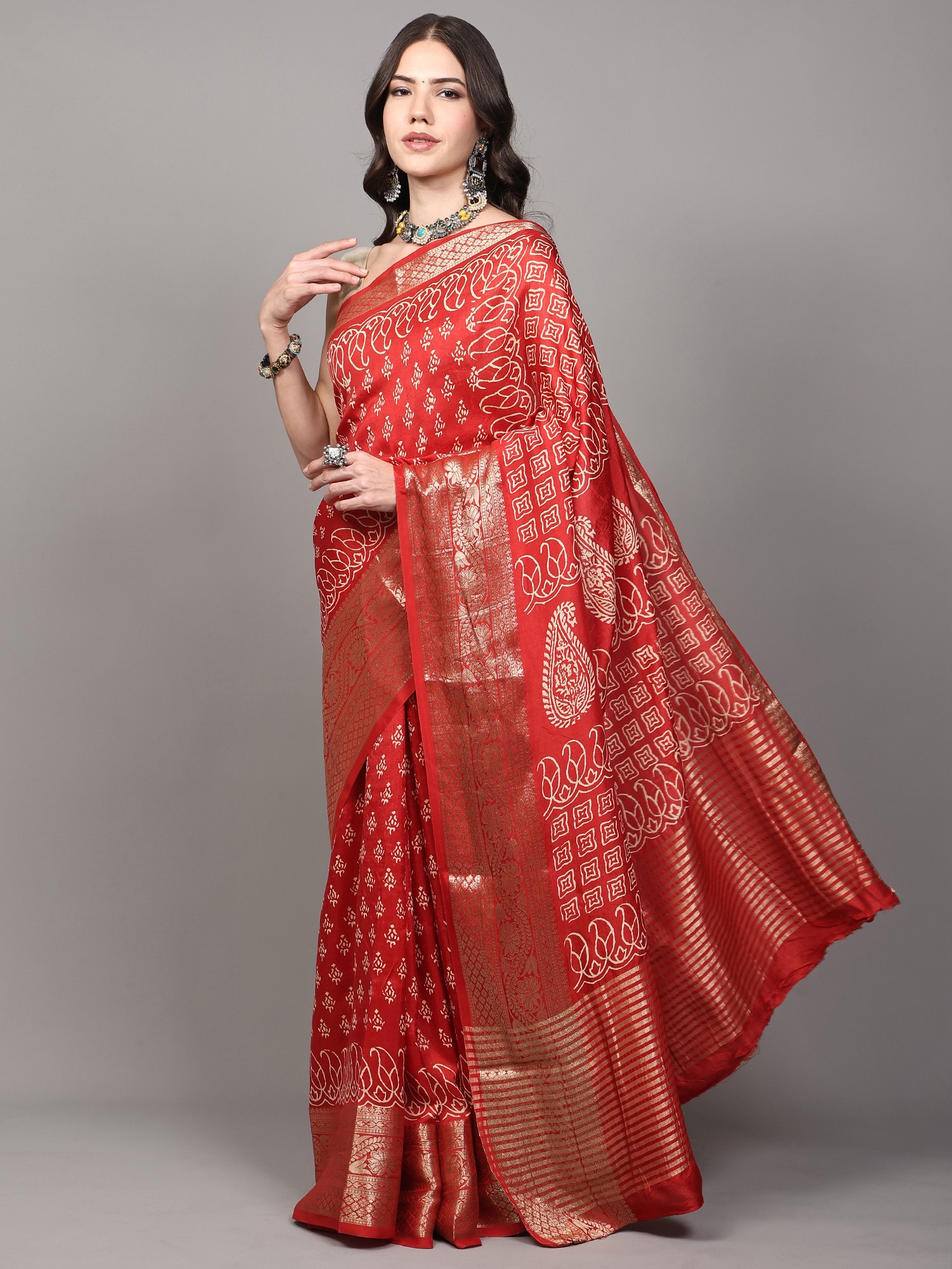 Burnt-Olive Bootis Printed Dola Silk Saree with Paisleys Pallu and Golden Border