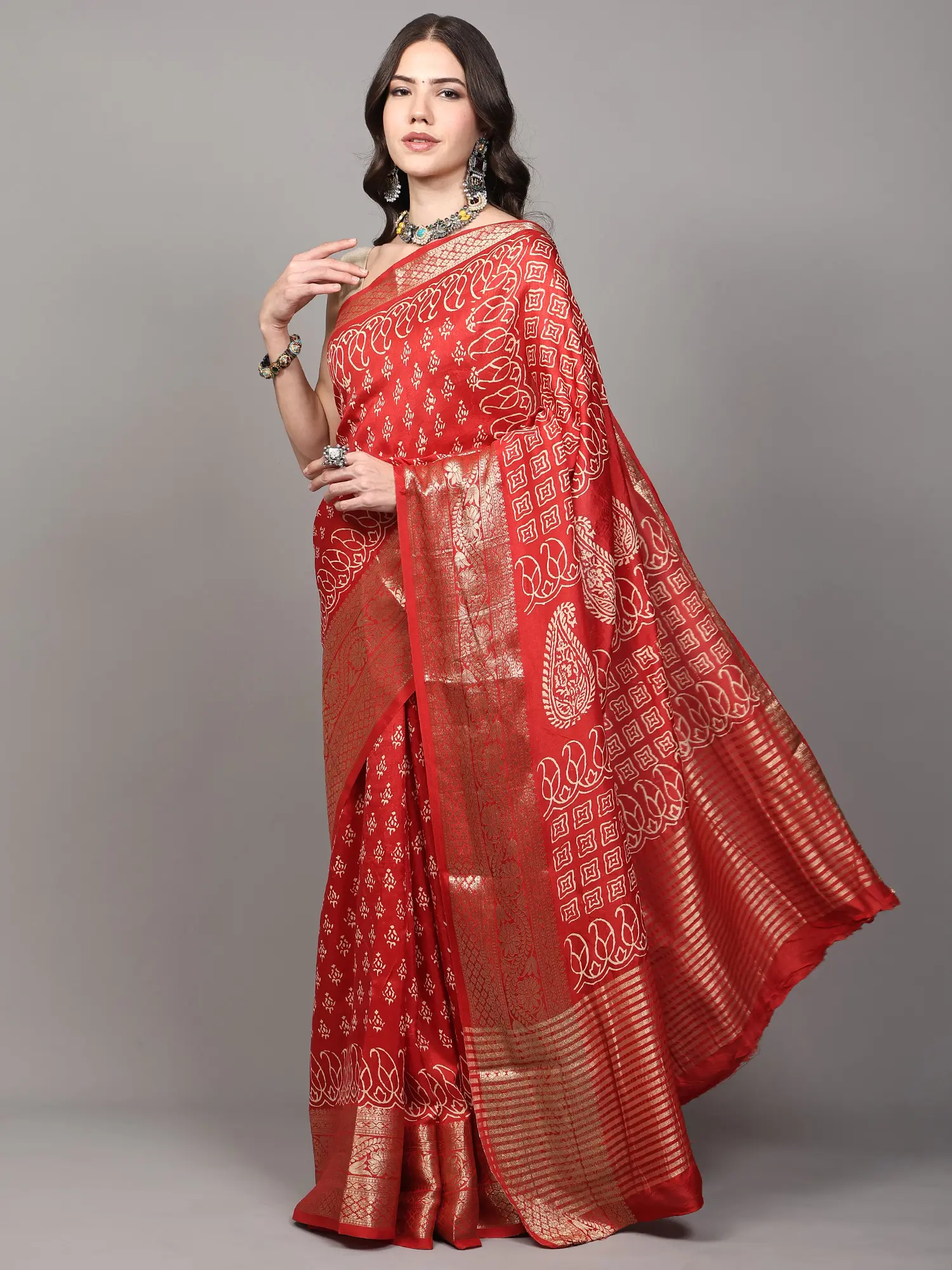 Attractive Geometric Patterns Wide Border Muslin Dola Silk Saree With Blouse