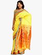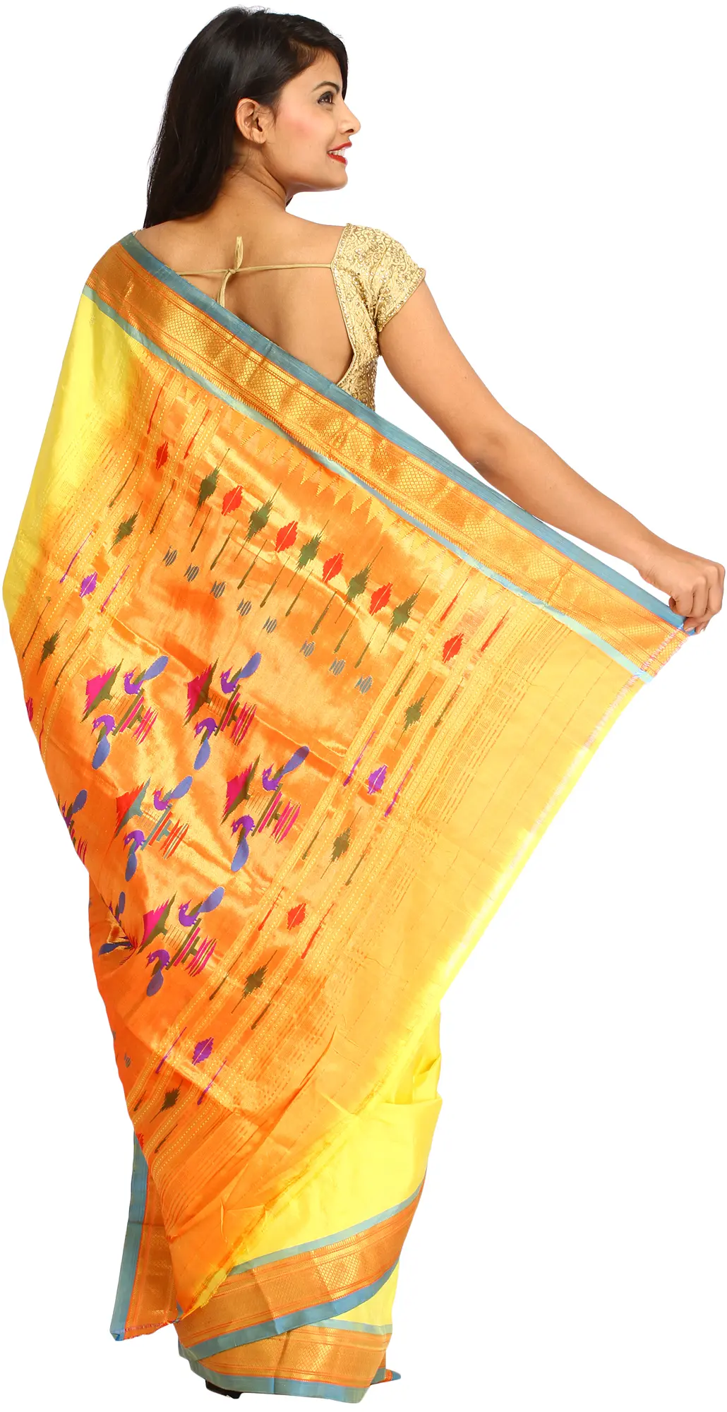 Immerse yourself in the rich heritage of Indian craftsmanship with this exquisite Aurora-Yellow Paithani Sari. Woven from the finest pure silk, this sari is a testament to the artistry of weaver Azeem Khan, who has poured his skill and passion into every thread. The vibrant Aurora-Yellow hue evokes the warmth of a sunrise, radiating a sense of joy and optimism. This color choice makes a bold yet elegant statement, ensuring you'll turn heads at any occasion.