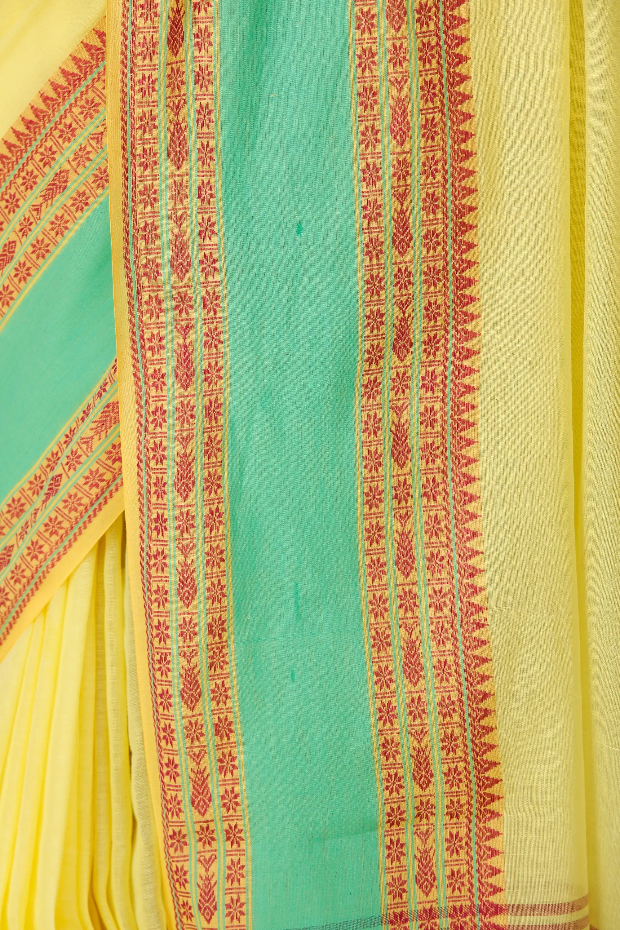 The vibrant Aurora-yellow hue of this sari evokes the warmth and cheer of auspicious beginnings. Its beauty is further enhanced by the meticulously woven borders, featuring delicate bootis in a striking red thread. These intricate motifs are a hallmark of artisanal craftsmanship, adding depth and visual interest to the entire drape. The accompanying broad border in refreshing mint green, interspersed with the same elegant bootis and subtle horizontal stripes, creates a captivating contrast that is both sophisticated and eye-catching.