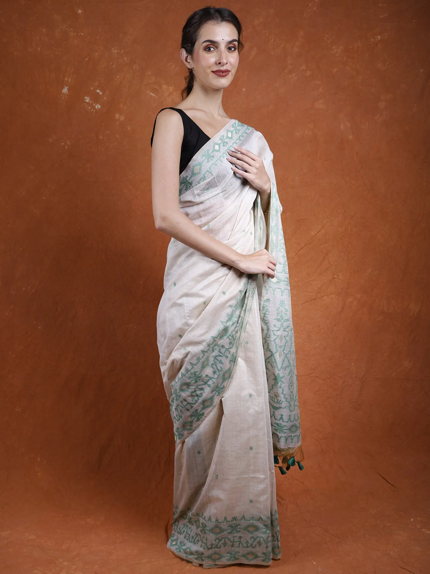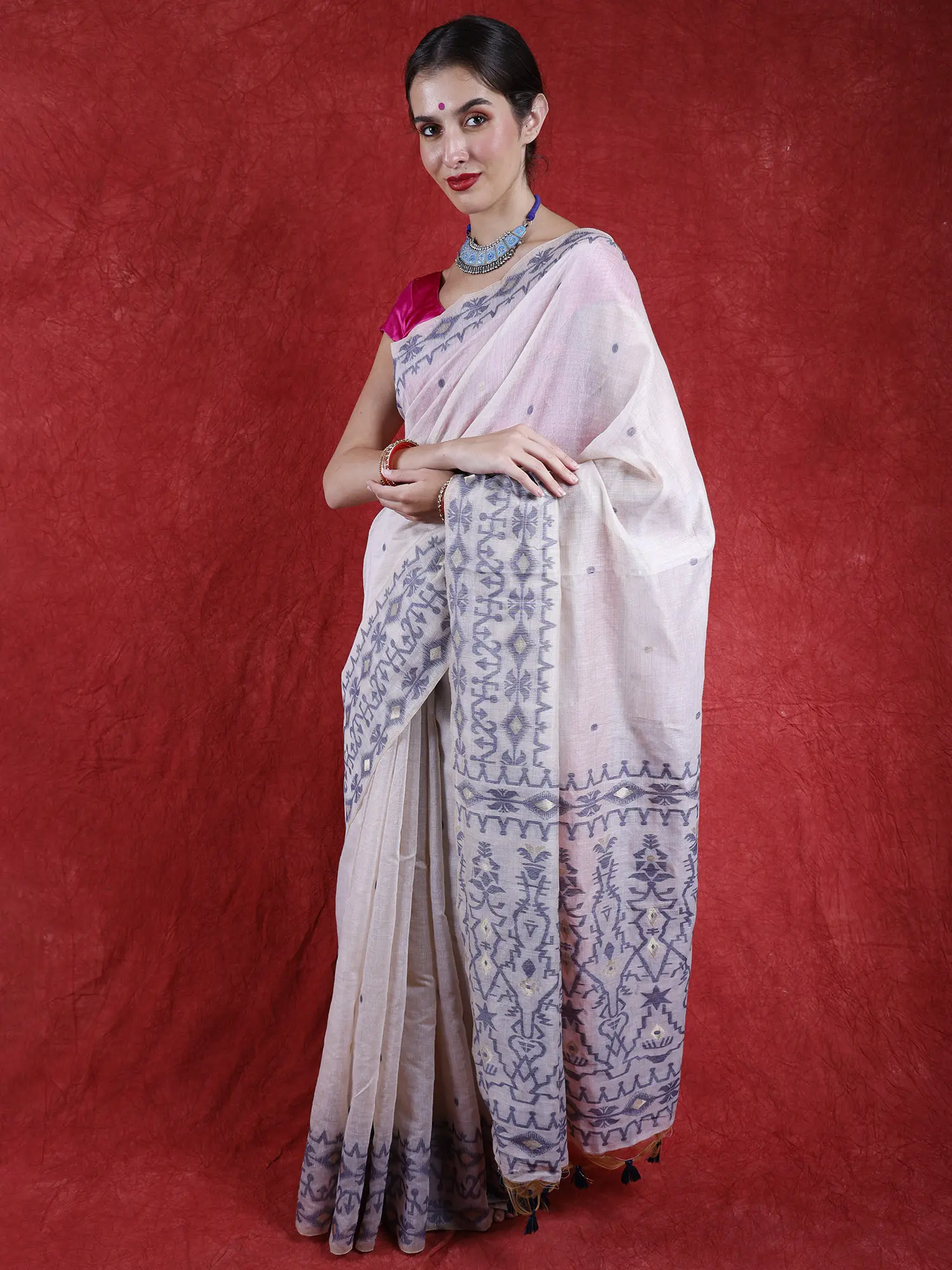 This Authentic Jamdani Saree from Bangladesh, meticulously woven by hand, stands as the epitome of timeless elegance and craftsmanship. Its intricate weaving technique and fine detailing showcase the mastery of traditional artisans, preserving centuries-old weaving traditions. Each thread tells a story of heritage and culture, making every saree a unique masterpiece.