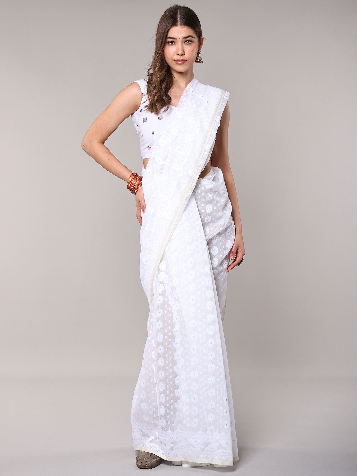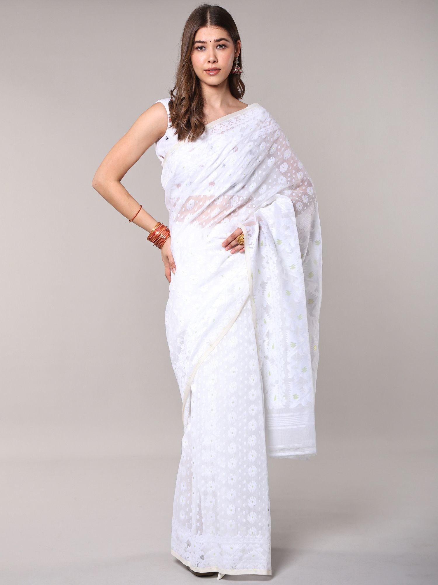 Experience the exquisite craftsmanship of a handwoven Jamdani saree.