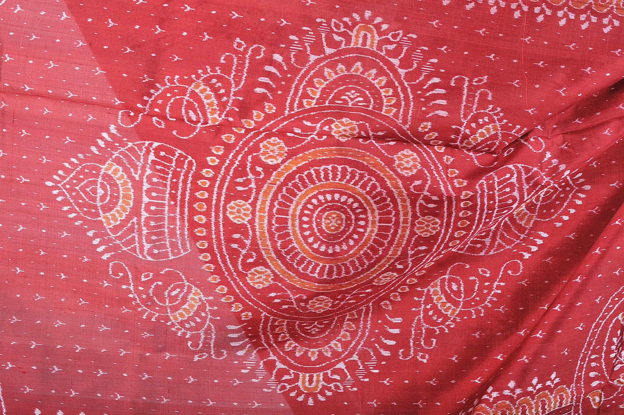 Drape yourself in the rich tapestry of Indian tradition with this exquisite pure silk Sambhalpuri saree, a masterpiece hailing from the culturally vibrant state of Orissa. This saree is not merely an garment; it's a wearable work of art, meticulously crafted with the ancient and intricate Ikat weaving technique. The striking "Autumn Glaze-Red" hue evokes the warmth and beauty of the fall season, making it a perfect choice for celebrations, special occasions, or when you simply desire to exude an aura of refined elegance.