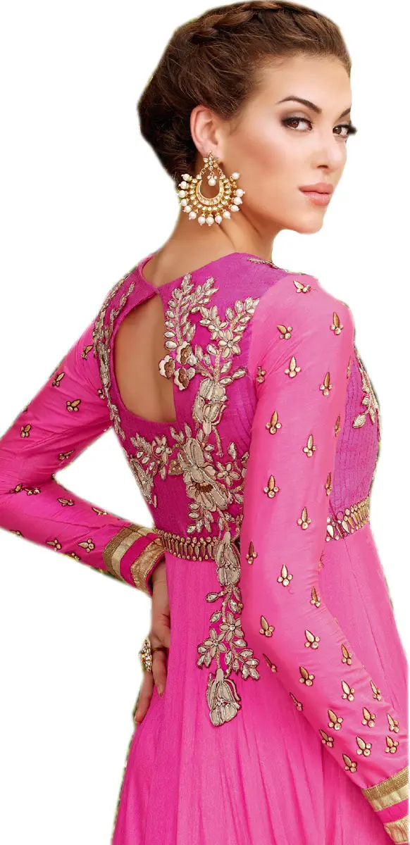 Dark-Blue and Pink Floral Embroidered Long Parallel Salwar Suit with Applique Flowers and Net Border