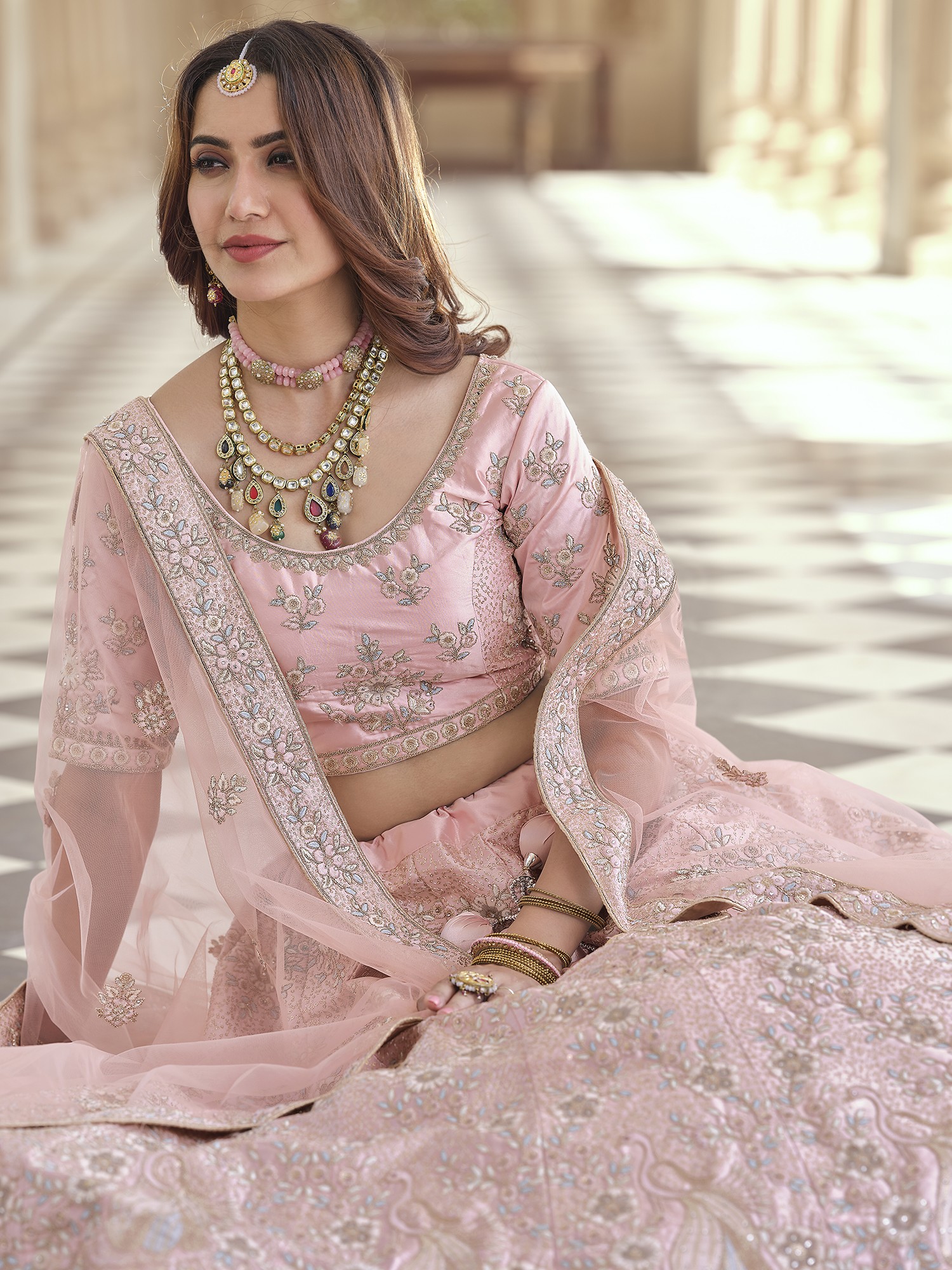 Light-Pink Soft Net Thread Embroidered Lehenga Choli with Sheer Dupatta