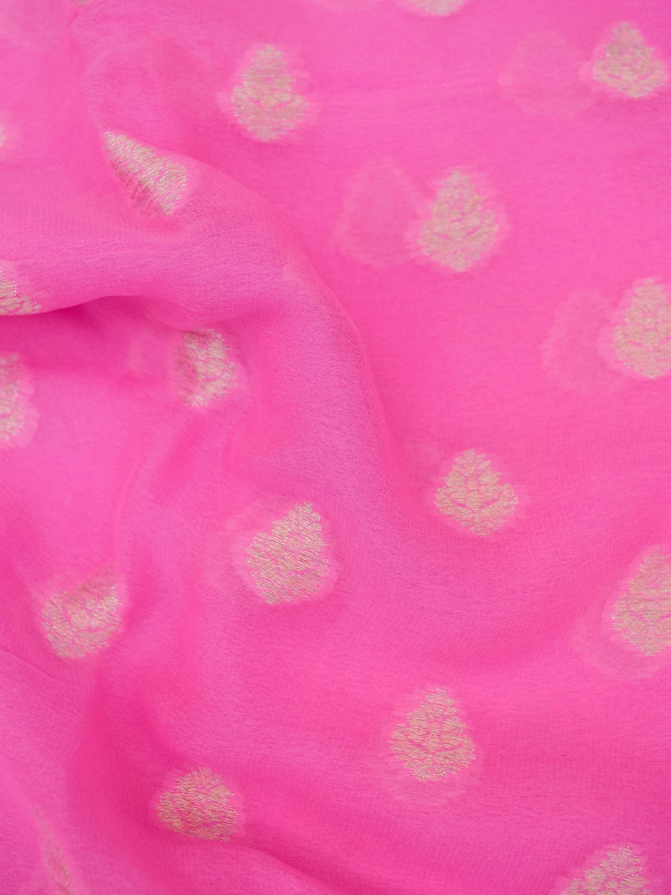 The dreamy hue of the saree makes it feminine and graceful attire, which is beautified by the ethnic magic of Buta motifs created with shimmering silver Zari to complement the pink fabric.