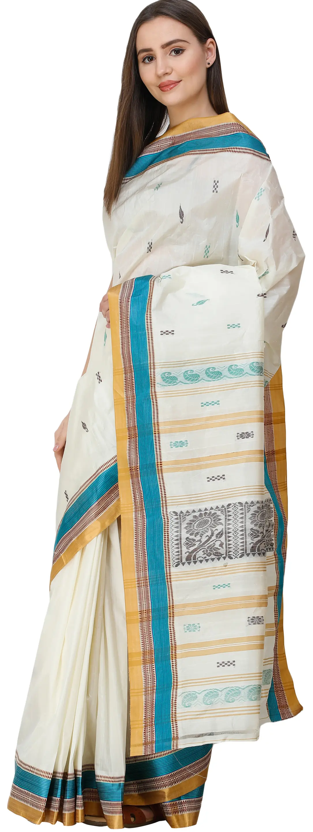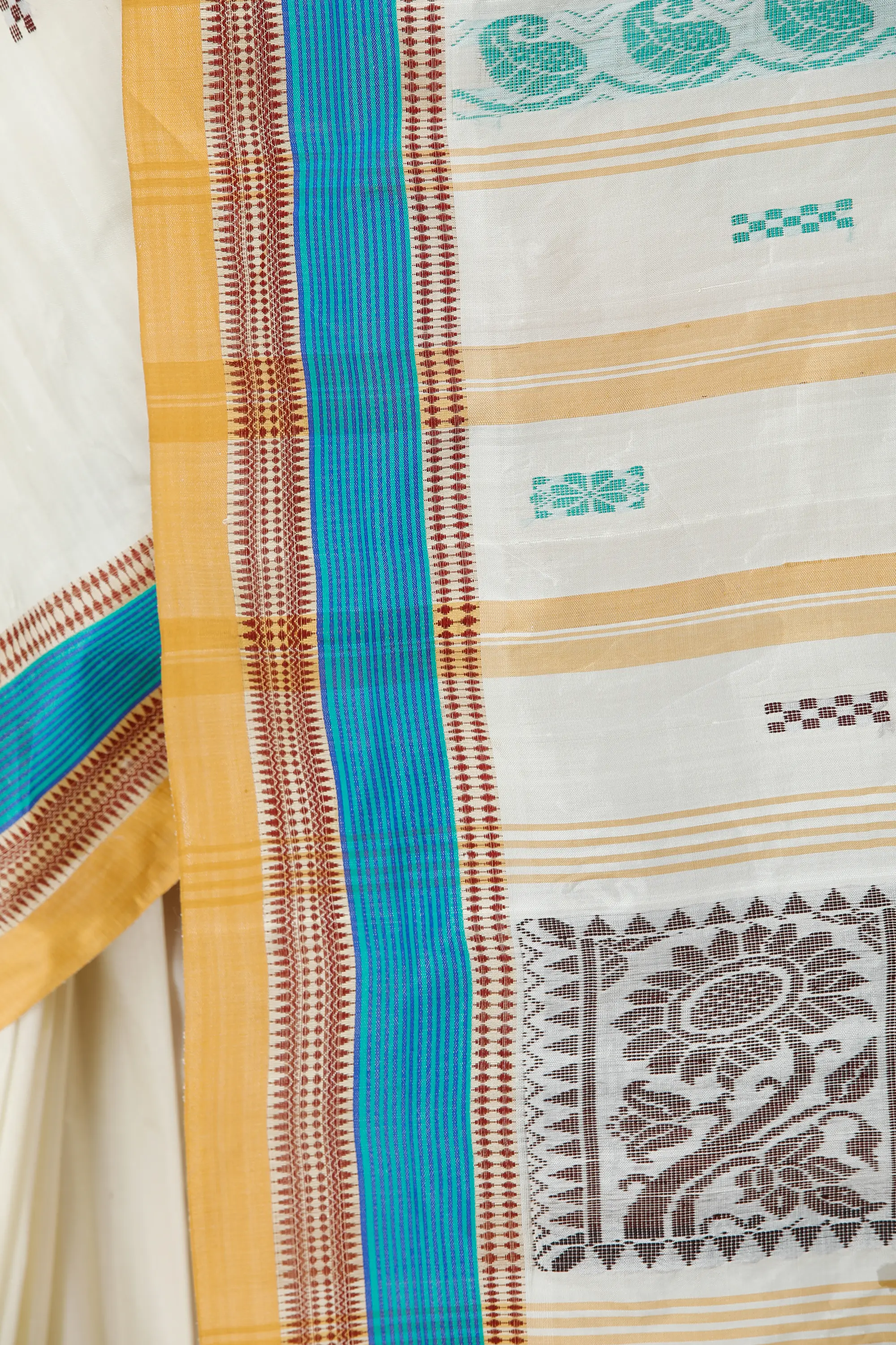 The banana-cream Garad Saree from Bengal is a testament to the opulence of silk. Its light color adds to its elegant charm, making it a coveted choice for special occasions. This sari features a woven pallu and a golden border that exudes sophistication. What truly elevates this masterpiece is the classic embroidery in hues of blue, yellow, and green. These intricate details breathe life into the rich fabric, adding a layer of priceless beauty. When draped, the sari transforms the wearer into a vision of grace and tradition, celebrating the timeless artistry of Bengali silk weaving and the vibrant hues of its culture.