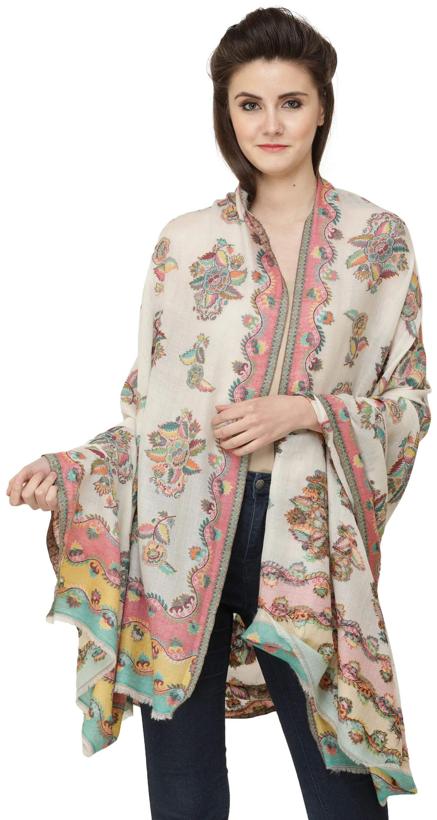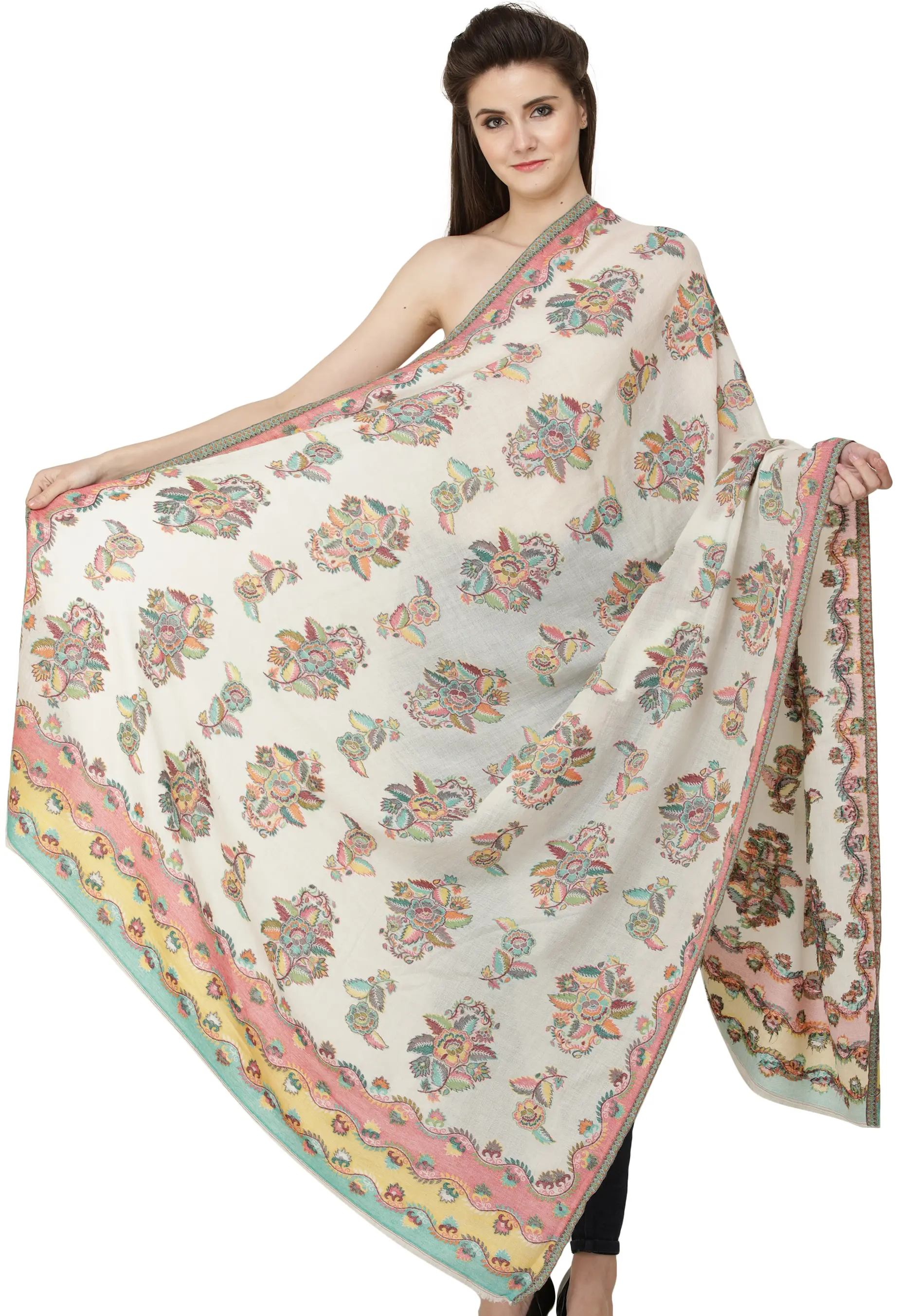 Pure Pashmina Kani Shawl with Heavily Multicolor Sozni Hand-Embroidered Paisleys and Flowers