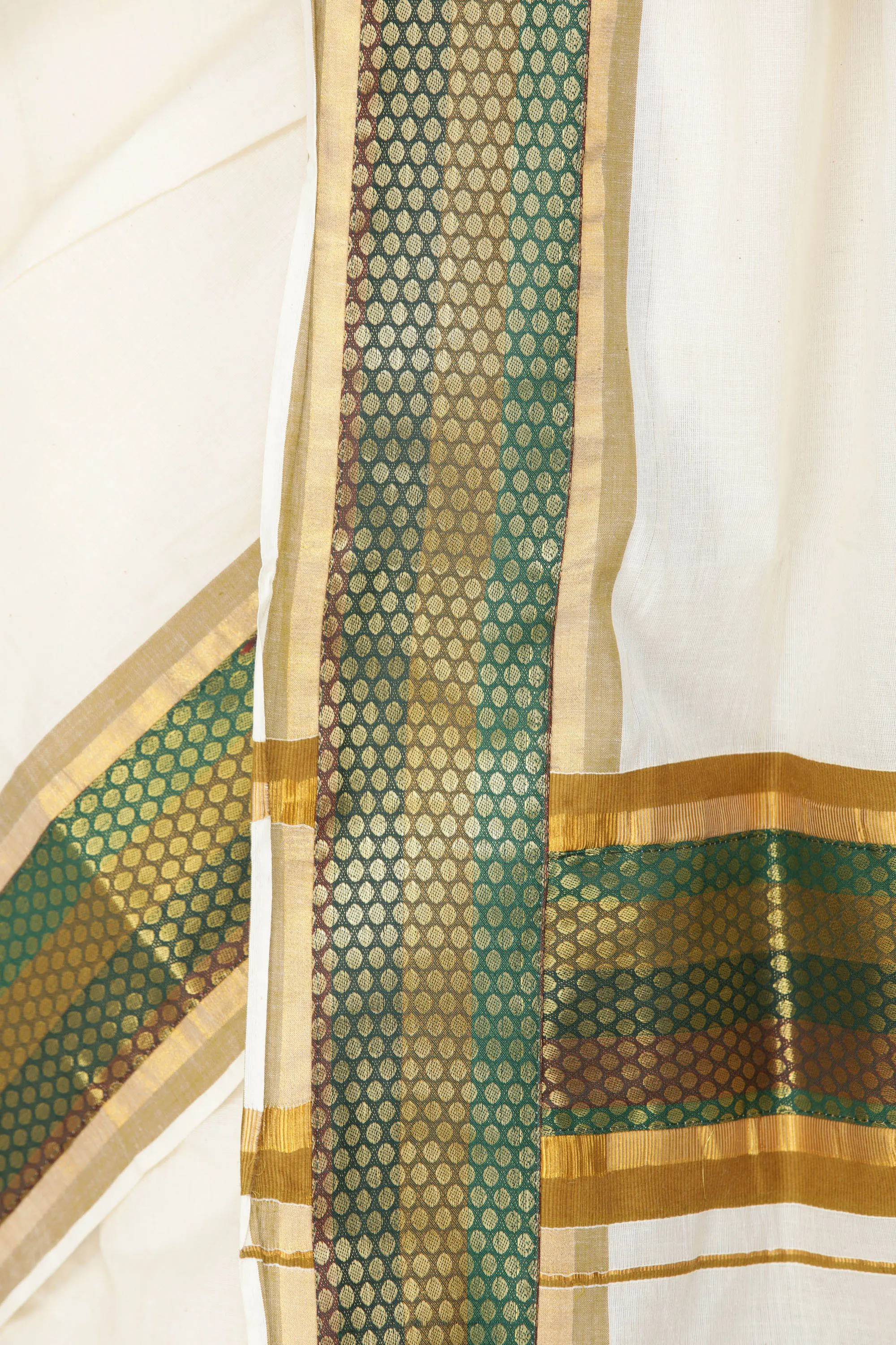 The defining feature of this sari is its beautifully woven Zari border. The traditional Kasavu, typically in gold or cream thread, is elevated here with the addition of vibrant green and gold hues in the bootis, creating a rich tapestry of patterns. These small, ornate motifs, known as "bootis," are woven into the fabric using Zari, a type of metallic thread that lends a luxurious sheen and adds a touch of opulence. The distinct patterns, reminiscent of traditional motifs, are meticulously handcrafted, showcasing the skill and dedication of Keralan weavers. The broad pallu and the complementary border along the length of the sari create a captivating visual appeal, ensuring you stand out with grace.