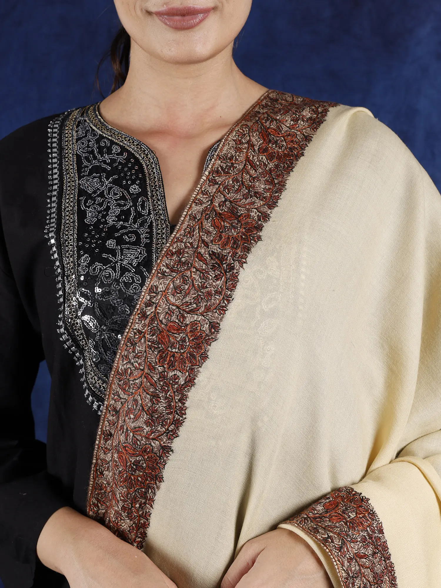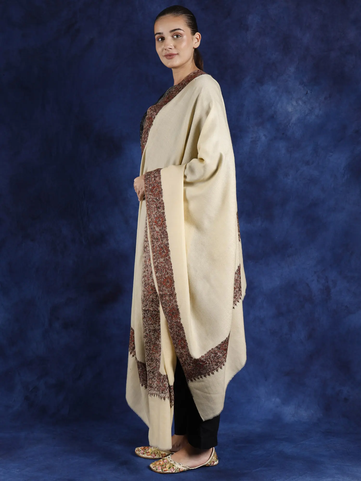 Pure Pashmina Natural Color Sozni Border Shawl from Kashmir