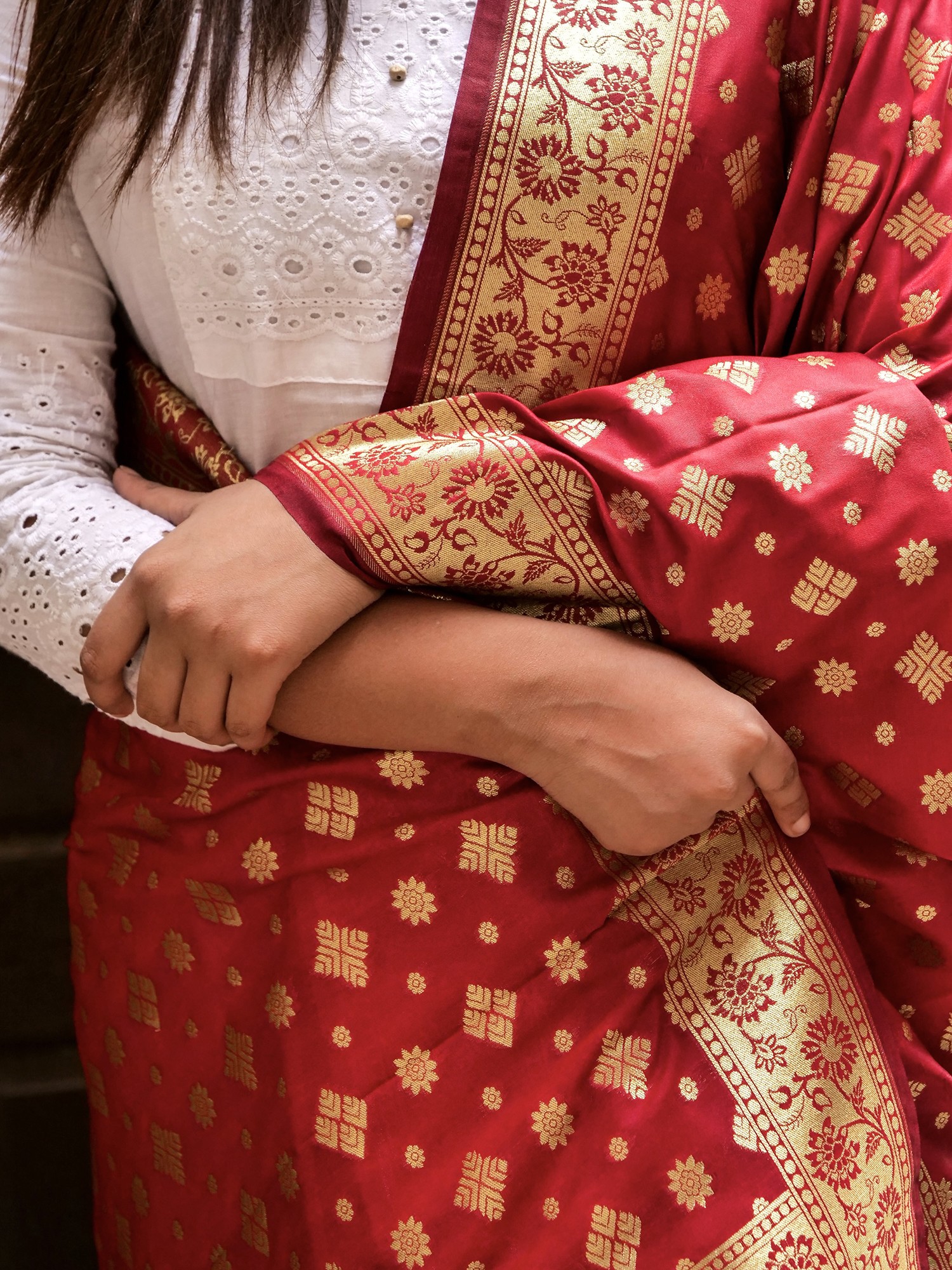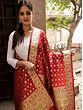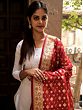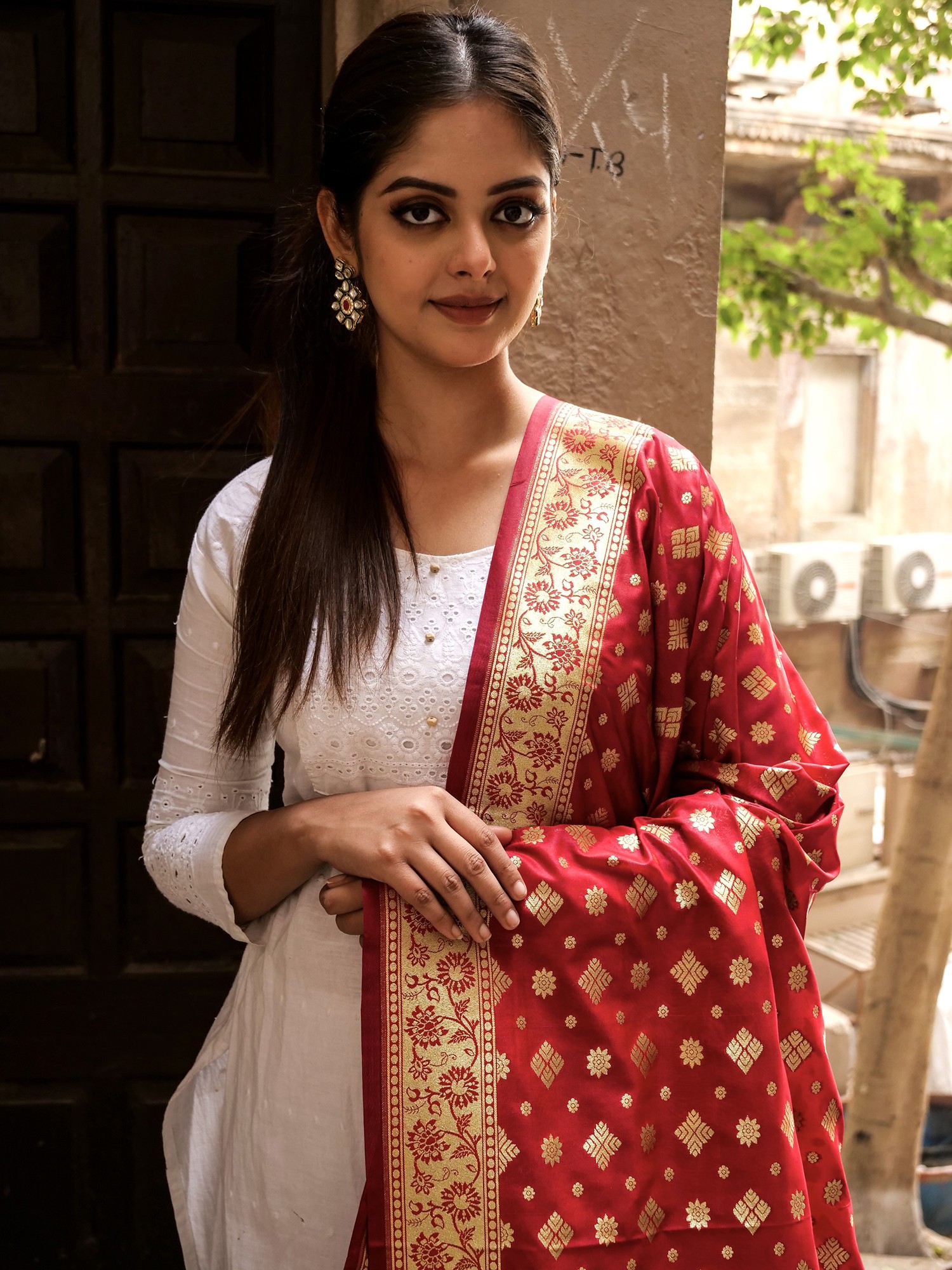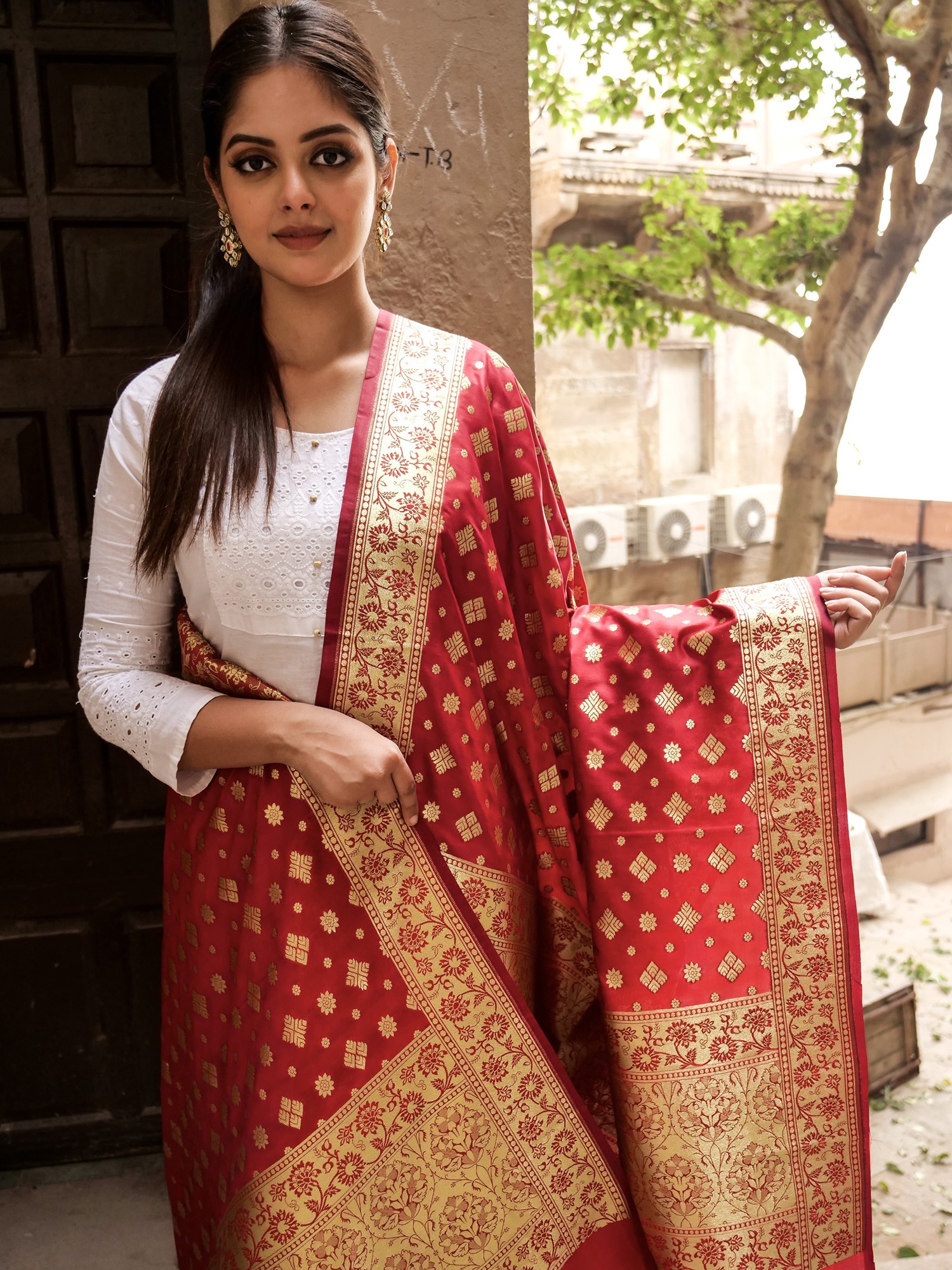The Banarasi Dupatta, resplendent with its All-Over Chakra-Chowkadi Butta and Vine Pattern Broad Border, is a celebration of Banaras' artistic heritage. Every inch of this masterpiece tells a story of tradition and timeless craftsmanship. The Chakra-Chowkadi Butta pattern, like intricate medallions, adds an air of regal elegance, while the vine pattern's broad border frames it with a touch of exquisite charm. This dupatta is not just a piece of fabric; it's a canvas of history and an embodiment of the enduring appeal of Banarasi artistry, ready to enhance any ensemble with its graceful presence.
