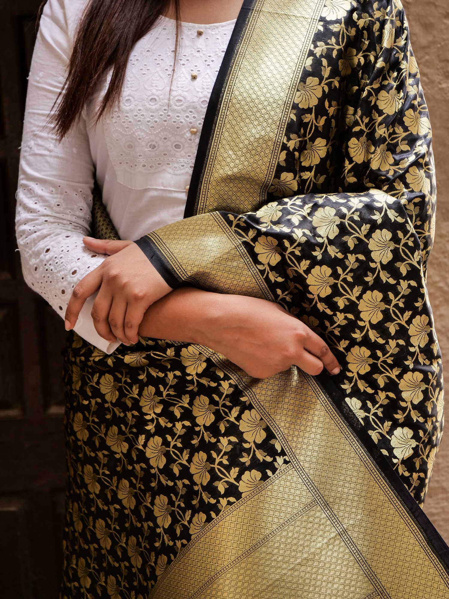 Crafted in the heart of Banaras, the Banarasi Dupatta is a testament to the artistry of tradition and elegance. Adorned with an intricate All-Over Woven Jimsonweed Floral Vine Motif and a regal Diamond Pattern Border, it tells a story of heritage and grace. Each thread woven into this exquisite fabric reflects the timeless beauty of nature, with the Jimsonweed floral vine motif crafted with meticulous care. The diamond pattern border adds an extra layer of sophistication, elevating its overall allure. This dupatta isn't just a piece of fabric; it's a living tribute to the skilled craftsmanship of Banaras weavers, ready to enhance every ensemble with its exquisite charm and cultural richness.