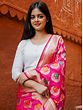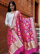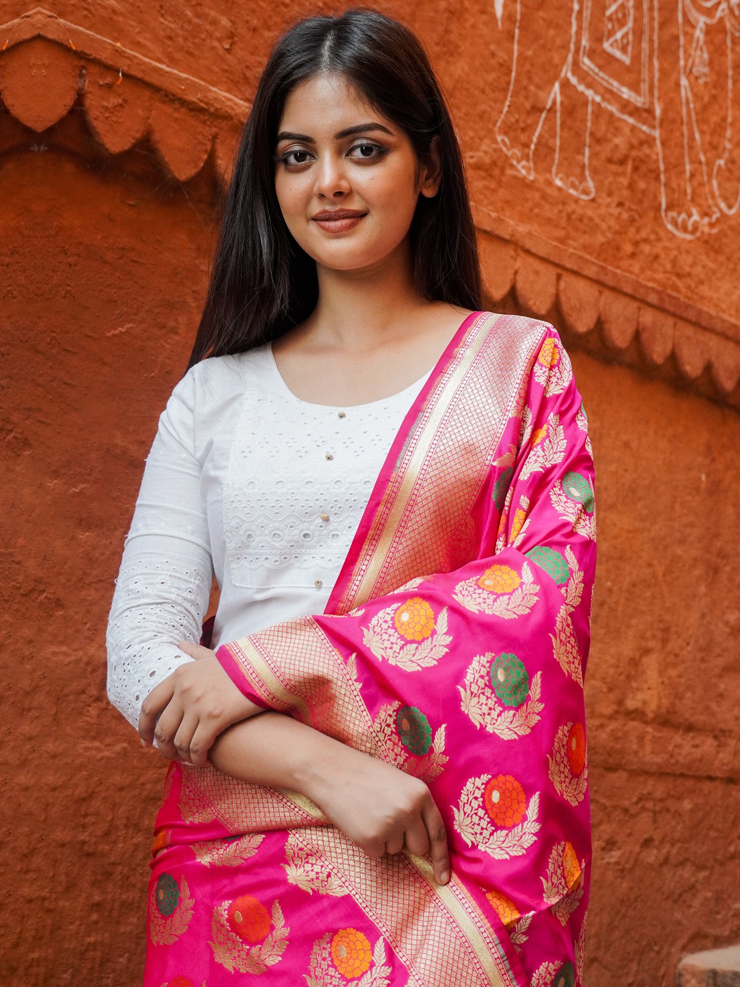 Elevate your style with our Banarasi Dupatta, a masterpiece from the heart of Varanasi. Crafted with precision by skilled artisans, it features a Floral Bouquet Meena Motif, a design deeply rooted in Banaras textile heritage. The opulent zari border adds a touch of elegance and richness. The vibrant colors and intricate craftsmanship make it a statement piece. This Dupatta seamlessly blends tradition with modern fashion trends, showcasing the timelessness of Banarasi artistry. Wrap yourself in luxury and heritage, knowing that each thread reflects the dedication and expertise of skilled weavers.