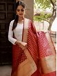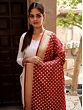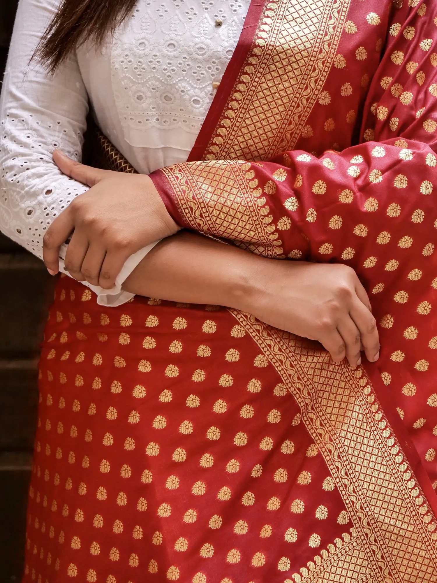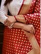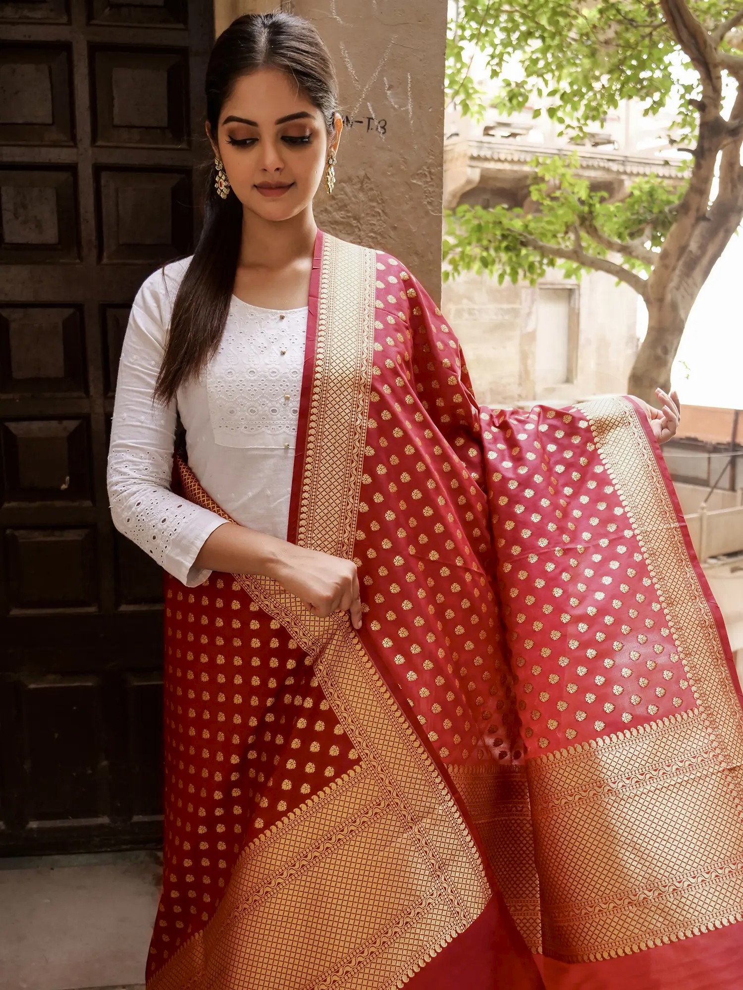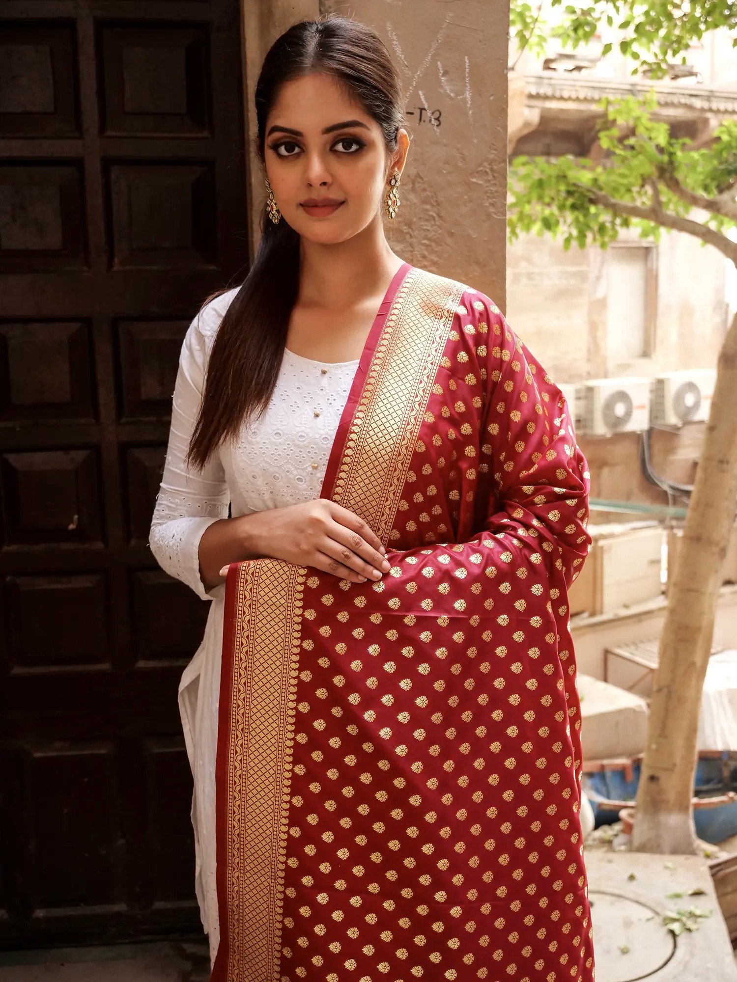 In the heart of Banaras' timeless craftsmanship, the Banarasi dupatta woven with zari and foulard intricate with booti patterns is a treasure trove of artistry. It's as if a piece of history has been woven into every inch of this elegant fabric. Meanwhile, the golden zari weave along the border adds a touch of opulence and grandeur, turning this dupatta into a regal masterpiece. It's not just an accessory; it's a window to the past and a testament to the enduring allure of Banarasi craftsmanship, ready to grace every outfit with timeless elegance.