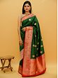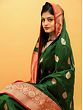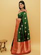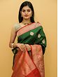 Nature and women in Indian culture are the embodiment of all things auspicious and are revered as life-affirming forces in human life. An ode to the beauty and powers of women, this pure Katan Silk Banarasi Saree is embellished with motifs taken from nature- flowers, floral vines, and butas that match flower bunches. The pairing of red and green on the silk sari is a time-tested one, which is made appealing with the large buta on the green field and the bustling vines on the red border.