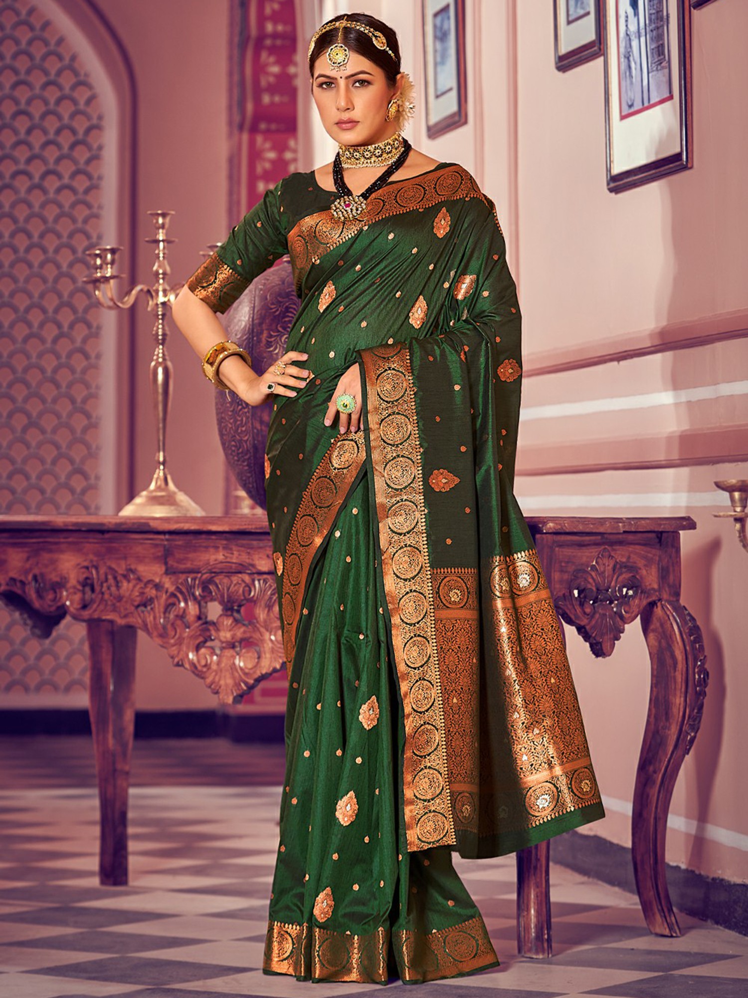 Make grandeur and grace your vibe with this Banarasi saree. Inspired by heritage Banarasi drapes, the saree features an appealing color enriched by exquisite golden butas and an ornate border. The endpiece is a queenly element, covered in a rich floral overlay in a shimmering golden tone, adding luster to every step you take.