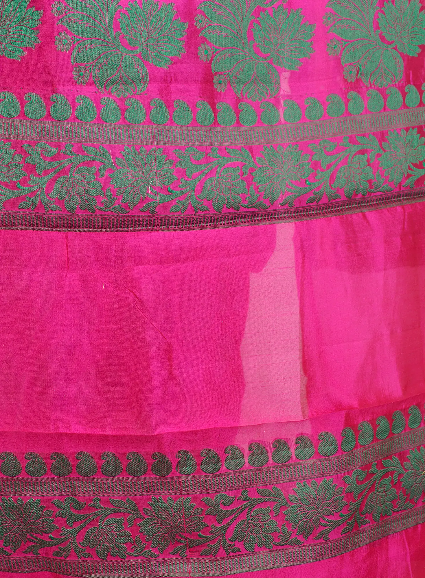 Pink, purple, and fiery orange unite on the canvas of this silk Banarasi sari for a beautiful traditional attire that follows timeless patterns and color choices, confided in by trained weavers to create beauties out of threads. With the use of Resham or silk threads, large Butis are spread all over the field of the saree, which are inspired by the motifs of Mughal architecture. The saree's border is decorated by a flowing vine delineated in purple. On the pallu of the saree, you can see fine silk threads which are cut at the end of the embroidery process, leaving a trail of untied thread ends, telling us that this piece was hand woven meticulously.